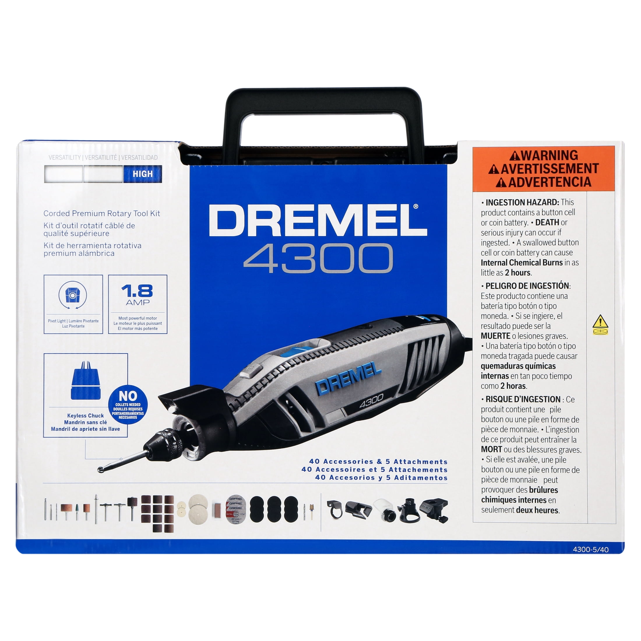 Dremel 4300-5/40 Corded Variable Speed Rotary Tool with 5 Attachments, 40 Accessories & Dremel Soft Case, 1.8A/120Volts