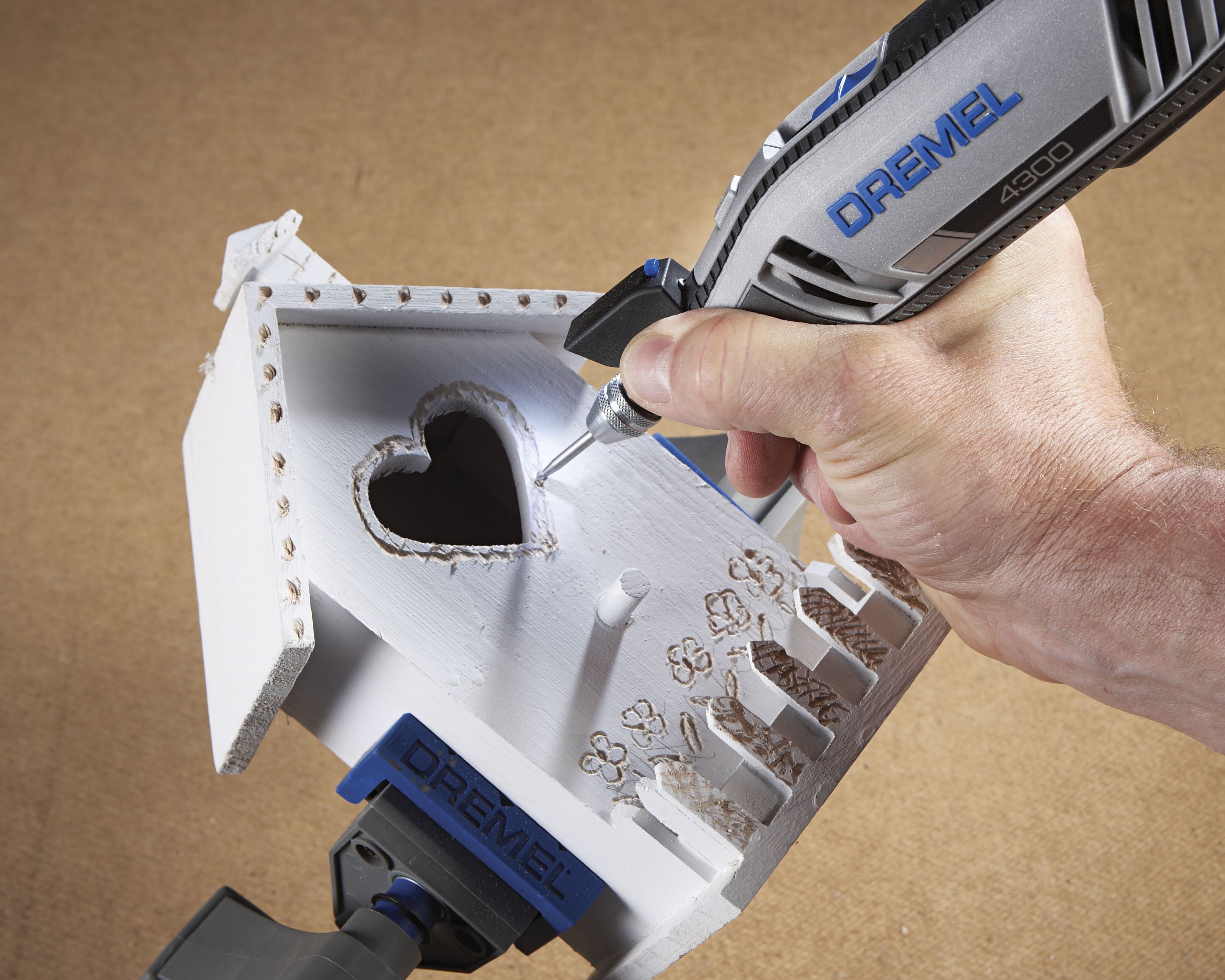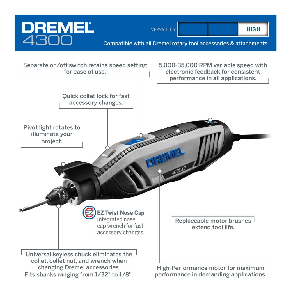 Endless possibilities, one tool. From sanding to grinding, and routing to cutting; the Dremel 4300 produces power from job to job. The 4300 is the first Dremel rotary tool to allow tool-less and collet-less accessory changes with the inclusion of the keyless chuck. The chuck accepts all Dremel accessory shank sizes for fast and convenient accessory changes without ever using a wrench. Featuring the all new Pivot Light, your projects are well-lit with an optimum line of sight since the light pivots to direct illumination where you want it. Experiencing the full range of Dremel rotary tool applications is easier than ever because the 4300 offers a powerful motor with built-in variable speed and electronic feedback circuitry. And the slim, ergonomic body design provides a comfortable 360-degree grip zone no matter how you hold it for extended ease of use. This variable speed rotary tool is a wood engraver, metal engraver, glass engraver and etcher, detail sander, drill bit sander, and a micro drill. Tackle any engraving job with the multi-surface Dremel 4300 Versatile Rotary Tool Kit.