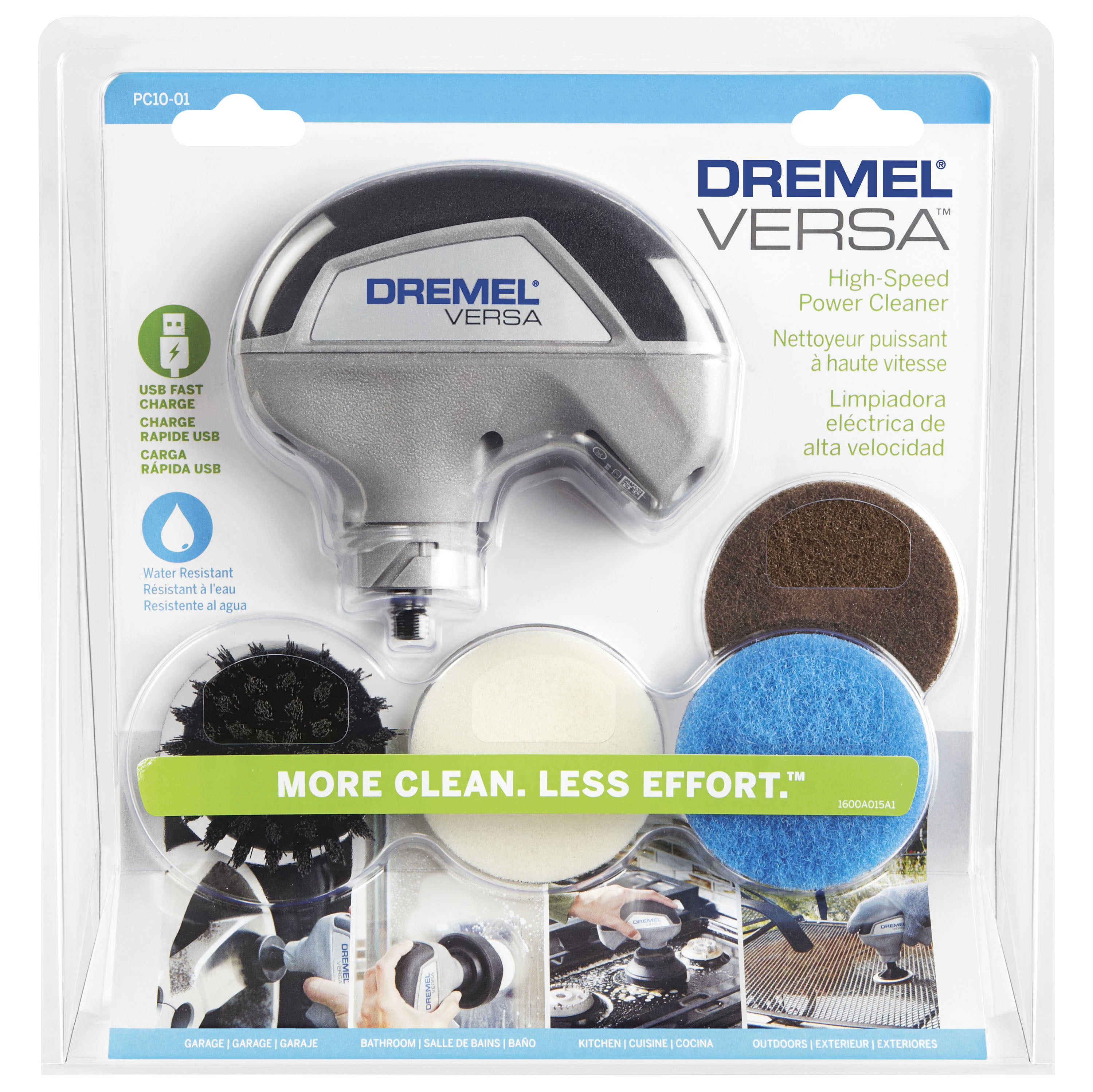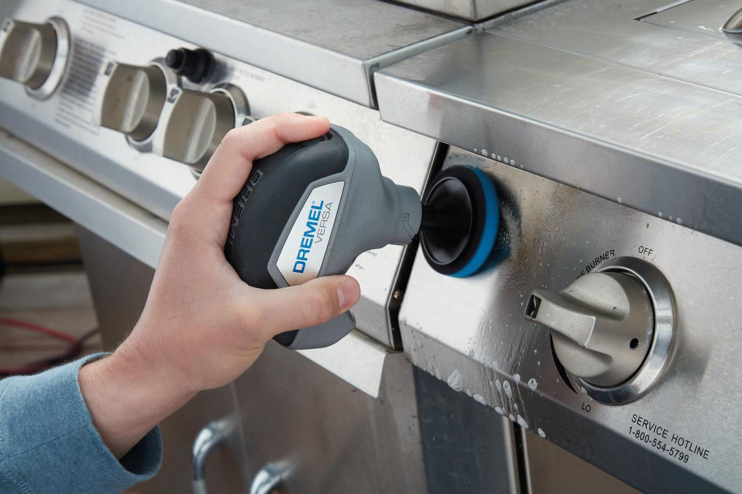 Tough cleaning jobs are a thing of the past with the powerful and versatile Dremel Versa. High-speed scrubbing, in a compact size, is ideal for tackling soap scum, baked on food, difficult grease, dirt and much more. The Lithium-Ion battery charges fast and is perfect for indoor and outdoor, dry and wet uses. The light-weight and compact design is ideal for single hand use and to tackle hard to reach places. Accessories changes are fast with the hook and loop interface. Switch from tile to glass, or upholstery to metal in no time, and use the Dremel Versa with or without water and cleaner based on the application.