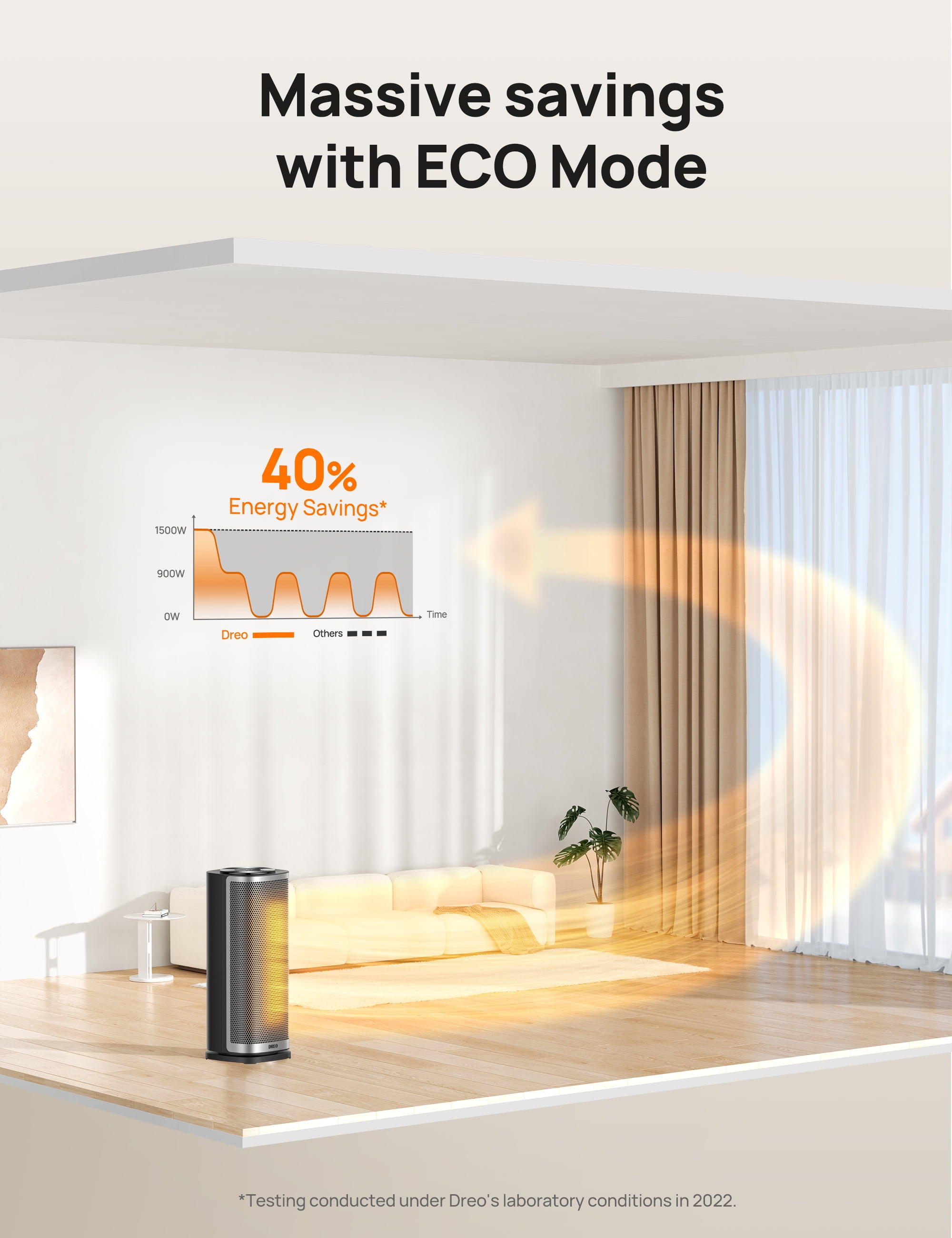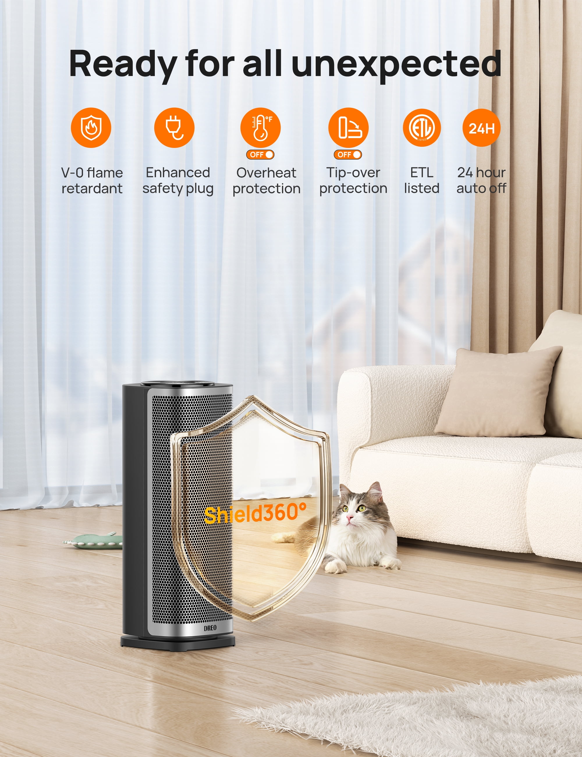 DREO Space Heater Series—America’s Home & Garden Best Brands of 2022* *Based on Newsweek’s 2022 America’s Best Brands ranking. Dreo Portable 1500W Fast Ceramic Space Heater. Solaris Slim H2 —–Remarkably Fast. Surprisingly Quiet ☀️ Up to 75°F in 2 Seconds Get the warmth 10% with Dreo’s Hyperamics technology. 1500W high power transforms your cold room to a hot spot with high-speed heating at up to 9.77 ft/s. Heating Coverage:Up to 200 sq.ft.. ☀️ Warmth That Surrounds 70° wide-angle heating warms up your room in more widespread directions. 2023 upgraded outlet was fine-tuned 20° downward so the heat travels a longer way, ideal for large rooms like offices, bedrooms and living rooms. ☀️ Protected by Shield360° Dreo’s Shield360° system provides tip-over and overheat protection, as well as 24-hour auto off protection. Made with V-0 flame-retardant materials, this ETL-listed space heater also has a bend-proof safety plug that ensures ultimate safety at home. ☀️ More Peaceful Winter Days Ultra-quiet heating delivers calm, cozy warmth that eases your mood throughout the day, with noise as low as 37.5 dB, much quieter than a library. ☀️ Huge Savings on Energy With 5 modes (1500W/900W/700W/ECO/Fan Only), you’re allowed to tune the heat as you like to save more on energy bills. In ECO Mode, you can define the exact heat you desire from 41 to 95°F in 1°F increments. ☀️ Easy Touch, Easy Carry More precise temperature display on the panel and more handy control from the remote. Hidden carry handle at the back makes this portable heater effortless to carry and store whenever needed. Washable, Detachable Filter and Carry Effortlessly. Cord Lenth: 6 ft / 1.8 m