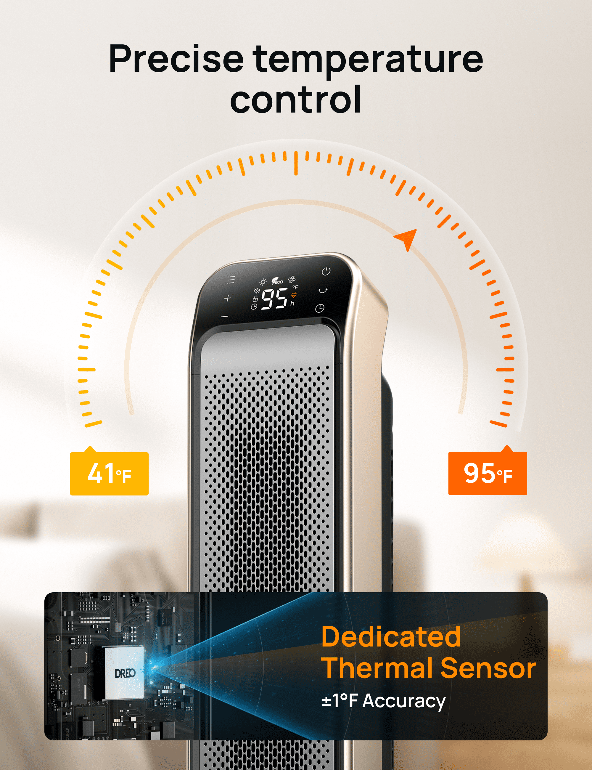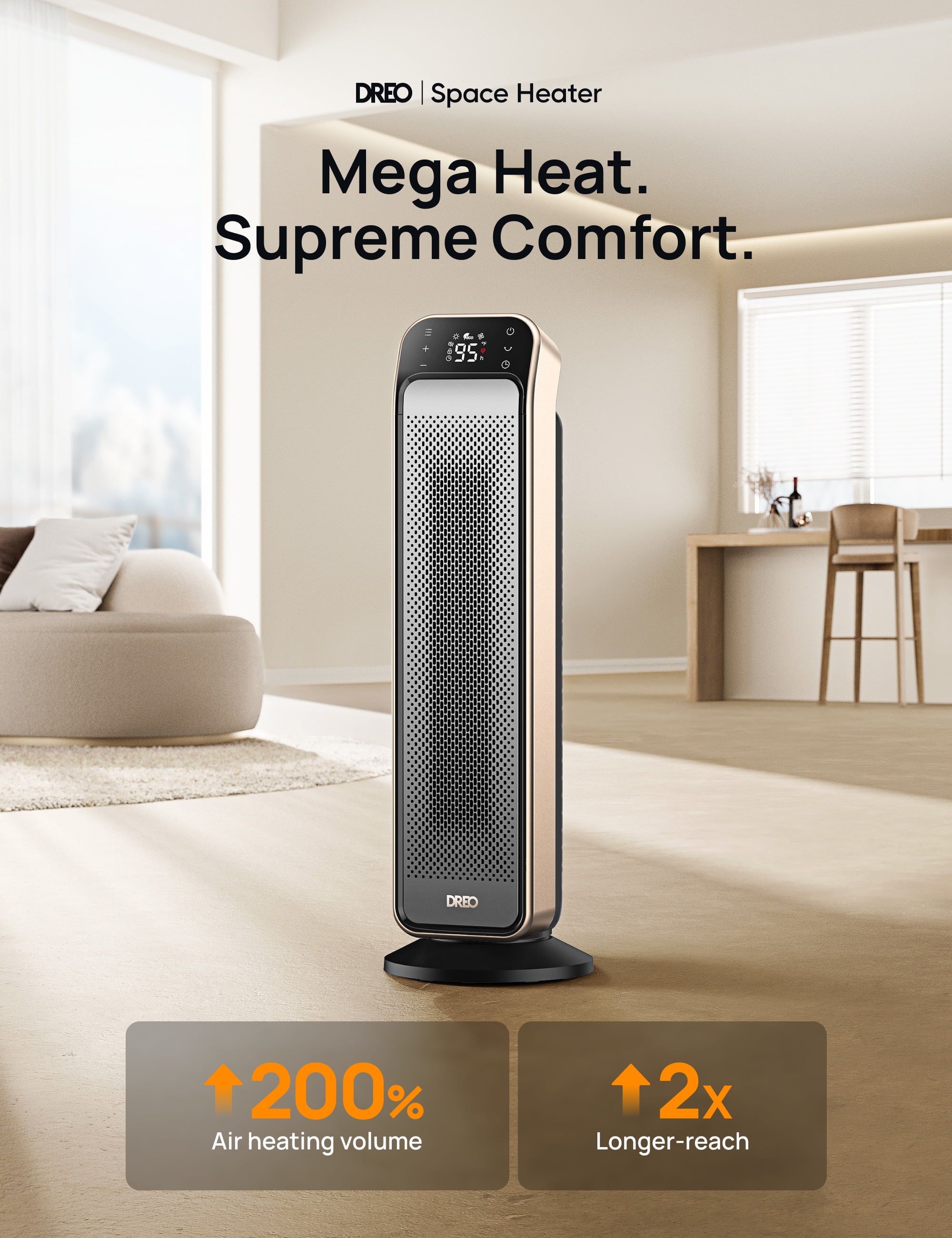 ☀️ The Ultimate Heating Experience Dreo’s upgraded 25″ ceramic space heater brings 12.5 ft/s fast heat thanks to its new hyperamics thermal design, while the extended impeller doubles the heat range making it the ideal space heater for large rooms and warmer winters. ☀️Unbreakable Safety This room heater for indoor is fully packed to safely warm up your winter. Built with V0 flame retardant material, reinforced plug, 45° tip-over and overheat protection certified by ETL. An additional child lock setting reduces the risk of accidents, making safer to heat and more secure to use. ☀️ Warm Your Nights in Absolute Quietness Dreo’s new airflow design brings down noise as low as 32dB, making this space heater for bedroom an ideal option to blow a comfortable warm air quietly, and enjoy a quiet, disturbance-free office or a good night’s sleep. ☀️ Precise Temperature Control Set room temperature with more accuracy than ever before, this space heater with thermostat uses a dedicated thermal sensor to gauge the room temp and adjust heating automatically in ECO Mode, temperature can be set between 41-95°F with 1°F precision for ideal comfort. ☀️ Expanded Heating Capabilities Bring warm air to every corner of your room. This portable space heater with 70° Wide Angle oscillation can easily cover areas of 100-270 sq ft. Choose from four heating modes (H1/H2/H3/ECO) according to your needs, and even use it as a fan to circulate the air when the room is too hot. ☀️ Intuitive Design, Seamless Lifestyle Dreo’s portable space heater blends seamlessly into your lifestyle. Its LEDs lights re designed to automatically make the screen and buttons bright and easy to see in daylight, or dim to ensure uninterrupted sleep during bedtime, and its remote control, carrying handle and bottom power cord storage makes it easy to control or move around the house.