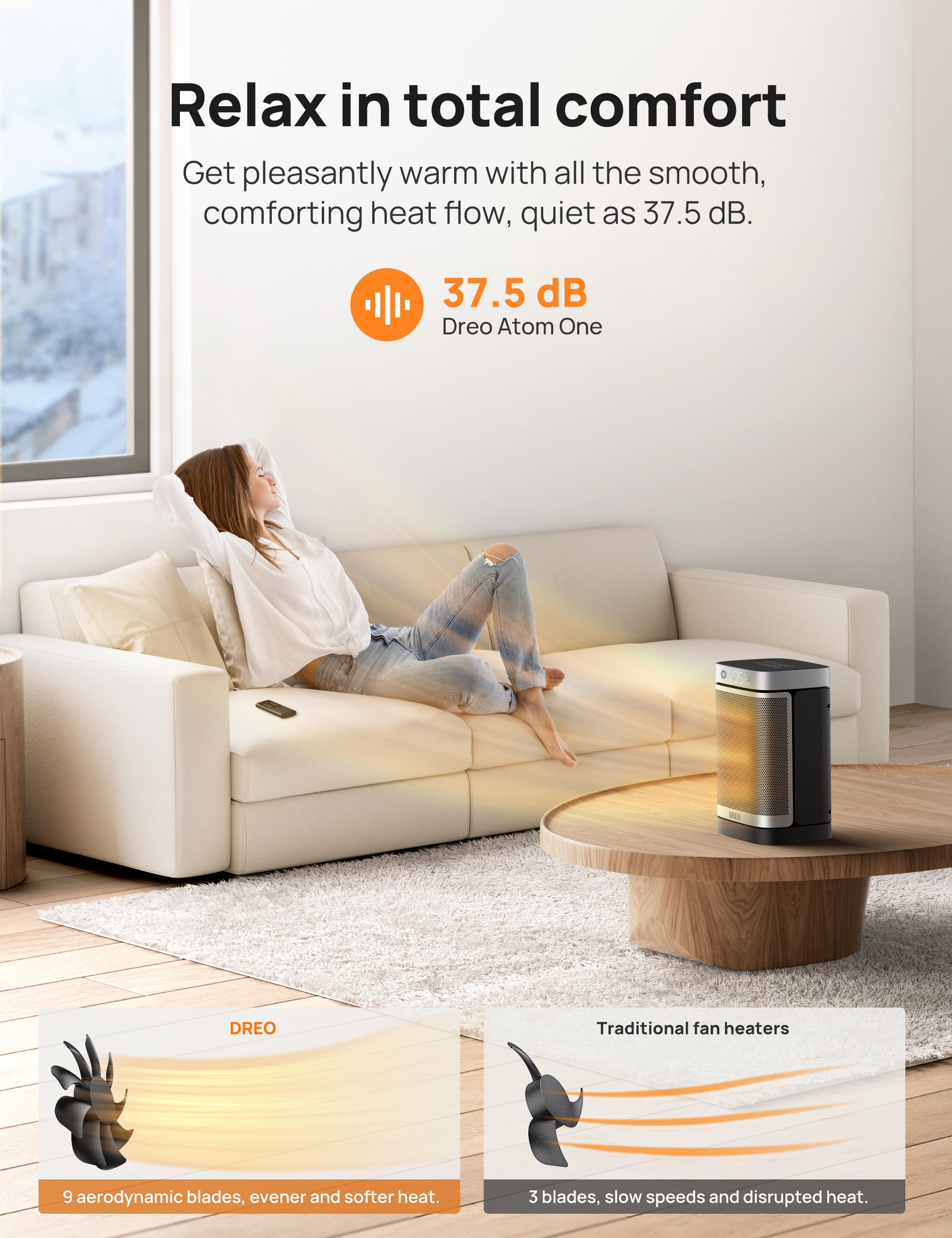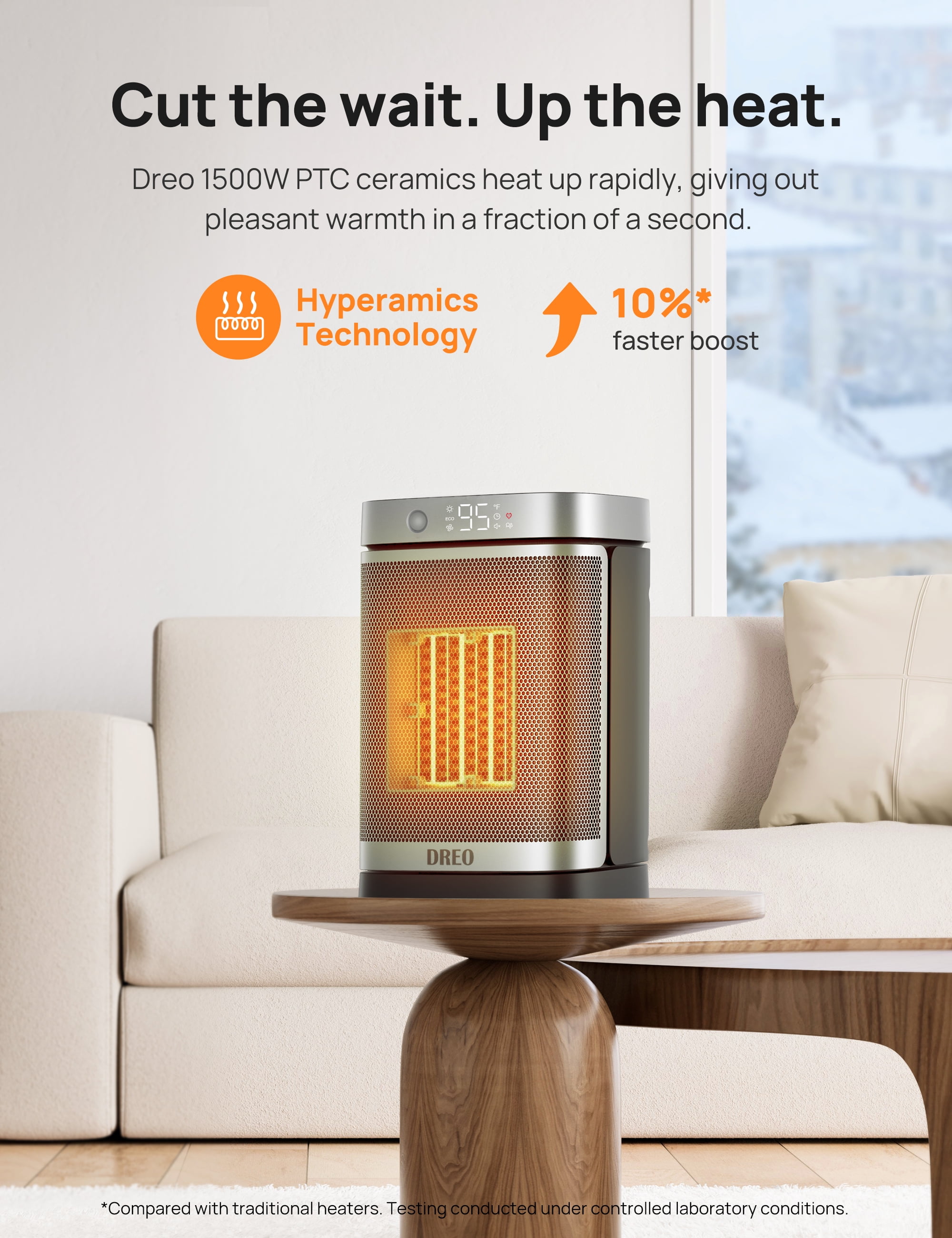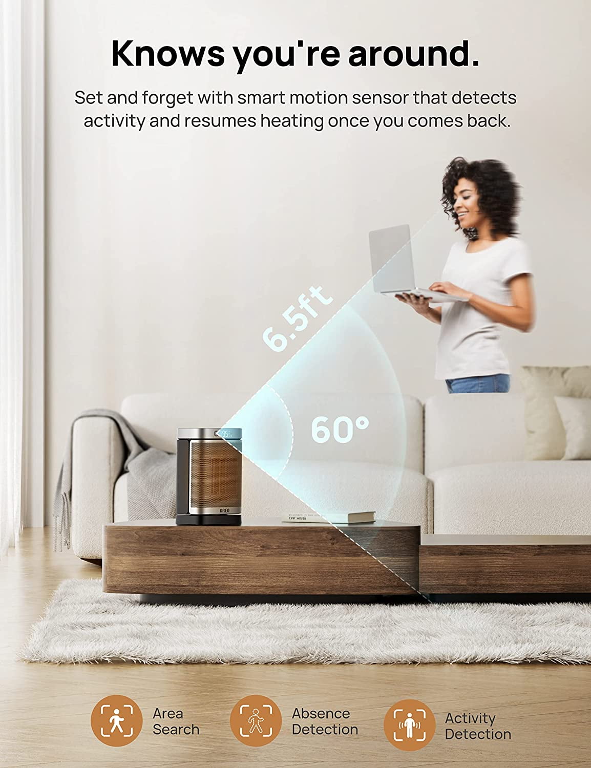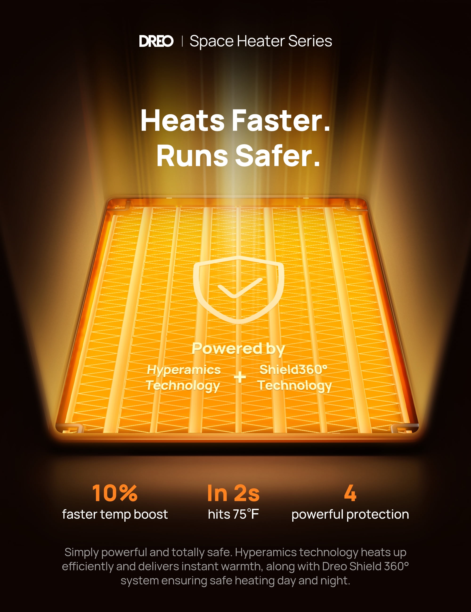 DREO Space Heater Series—America’s Home & Garden Best Brands of 202 *Based on Newsweek’s 2022 America’s Best Brands ranking. Dreo Portable Oscillating Ceramic Space Heater Keep the chill all day, get warm anytime, anywhere Heats Only When Needed No need to turn on and off your small space heater again as you come and go. Smart motion sensor detects your presence and heats only when you’re around. Focus on what truly matters while saving more on energy bills on cold winter days. No More Waiting Dreo Hyperamics technology heats up efficiently and hits 75℉ at once, along with a powerful motor that drives 9 high-speed blades to deliver all-around, pleasant warmth faster than one can imagine. Always Safe, Always Protected Thanks to the Shield360° system, this ETL-listed indoor space heater features overheat and tip-over protection, UL94 V-0 flame-retardant materials, and an enhanced safety plug—all ensure ultimate safety in all aspects. More Comfort & Convenience Customize your own climate with 41-95℉ digital thermostat, 1-12h timer, 70° wide-angle oscillation, and more heating modes for you to choose. Get yourself warm and cozy with Power Heat Mode that heats powerfully or ECO Mode that cuts your heat bills. Breathtakingly Quiet Built-in energy-efficient brushless DC motor makes this electric heater run more quietly and friction-free. With noise as low as 36.5 dB, you’re about to enjoy all the warmth and peace throughout the winter.
