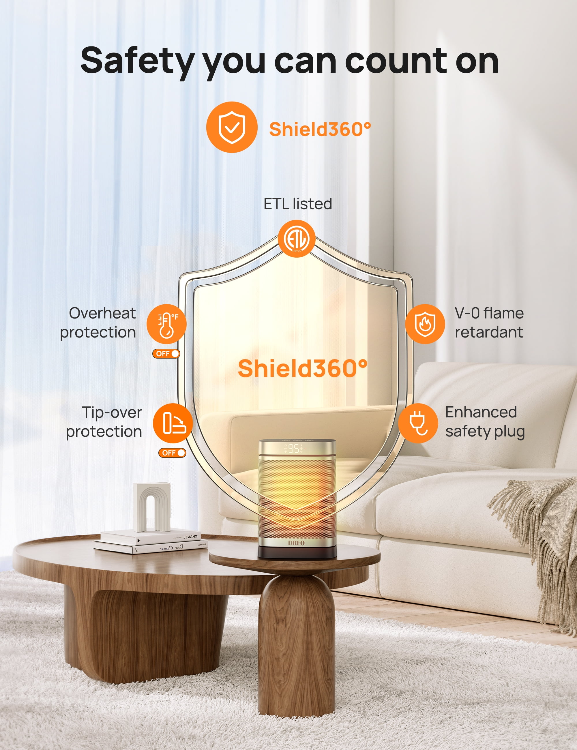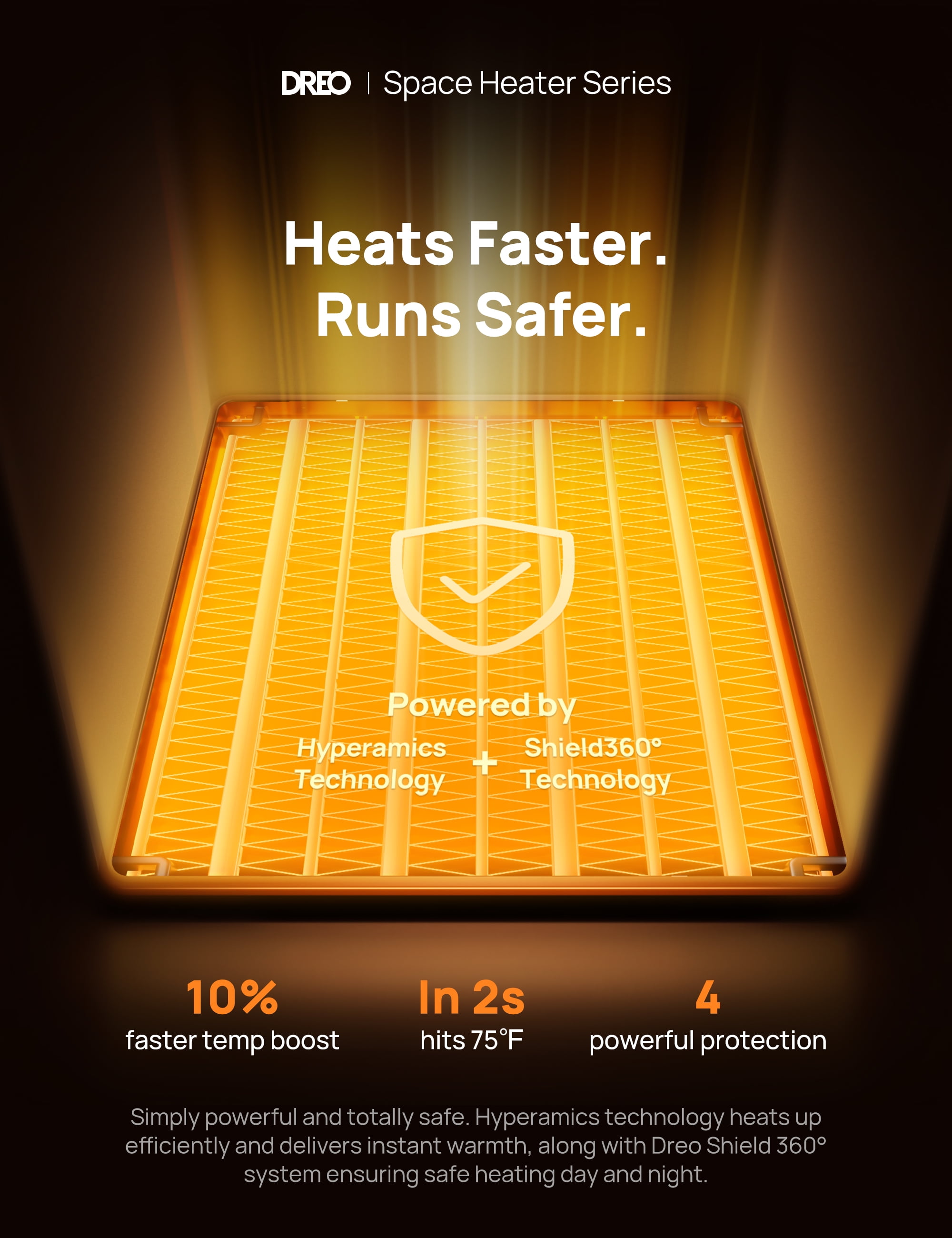 Dreo Space Heater, powered by Dreo Hyperarcs Technology, the electric heater heats up more efficiently with up to 1500W working power and can heat up to 200 square feet. DREO Space Heater Series—America’s Home & Garden Best Brands of 2022* *Based on Newsweek’s 2022 America’s Best Brands ranking. Dreo Portable 1500W Fast Ceramic Space Heater — Compact Size. Gigantic Warmth. ???? Faster Heat Than Ever Powered by Dreo Hyperamics Technology, Atom One space heater heats up more efficiently with up to 1500W working power, reaching your desired temperature immediately, letting you feel fast, balmy heat straight away. This portable heater is meant to sit by your feet on the floor, near your hands on a desk, or carry around indoors. Add our small heater to your cart & experience our amazing heater and customer service. Heating Coverage:200 sq.ft. ???? Shield360° Protection Heat up your day and night without worries. ETL-listed Shield360° system provides tip-over and overheat protection, as well as an enhanced safety plug. Along with UL94 V-0 flame-retardant materials to ensure ultimate safety in all aspects. ???? Save More on Energy Bills ECO Mode adjusts the heat level automatically to reach your desired temperature while saving more on energy bills. Personalize your own comfort with the digital thermostat from 41 to 95 ℉, adjustable in 1℉ increments. Precise Heat, Precise Comfort. ???? Warm Any Angle Experience the heat that envelopes you in the widest way possible. 70° wide-angle oscillation sweeps around to cover the whole area, providing wide-reaching heat for your bedroom, garage, basement, office, desktop, etc ???? Engineered to be Quieter Brushless DC motor and 9 aerodynamic blades smooth out airflow and eliminate air turbulence, delivering soft, tranquil warmth. As quiet as 37.5 dB, you can sleep or work with peace of mind. ???? Heat the Way You Like With various modes (High/Medium/Low/ECO/Fan Only), the heat comes in many forms, from powerful heat to more energy-saving ECO heat. Dreo Atom One electric heater with remote control easily provides the balance you want between heat and energy saving. ???? Mounting Type Tabletop. This Dreo 1500W room heater is lightweight, you’re able to carry a portable heater whenever you go: space heaters for home, for large room, for inside, living room, bedroom, basement, office and more.