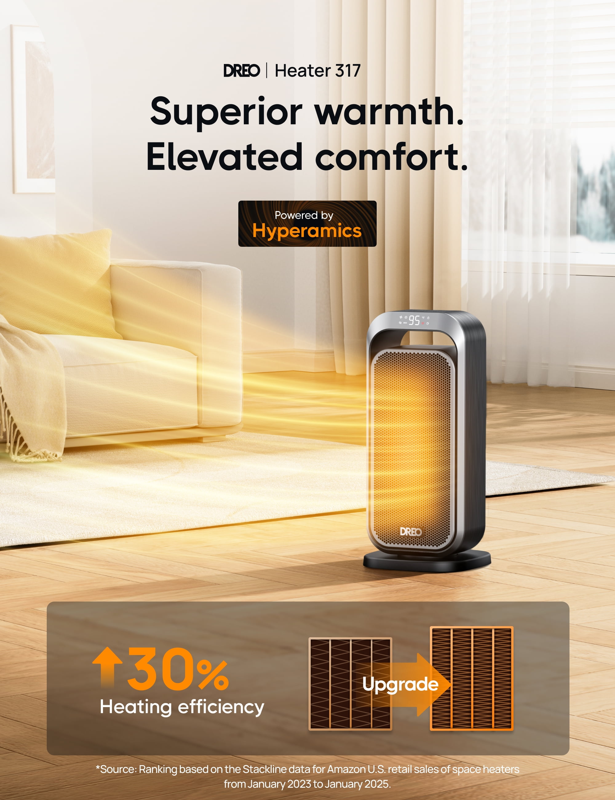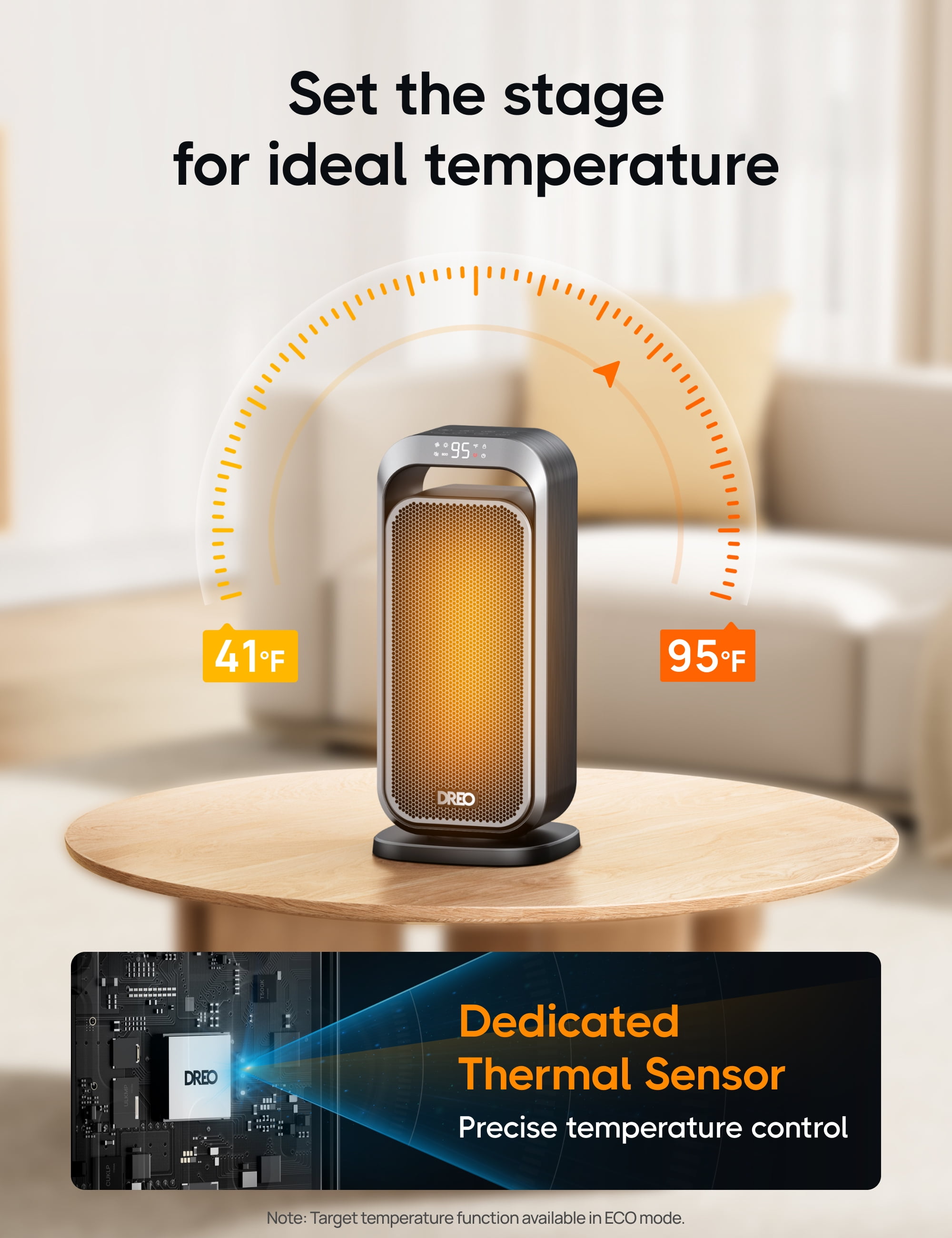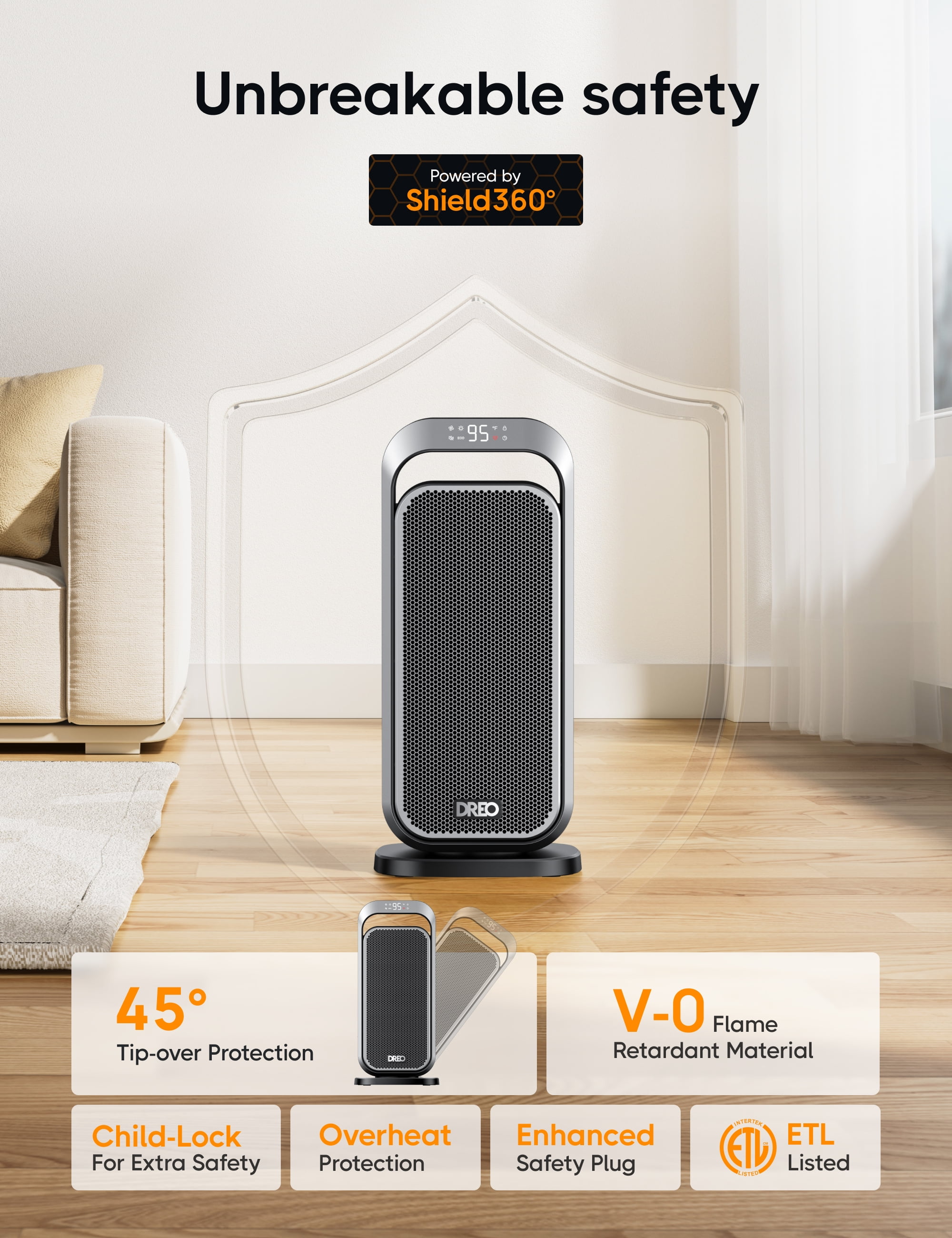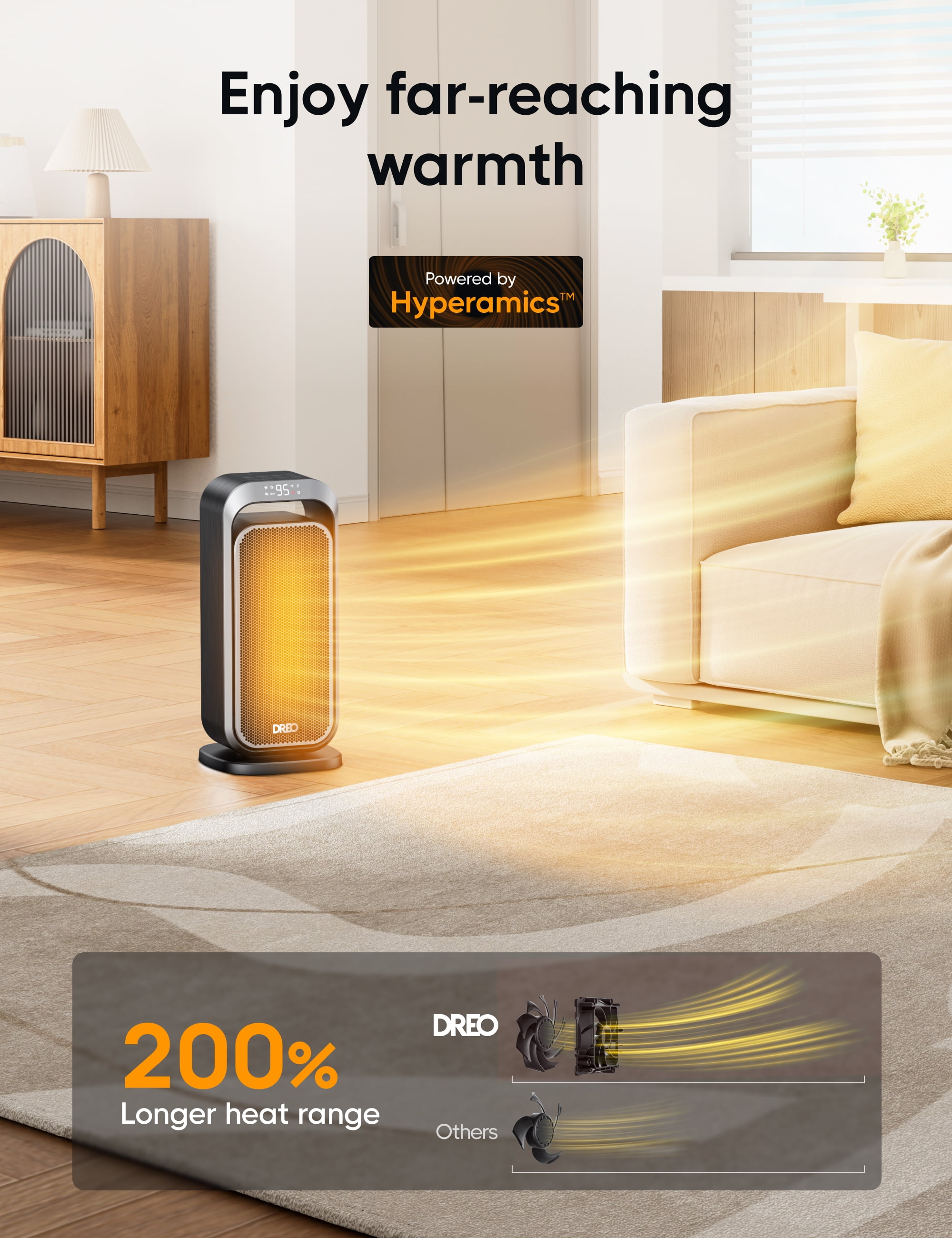 ” DREO—America’s Home & Garden Best Brands of 2022 Based on Newsweek’s 2022 America’s Best Brands ranking. Dreo 15 Inch Portable Space Heater—Superior Warmth. Elevated Comfort. Powerful heat for any space This Dreo indoor space heater utilizes an Hypereamics 1500W advanced PTC system to provide rapid heat delivery and improve the circulation of warm air. Compared to traditional heaters, this Dreo heater can reach areas up to 200% farther, ensuring efficient and widespread heating in an instant. Unbreakable safety The space heater is built with a child-lock, tip-over protection, V0 flame retardant material, overheat protection, and safety plug, all certified by ETL. It provides comprehensive protection for your family, enhancing safety for children, strengthening defences against accidents, and ensuring peace of mind for users. Cozy tranquillity Dreo’s bedroom heater provides whisper-quiet operation, thanks to its brushless DC motor and winglet fan design that minimizes turbulence. Enjoy warmth in serenity and ensure a better sleep, with noise levels as low as 32dB Always at the perfect temperature This electric heater with Thermostat allows you to set your desired heat level within a wide range of 41-95℉ with ±1℉ increments, ensuring precise and efficient heating. This feature not only keeps you comfortable but also helps save energy. Experience even heat distribution Our space heater with a 70-degree oscillation function ensures warmth in every corner of your room. Set the heat flow to your preference, directing it in a specific direction or enjoying broader coverage. Energy-saving Eco mode The Adaptive ECO mode automatically adjusts the heat level to maintain your preferred room temperature, allowing you to stay warm while saving on energy bills. “