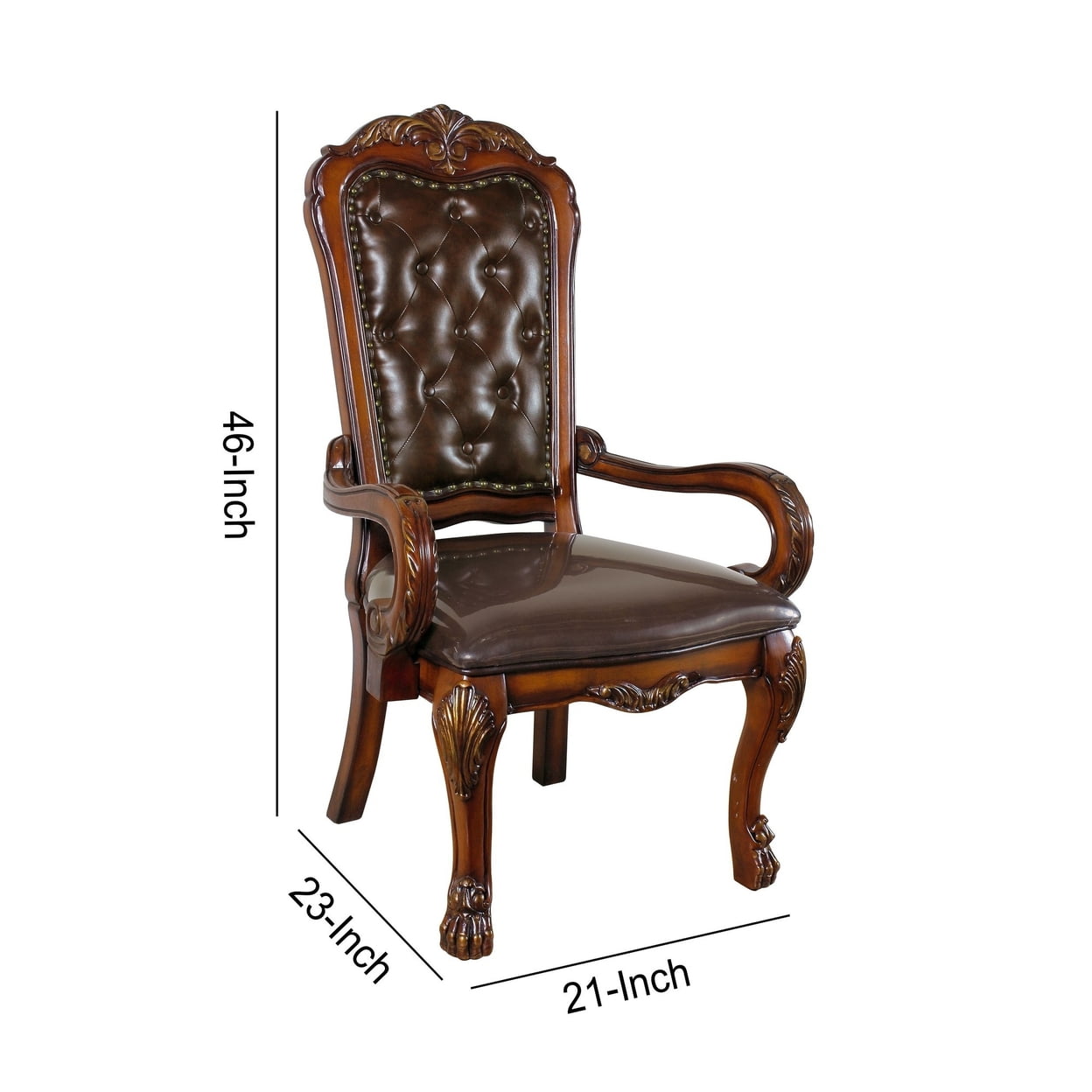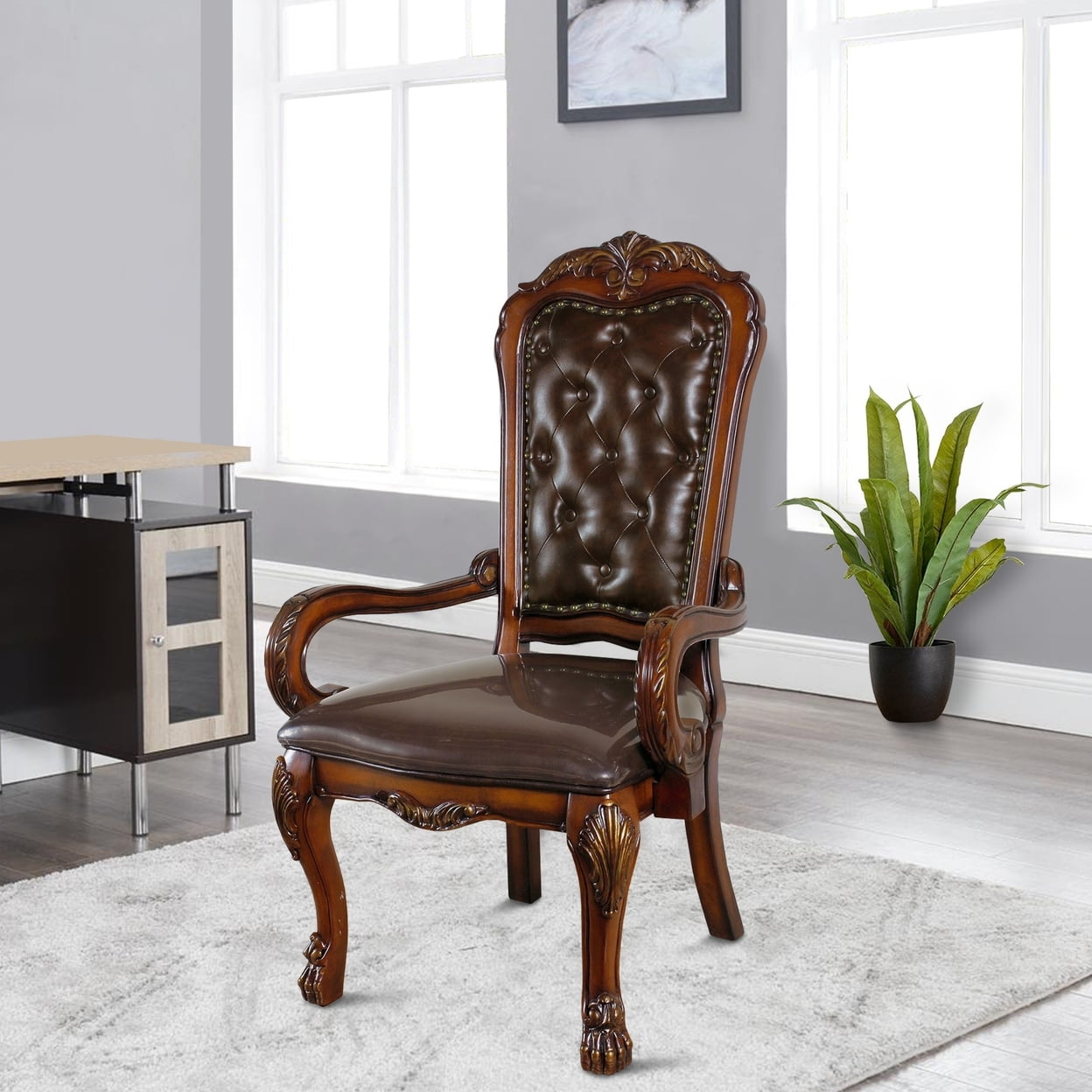 Dresden Executive Chair Cherry Oak – Saltoro Sherpi The Dresden executive arm chair classic style will blend masterfully in your home. Carefully constructed from faux leather selected wood and veneers in rich Cherry Oak Finish. Highly decorative details button tufted backrest claw feet and decorative nail-head trim give this piece an elegant and sleek appeal.