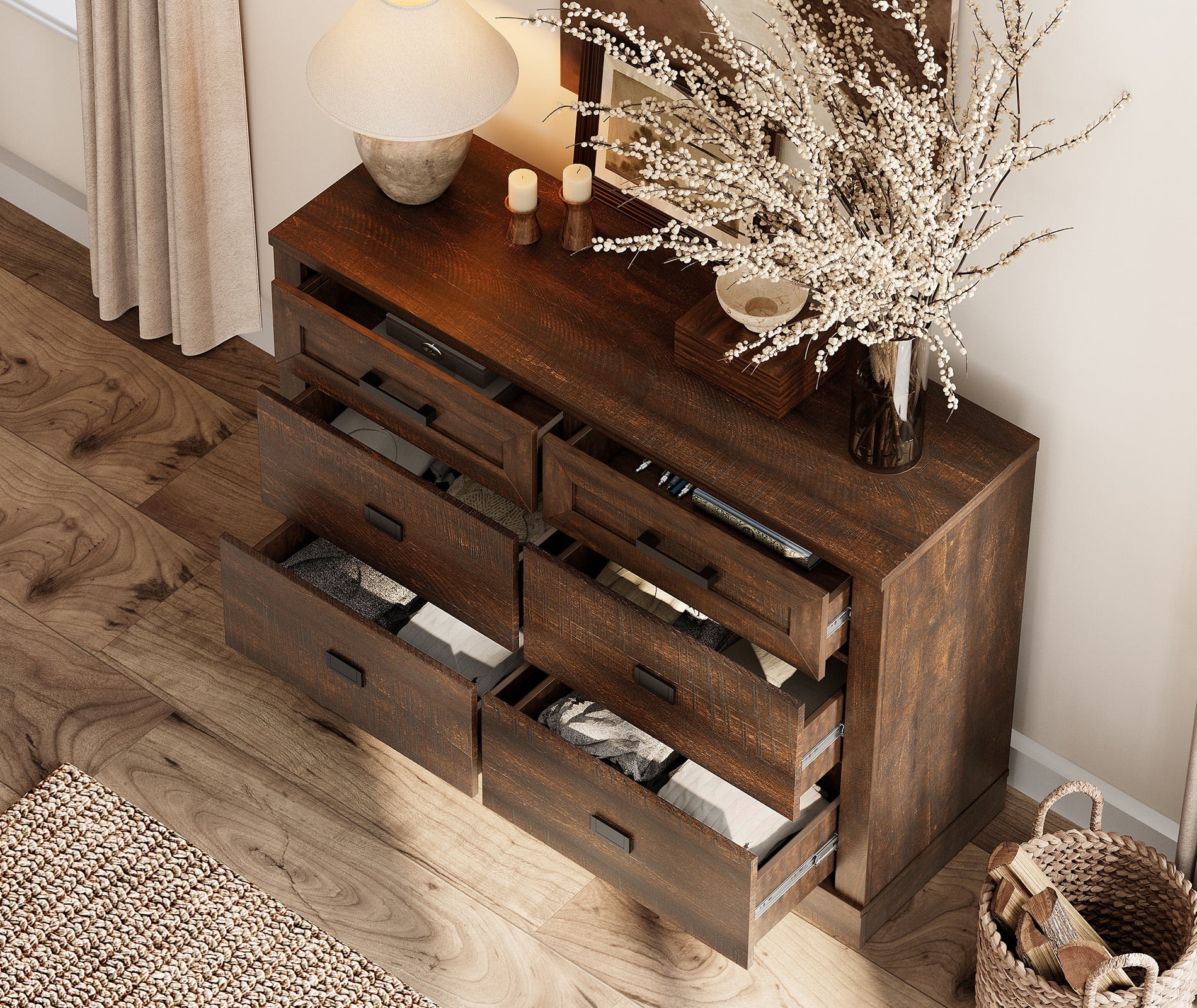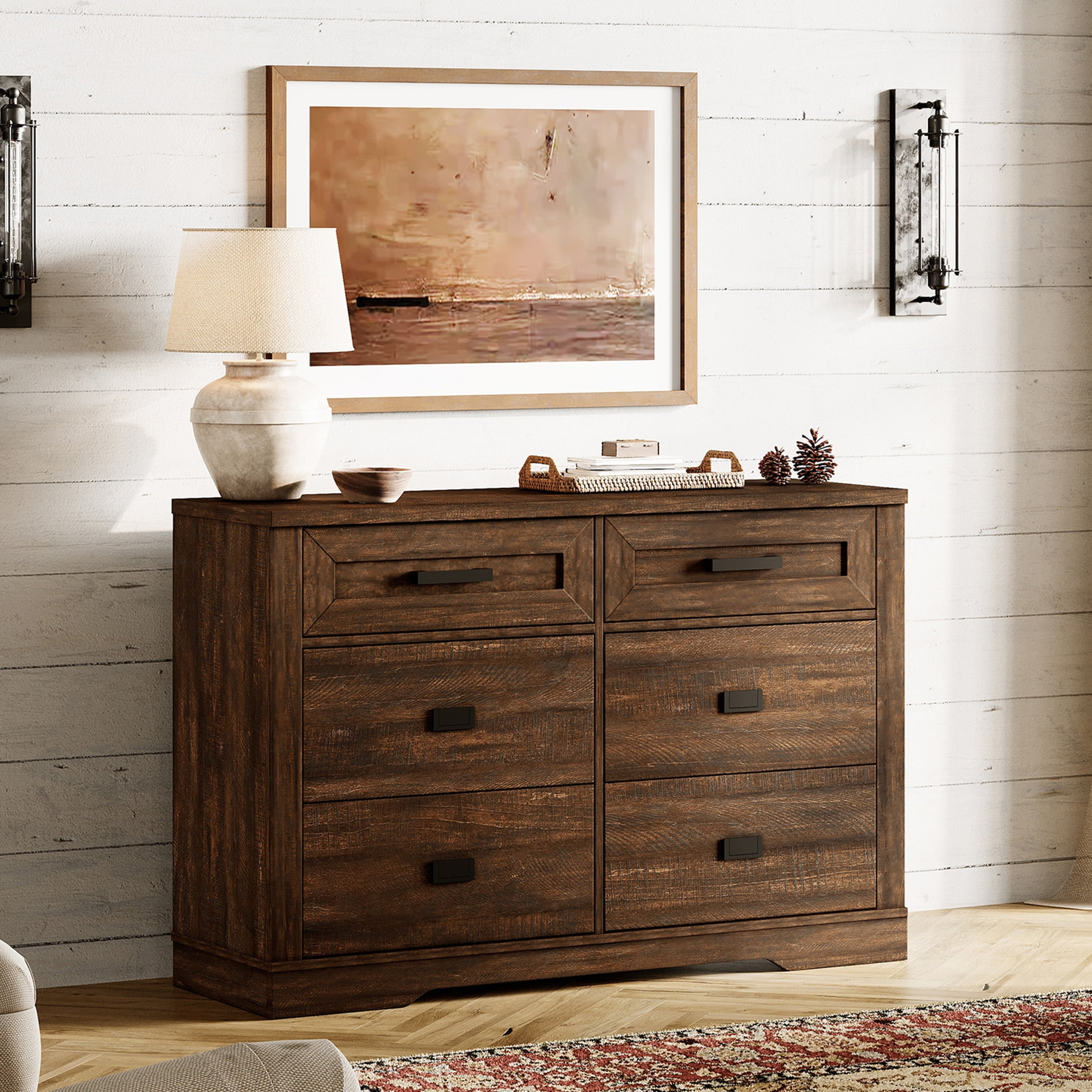 【Farmhouse Charm Dresser】Infusing any bedroom with warmth and coziness, this rustic dresser creates a welcoming atmosphere. Its natural wood texture lends authenticity and character to your living space, while the vintage design evokes a sense of nostalgia and style. 【Storage Solution】Overall Dimensions: 31.9″” Hx 15.3″” Dx 47.2″”W. The bedroom dresser features 6 small drawers, providing versatile storage for organizing items such as shirts, underwear, socks, baby essentials, and children’s toys. The spacious 47.2″” x 15.3″” countertop is ideal for lamps, decor, or photos. This can help organize your stuffs separately and orderly. 【Versatile Functionality】Beyond serving as a traditional dresser, this piece of furniture offers versatile functionality. Use it as a vanity in your bedroom, a storage cabinet in your study or office, or even as a stylish accent piece in your entryway or hallway, adapting to your changing needs and preferences effortlessly.
