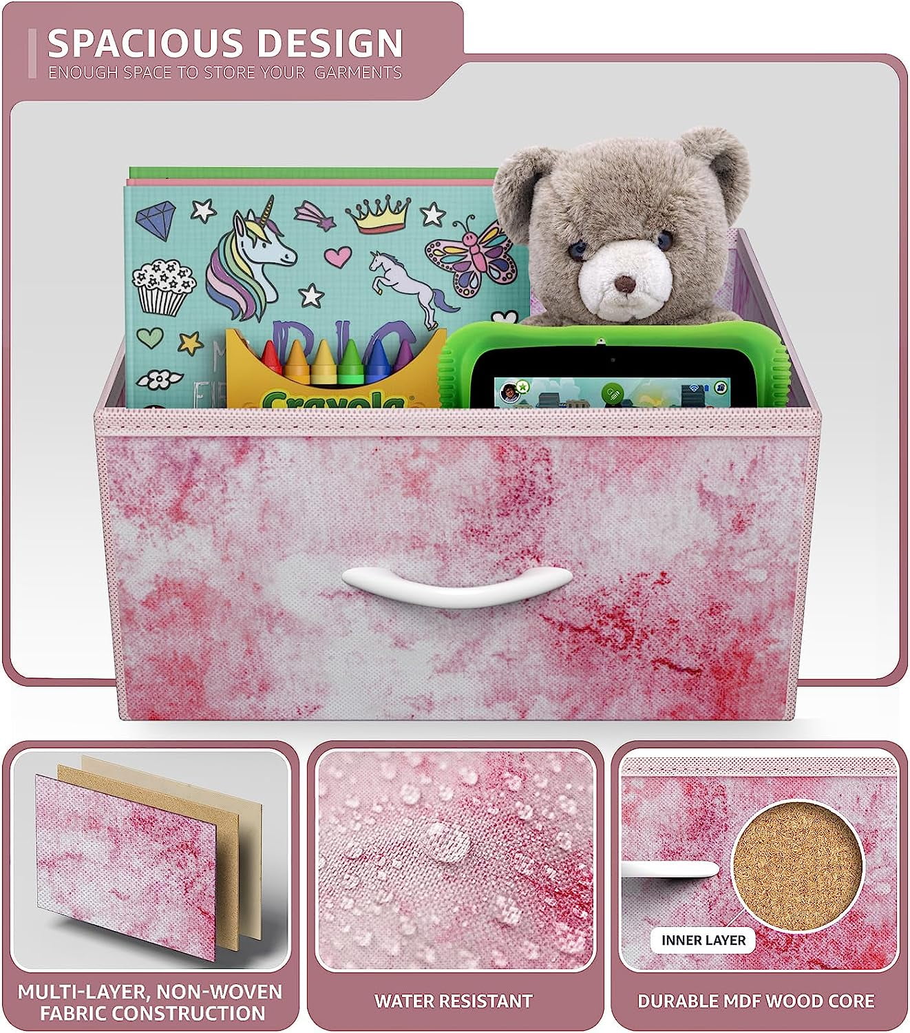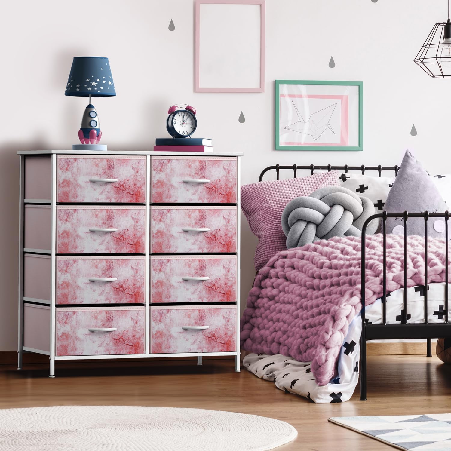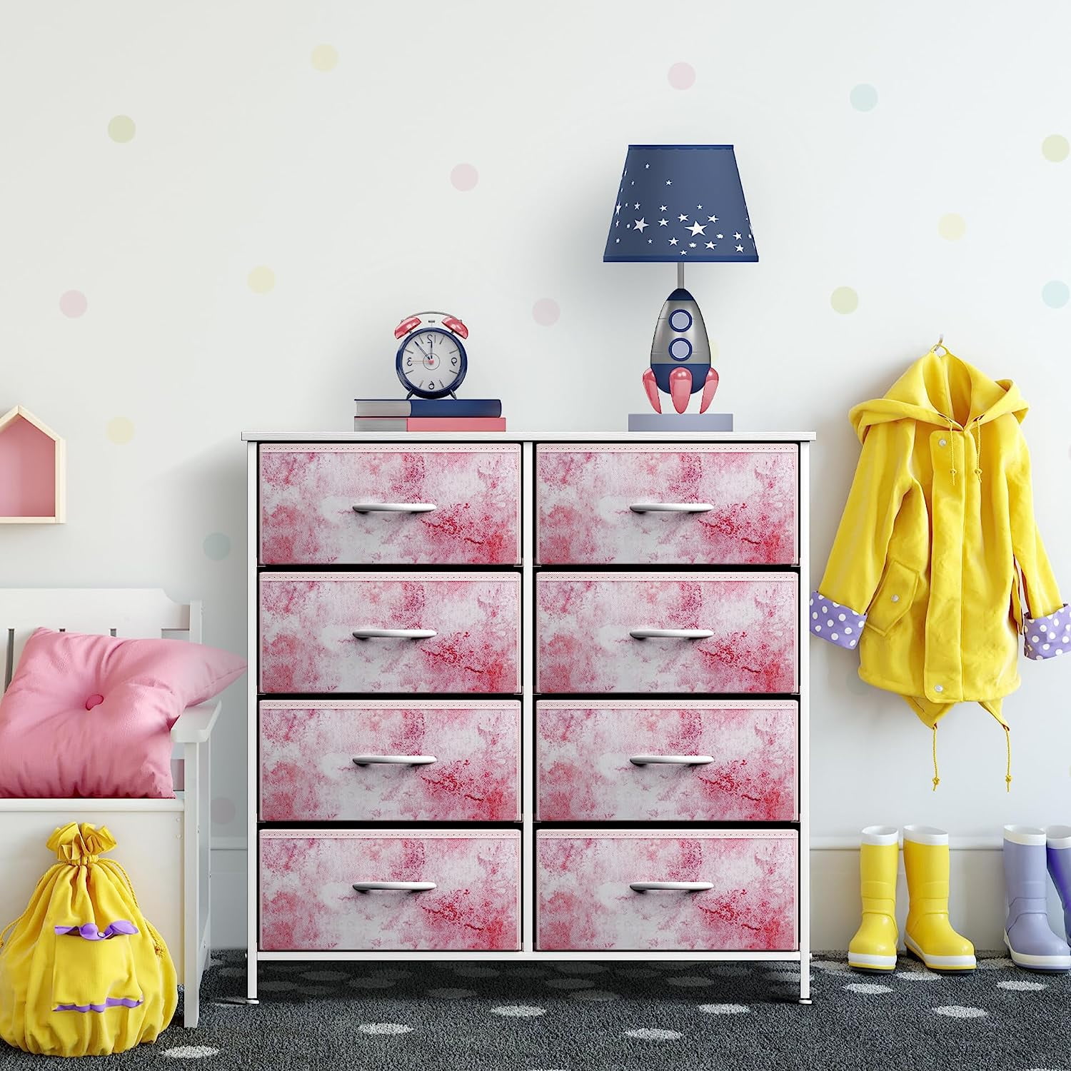 Update your child’s room with the Sorbus 8-Drawer Dresser. This colorful dresser chest features a tabletop surface and pull-out drawers to tuck away household clutter. Place all of your child’s folded t-shirts, jeans, and pajamas, or extra blankets and toys within the spacious fabric drawers. For display, the top surface can be used for lamps, books, clocks, and more. The playful tie-dye color combo makes this furniture storage charming for any nursery, playroom, or bedroom. It is lightweight for easy transport and when not in use, simply fold the fabric drawers flat for storage. Complete the look with any drawer configuration from the Sorbus Furniture Collection. Great addition to any room. Bring on the toys, books, and blankets! Display this charming nightstand in the kid’s bedroom filled with linens and clothes or play area complete with coloring books, Legos, plushies, and dolls! The soft lightweight fabric makes it easy for kids to pull out their favorite toys for play dates or easily put them away within the colorful drawers. In the nursery, this chest brightens up your little one’s sleeping space for stylish baby storage. With kids and teens in mind, it complements pastel rainbow décor, unicorn themes, and trendy ombré colors for a fun look. Trendy design with easy assembly. 8-drawer tie-dye dresser (Pink). Lightweight and easy to assemble. Hardware and instructions INCLUDED. Drawers made of non-woven (polyester) fabric. Frame made of steel and MDF wood with white finish. Accessories shown in image NOT INCLUDED. Measures approximately 31.50” L x 11.75” W x 32.12” H.
