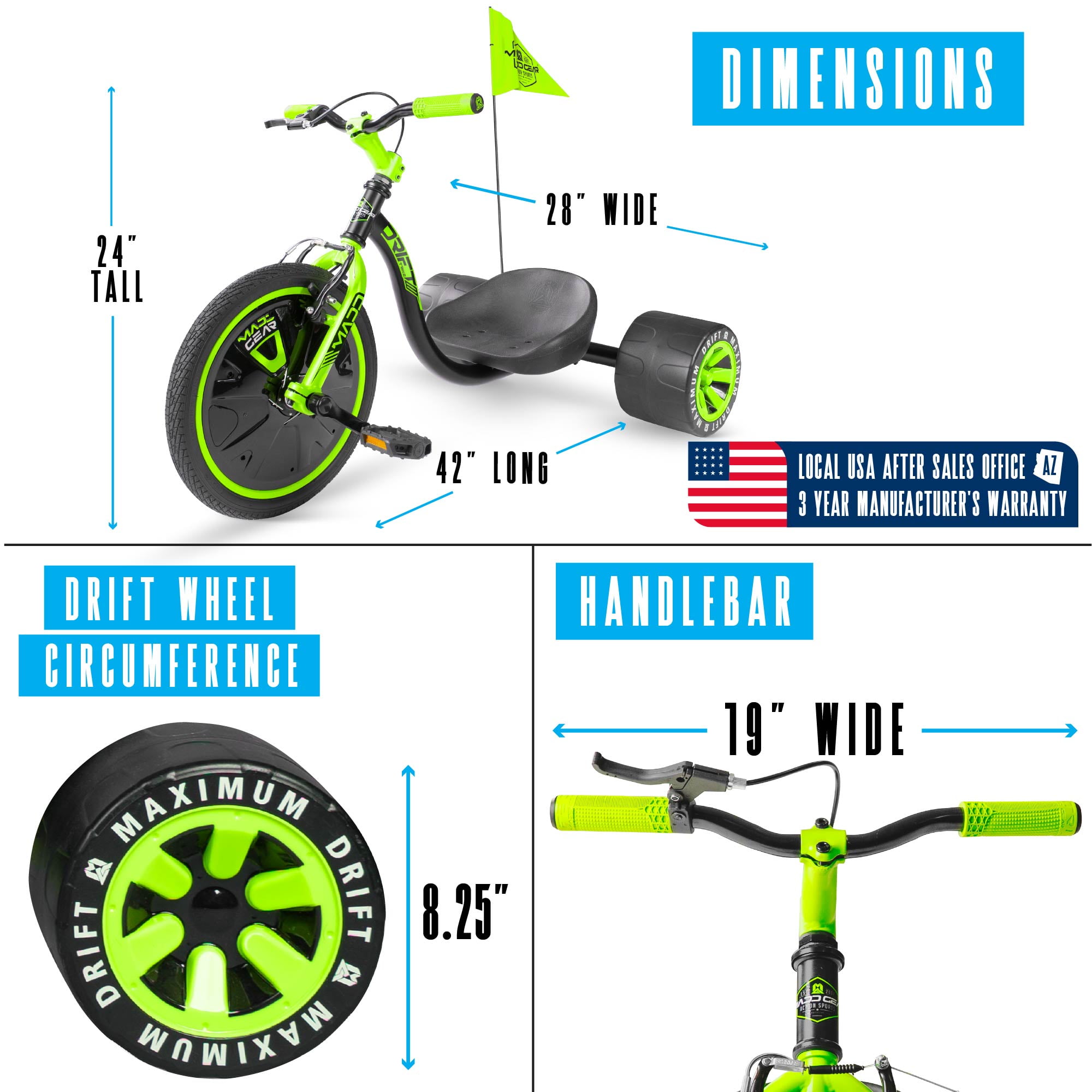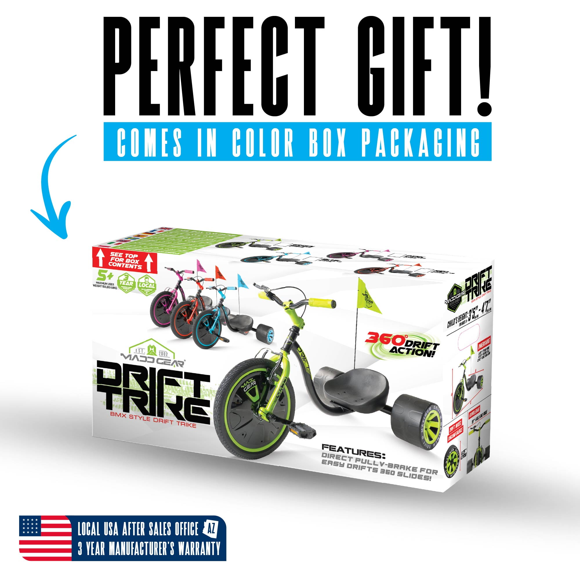 Big-Wheel Drift Trike – Perfect for sliding, spinning, and drifting fun on 3 wheels. Adjustable Bucket Seat – 5-position seat grows with your child for lasting use. Strong Steel Frame – Built tough for everyday outdoor adventures. 16” BMX-Style Front Wheel – Features integrated spoke cover for added safety. Rear Slick Drift Wheels – Hard-compound molded for smooth 360° spins. Safety Flag Included – Enhances visibility for driveway or park play. Easy Assembly – Setup in minutes with included tools and instructions. 3-Year Manufacturer Warranty – U.S.-based support you can count on.
