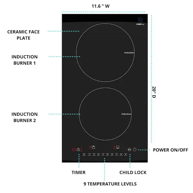 - Safety lock function: the chef top induction cooktop single burner is also equipped with a built in child safety lock securing all operating buttons of the dual induction cooktop in order to protect the little ones from injuries such as scalding