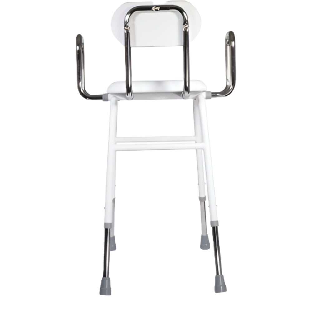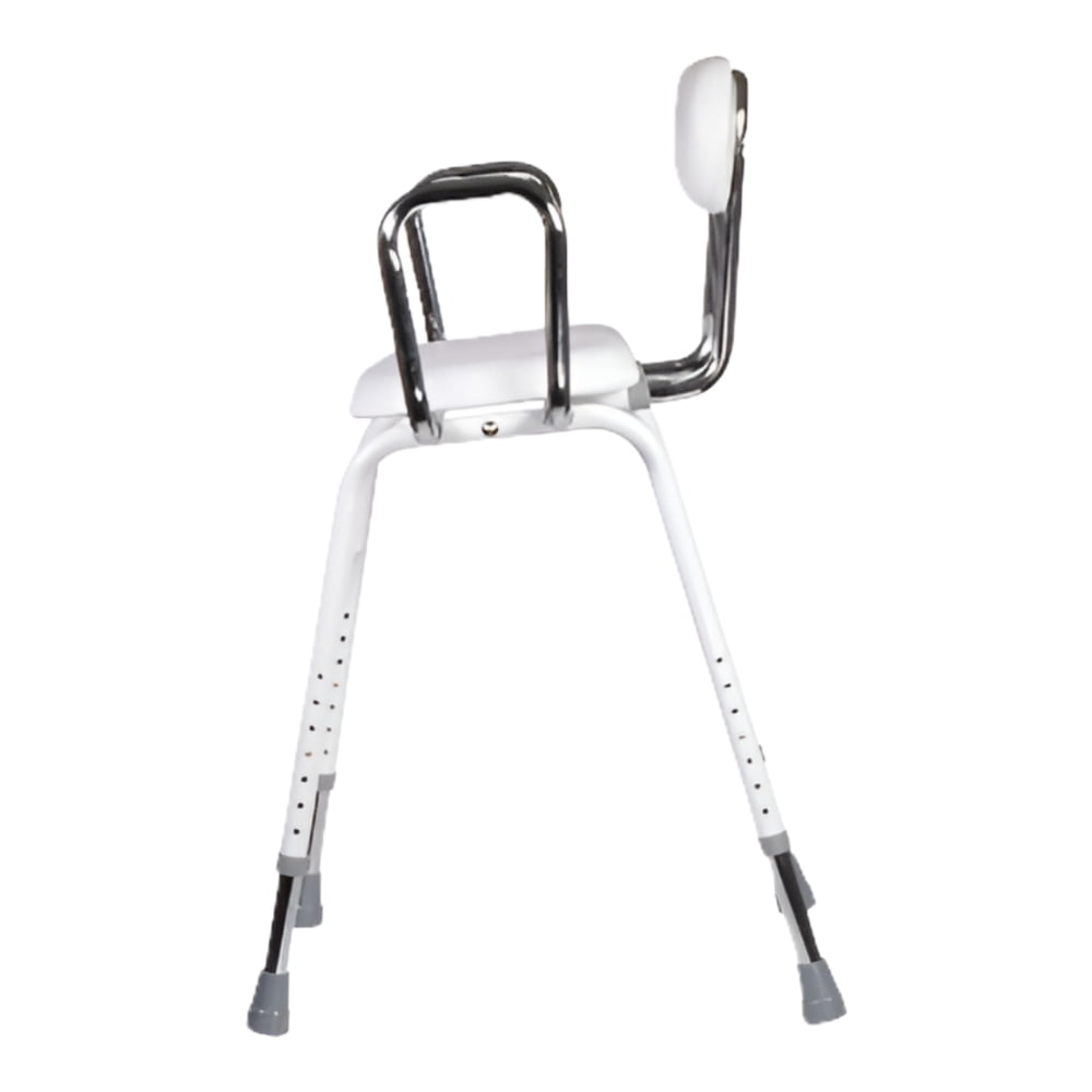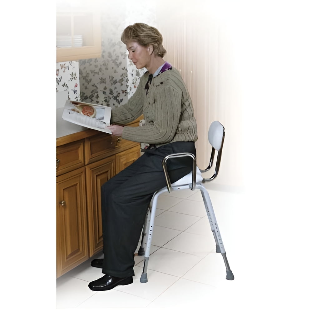 Drive Medical All-Purpose Kitchen Stool w/ Adjustable Arms and Padded Seat Angled seat makes sitting down and getting up easy Adjustable height to accommodate most individuals Comes with removable arm supports with adjustable width for added safety and comfort Easily assembled Intended for Indoor Use Manufactured with white powder-coated steel for an attractive, durable finish Legs are chrome-plated steel Stool features a padded seat and back for added comfort