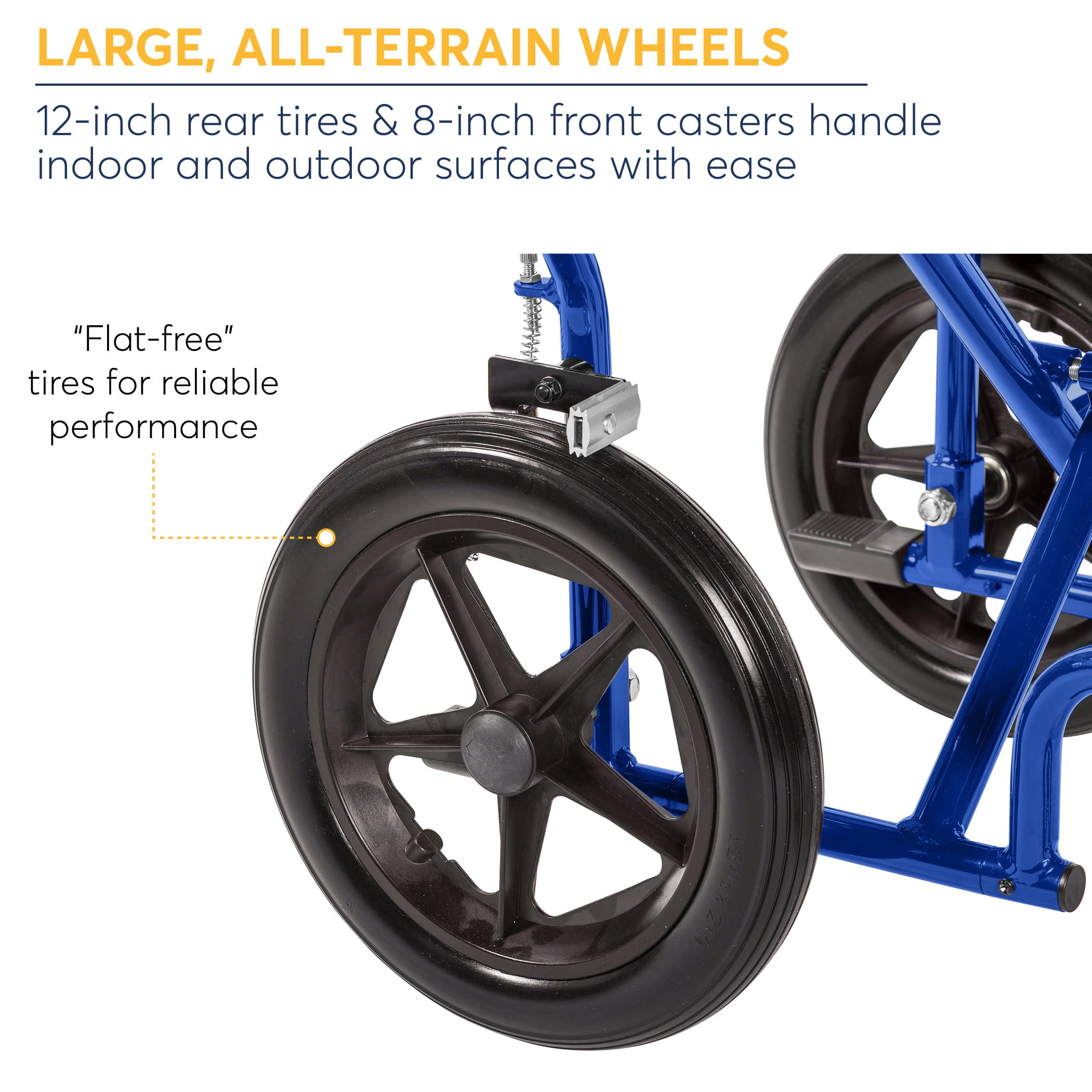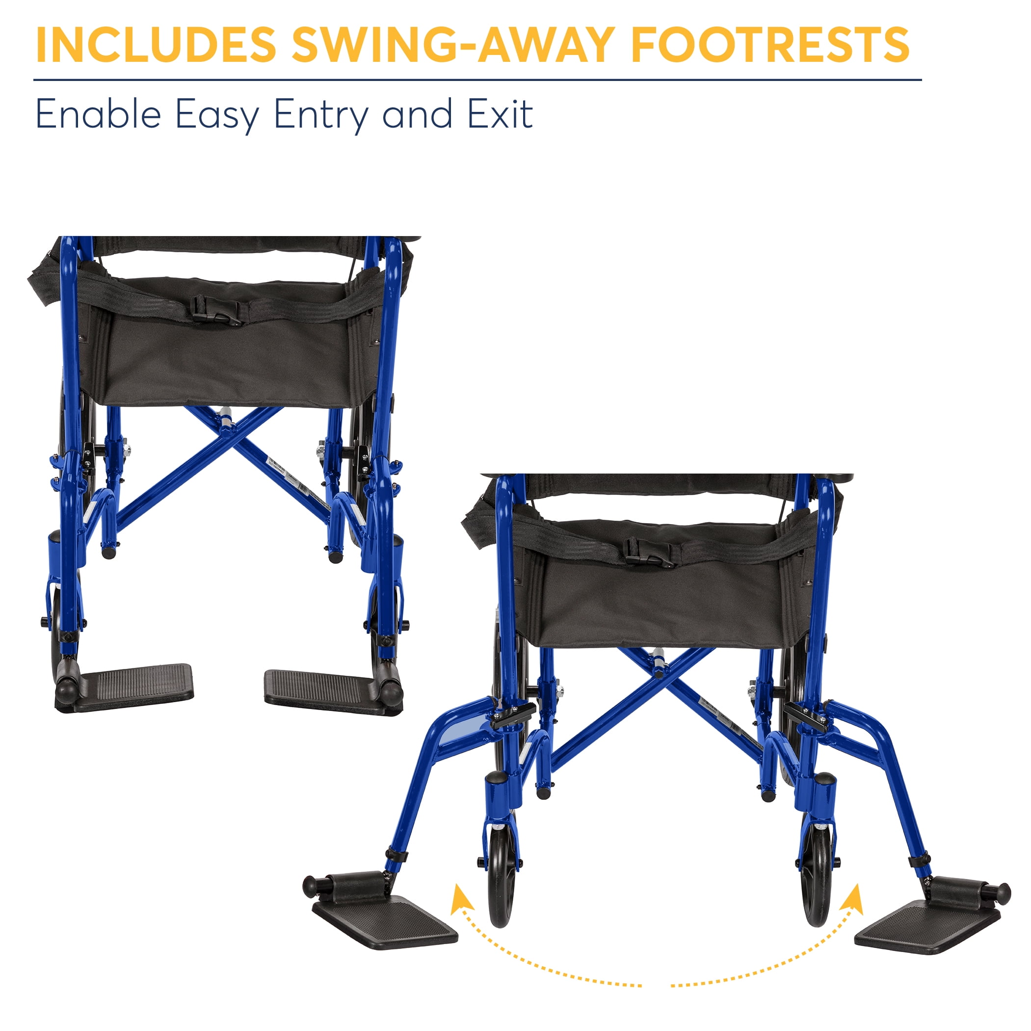 Companion activated wheel locks Weighs only 19 lbs Folds flat for easy transport Handy lever on chair back makes it easy and convenient to fold back down Comes with seat belt 12″ flat-free rear wheels Overall Product Length: 38″ Overall Product Height: 38″ Primary Product Material: Aluminum Primary Product Color: Blue Closed Width: 10.75″ Seat to Floor Height: 19″ Back of Chair Height: 18″ Number of Wheels: 4 Seat To Armrest Height: 8″ Armrest Length: 14″ Armrest to Floor Height: 27″ Rear Wheels: 12″ Brakes: Rear Handle Loop Brakes Casters: 8″ Folded Dimensions: 38″ X 10.75″ X 38″ Overall Length with Riggings: 38″ Product Weight Capacity: 300 lbs Actual Product Weight: 19 lbs Overall Product Width: 22″ Width Between Armrest Pads: 16″ Width Between Posts: 16.75″ Width of Seat Upholstery: 18.5″ Depth of Seat Upholstery: 16″