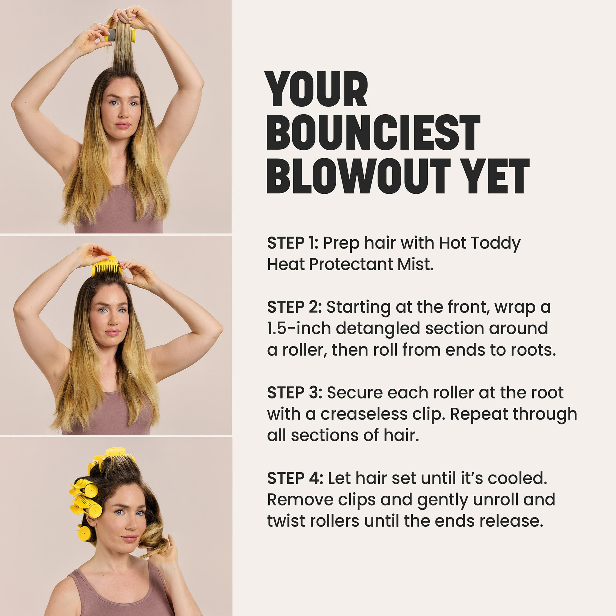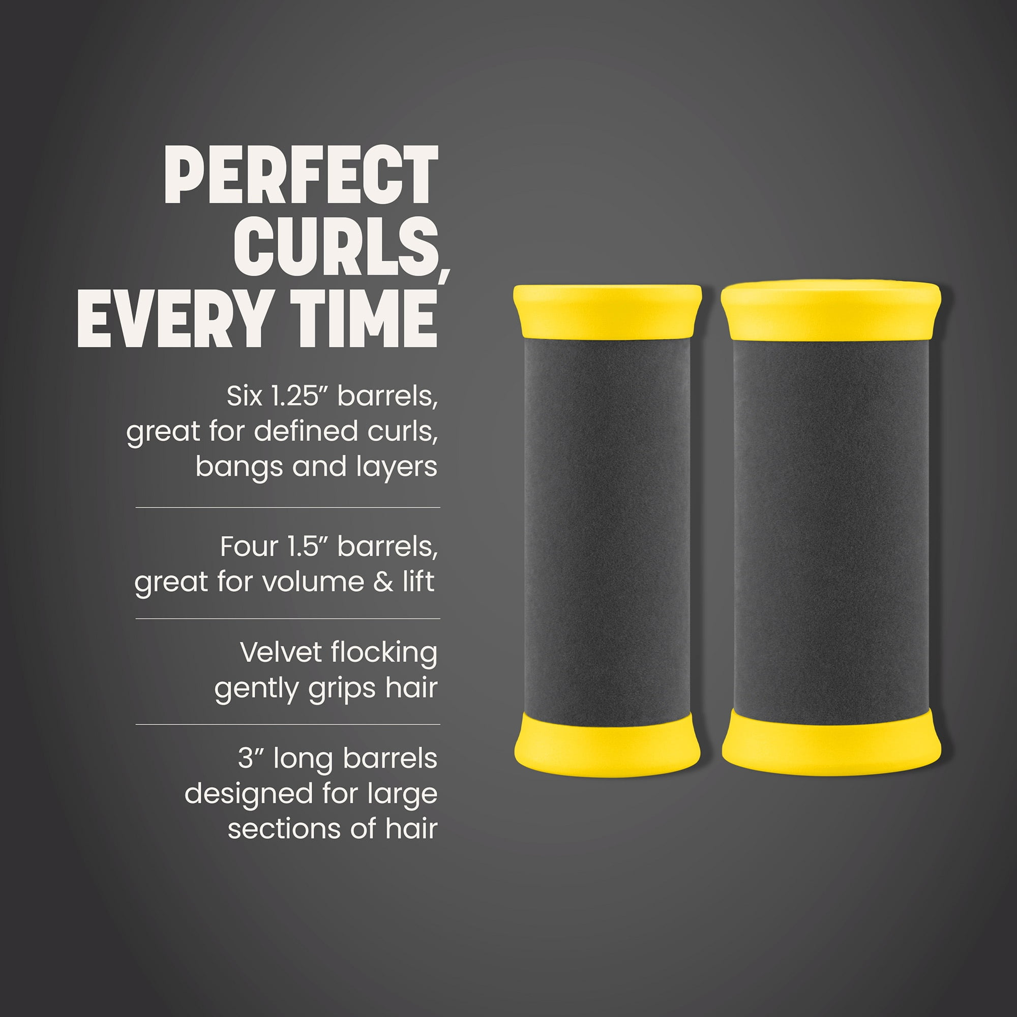 Product Statement Why you’ll love me: Long-length ceramic barrels hold large sections of hair and evenly distribute heat to create big, bouncy curls with tons of volume, less frizz and added shine. Two different barrel sizes allow for customized styling on all hair lengths to achieve the look of a perfect blowout. The Good Stuff 1.25” barrels are great for bangs and layers 1.5” barrels are great for volume, body and lift 3” long barrels are designed with additional length to set larger sections of hair for quick and easy styling 10 creaseless clips easily secure sections without leaving dents Velvet-flocked ceramic barrels gently grip hair for the perfect amount of tension Ceramic barrels with Ionic Technology® provide uniform heat, reduce frizz and add tons of shine Creaseless clips secure rollers in place without leaving dents or tugging strands Insulated cool-touch rims allow for comfortable handling and easy styling Heats to 230F°/110°C Fast heat-up base takes up minimal counter space Includes a heat resistant bag for easy storage and travel Great for long-lasting curls for all lengths and hair types