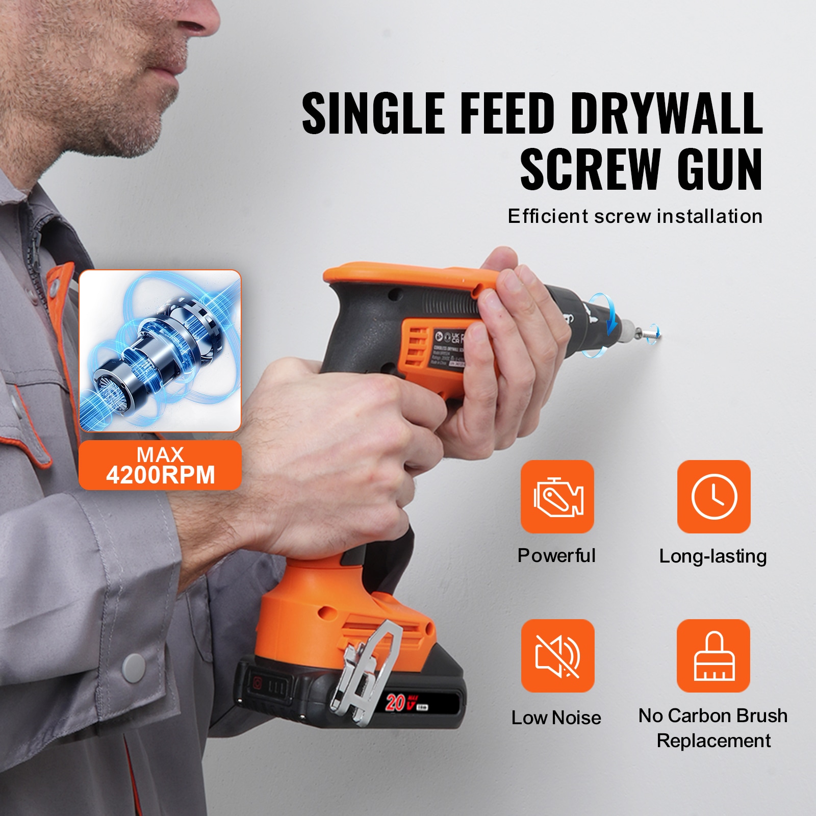 The SVOPES Drywall Screw Gun is built for professionals who need a reliable, efficient tool for quick and precise drywall installation; Powered by a high-efficiency brushless motor, it operates quietly while delivering consistent performance without the hassle of carbon brush replacements; The included 2 x 2AH battery packs ensure uninterrupted work for extended periods, while the practical tool bag and belt clip offer portability and easy access on the job site.