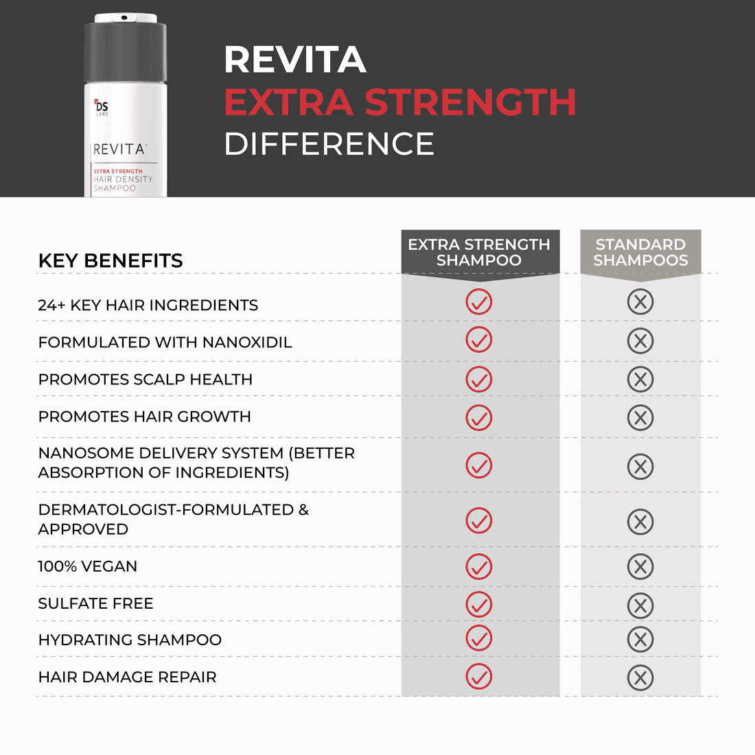 Revita Extra Strength Hair Density Shampoo is your new go-to for hair that looks and feels absolutely fabulous! This innovative shampoo is designed to revolutionize your hair care routine by combining the magic of our proprietary molecule, Nanoxidil, with over 24 meticulously chosen active ingredients. Whether you’re looking to boost hair density or simply maintain luscious locks, this powerful formula has got you covered.Daily use of Revita Extra Strength Shampoo not only helps your hair appear thicker and fuller but also strengthens it from the inside out. Imagine stepping out of the shower, knowing that your hair is being nourished and revitalized with every wash! With clinically proven results surfacing as soon as 90 days*, youll soon be on your way to hair that commands attention and radiates health.What sets this shampoo apart is its unique blend of strengthening amino acids, which work harmoniously to enhance hair density. Plus, it doesnt just stop at hairRevita supports your scalps health with clinically tested ingredients that maintain vitality, ensuring that each strand has a strong foundation.Say goodbye to harsh cleansing agents that leave your hair feeling dry. Our extra strength formula gently cleanses the scalp while nourishing and hydrating your hair, giving you a luxurious washing experience every time. Users rave about how their hair feels softer and looks shinier, making it the perfect addition to your beauty regimen.Transform your hair goals into reality with Revita Extra Strength Hair Density Shampoo. Embrace the journey to stronger, healthier, and more vibrant hair, and watch as your confidence soars with every use!