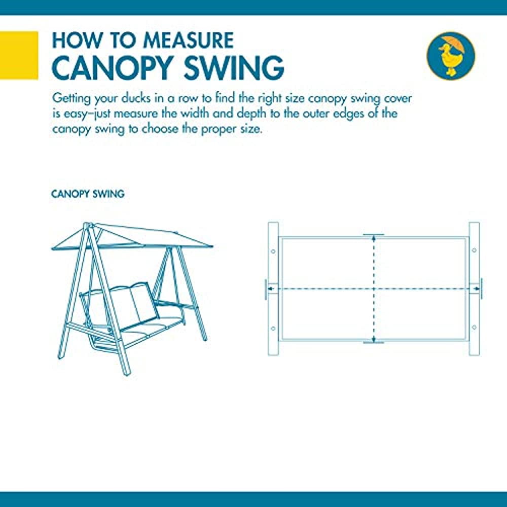 Fits Canopy Swing up to 80in W One-year limited warranty Lightweight, water-resistant material protects in moderate weather conditions Extra long reinforced nylon tie-down straps keep the cover securely installed Zippered access for easy installation Ultrasonic welding at seams prevents leaking Double-stitched hem for extra durability Not designed to entirely cover the wheels or legs