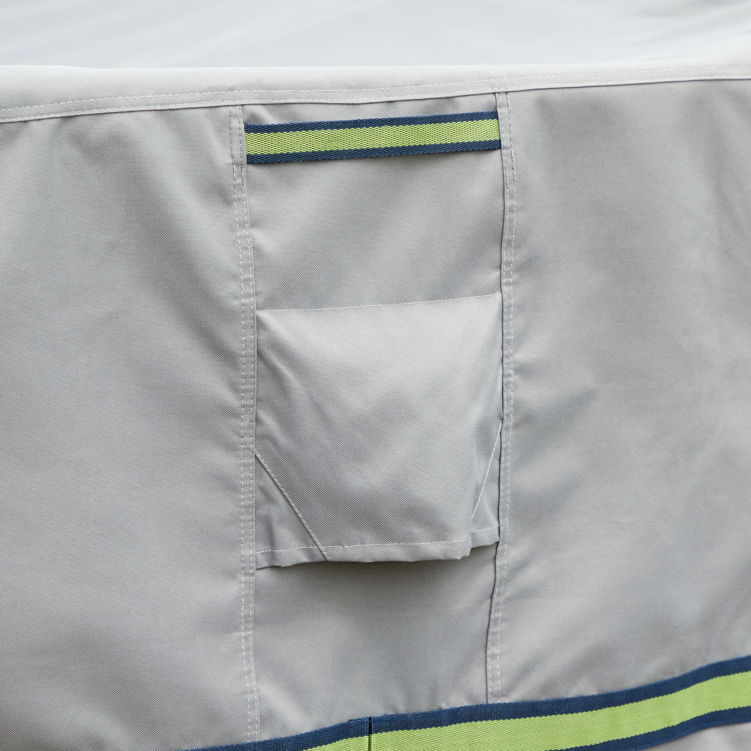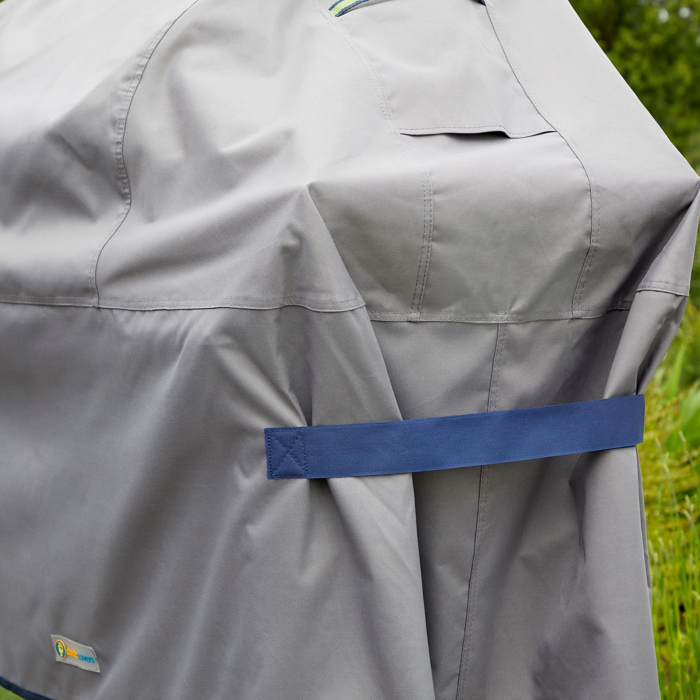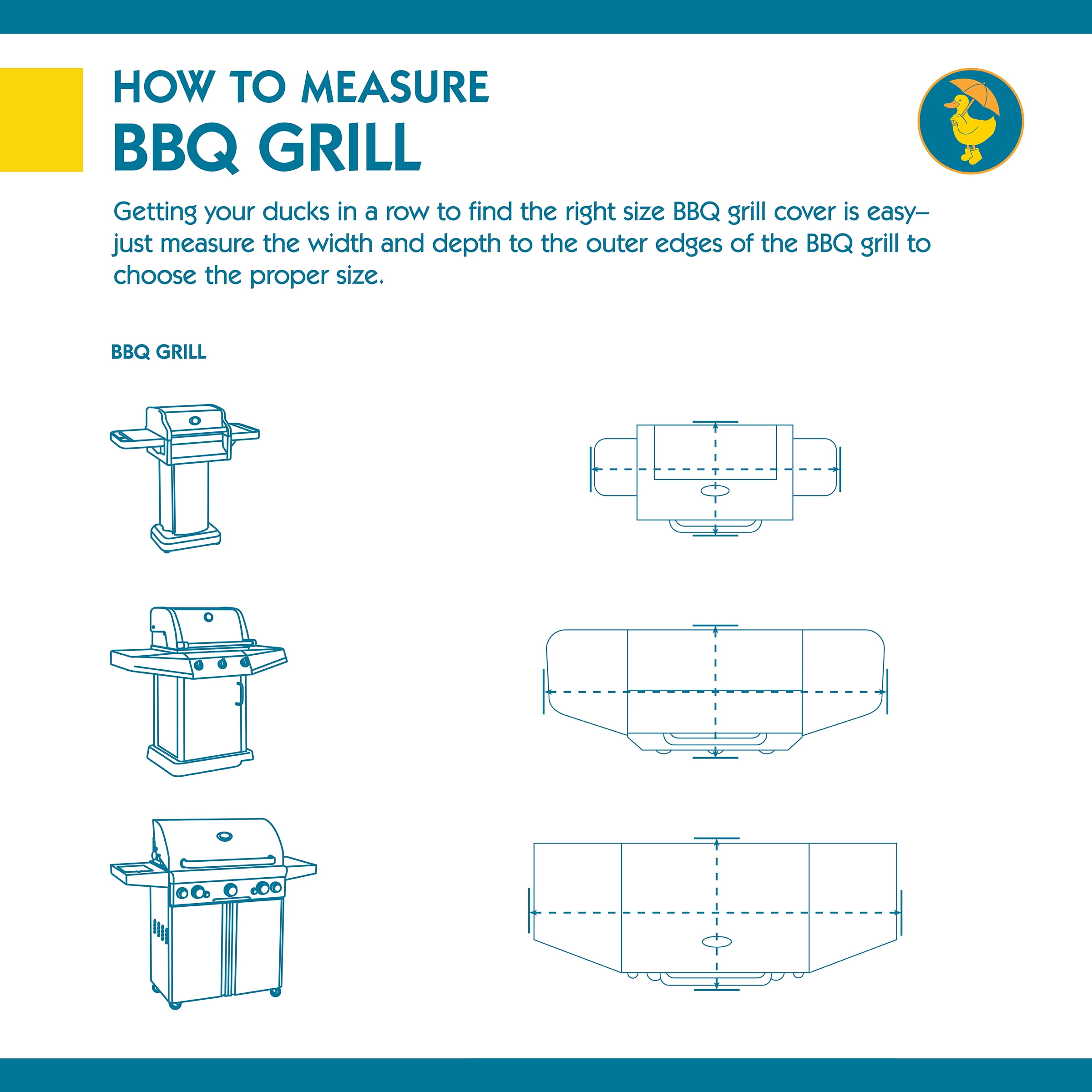 GRILL COVERS: Fits barbecue grills 53″W x 25″D x 43″H Two-year limited warranty Durable fabric with a waterproof backing features a sporty webbed accent Rip-n-grip straps on each corner create a tight, custom-like fit Handles for easy installation Air vents reduce condensation and wind lofting Tape sealing at critical seams prevents leaking Double-stitched seams for extra durability Not designed to entirely cover the wheels or legs