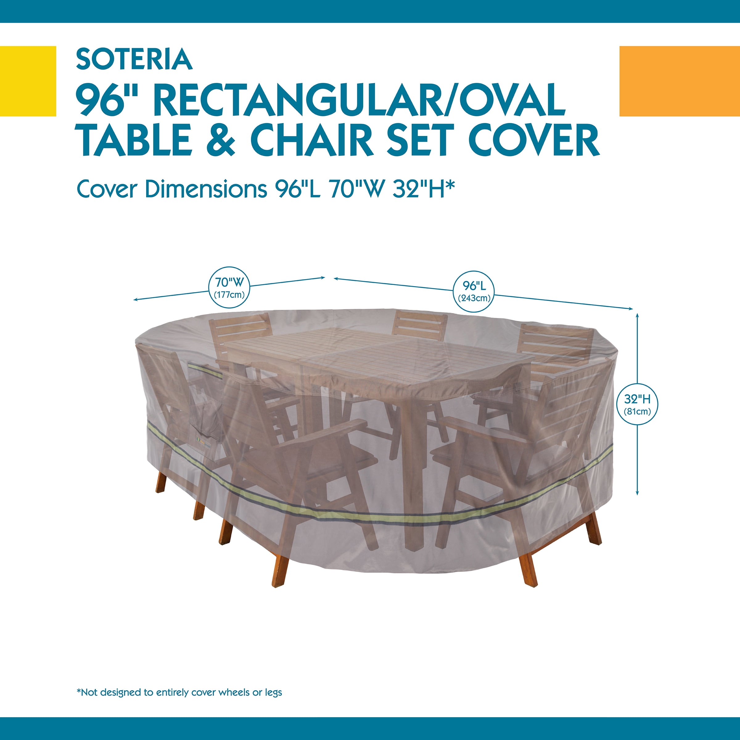 PATIO COVERS: Fits rectangular/oval patio tables & 6 patio chairs 96″L x 70″W x 32″H Two-year limited warranty Durable fabric with a waterproof backing features a sporty webbed accent Click-close straps in each corner hold the cover securely in place Handles for easy installation Gusseted air vents reduce condensation and wind lofting Tape sealing at critical seams prevents leaking Double-stitched seams for extra durability Not designed to entirely cover the wheels or legs Please refer to your furnitures care instructions as some finishes, sealants or coatings could react to PVC backed covers. To reduce this possibility, the use of a support pole (sold separately) is recommended to elevate the cover. Our covers are not intended for furniture made of concrete.