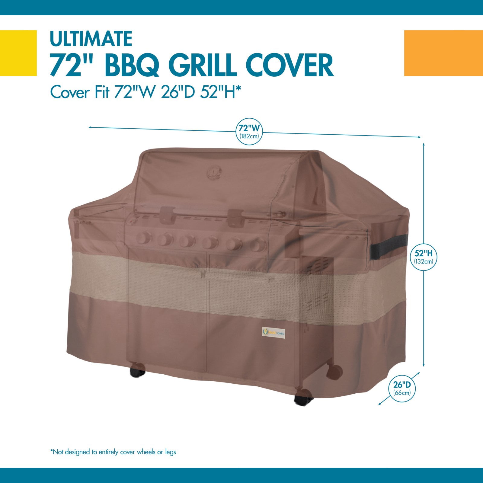 PREMIUM GRILL COVER : Fits barbecue grill up to 72″ W x 26″ D x 52″ H GRILL COVERS with WARRANTY: Two-year limited warranty WATER-RESISTANT: High-strength, water-resistant materials DURABLE COVER WITH ADVANCED FEATURES: Double-stitched seams for extra durability Rip-n-grip straps on each corner create a tight, custom-like fit Tape sealing at critical seams prevents leaking *Not designed to entirely cover the wheels or legs