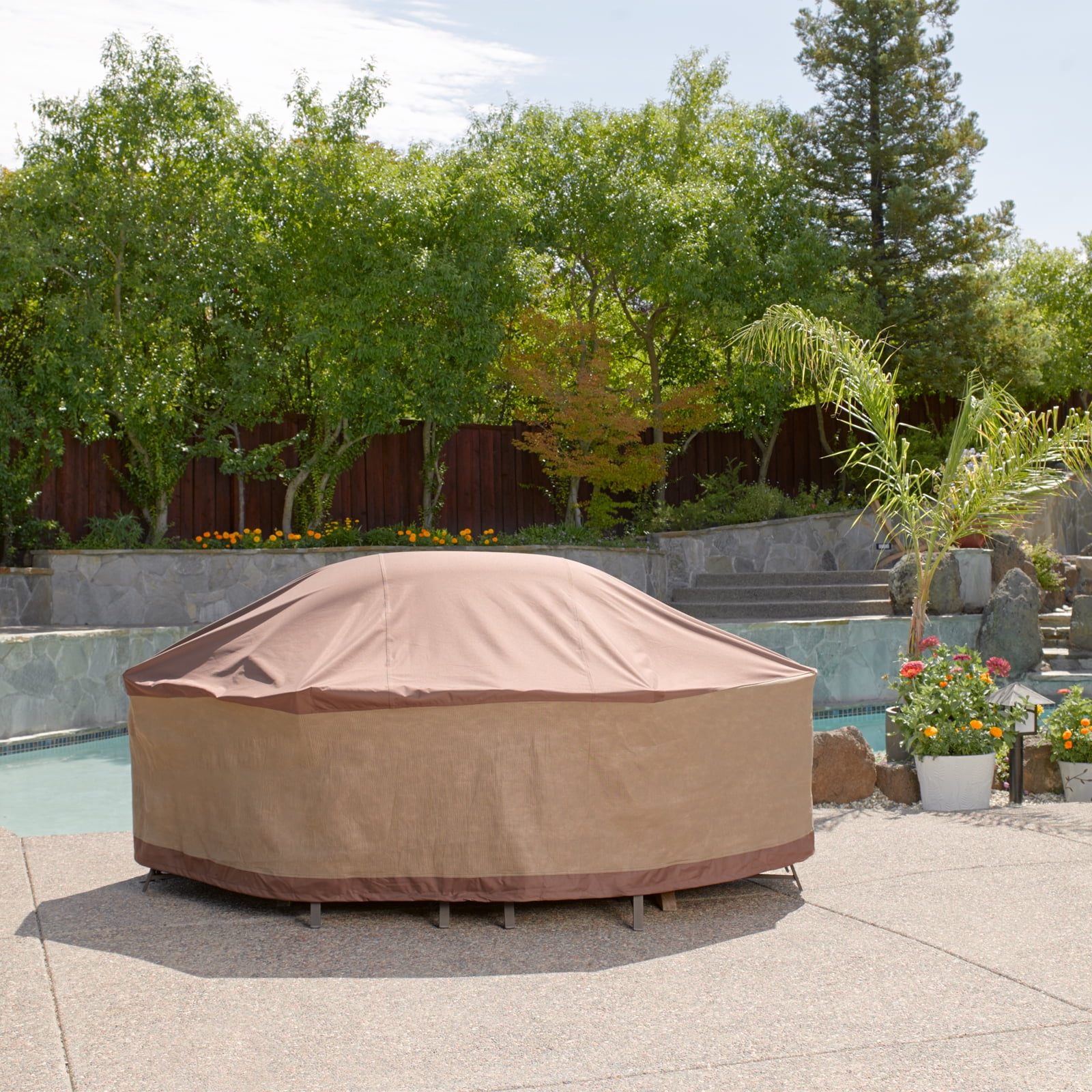 PATIO COVERS: Fits rectangular/oval patio tables & 6 patio chairs 127″L x 84″W x 32″H Two-year limited warranty Waterproof fabric is ideal for high moisture climates Seam sealer tape applied during manufacturing process prevents water penetrating the cover at the seams UV stability added during material production to reduce fading A combination of nylon straps with side-release buckles and shock cord with locks firmly secures cover in place Color coordinated so patio furniture covers can be combined with Duck Covers Elite or Essential Series Duck Covers recommend you store cushions separately when not in use Please refer to your furnitures care instructions as some finishes, sealants or coatings could react to PVC backed covers. To reduce this possibility, the use of a support pole (sold separately) is recommended to elevate the cover. Our covers are not intended for furniture made of concrete.