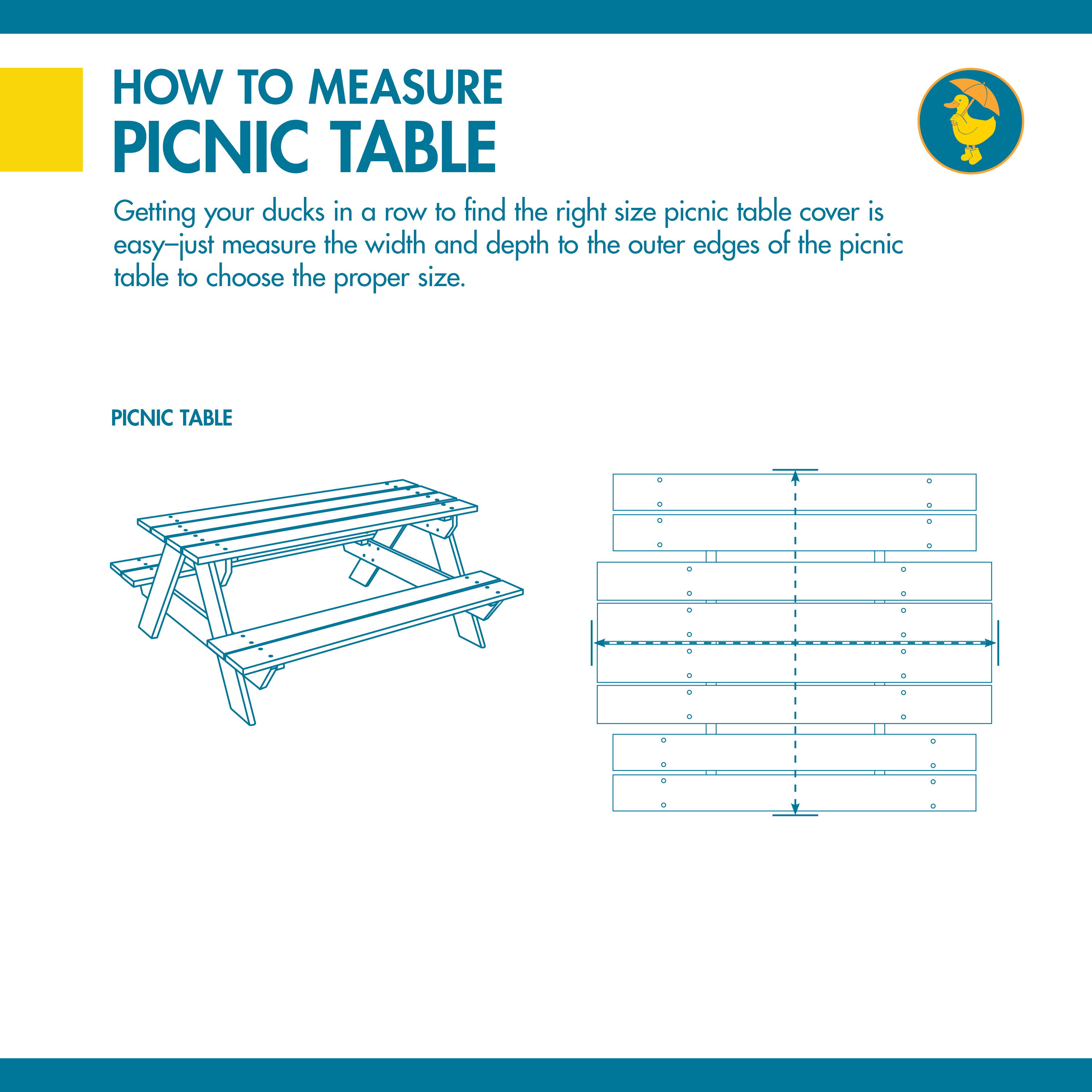PREMIUM PATIO FURNITURE COVER : Fits picnic table up to 70″W x 55″D x 30″H OUTDOOR FURNITURE COVER with WARRANTY: Two-year limited warranty WATERPROOF: High-strength, waterproof materials DURABLE COVER WITH ADVANCED FEATURES: Elastic hem with cord lock provides a custom-like fit Click-close straps in each corner hold the cover securely in place Double-stitched seams for extra durability Tape sealing at critical seams prevents leaking Not designed to entirely cover the wheels or legs Please refer to your furnitures care instructions as some finishes, sealants or coatings could react to PVC backed covers. To reduce this possibility, the use of a support pole (sold separately) is recommended to elevate the cover. Our covers are not intended for furniture made of concrete.