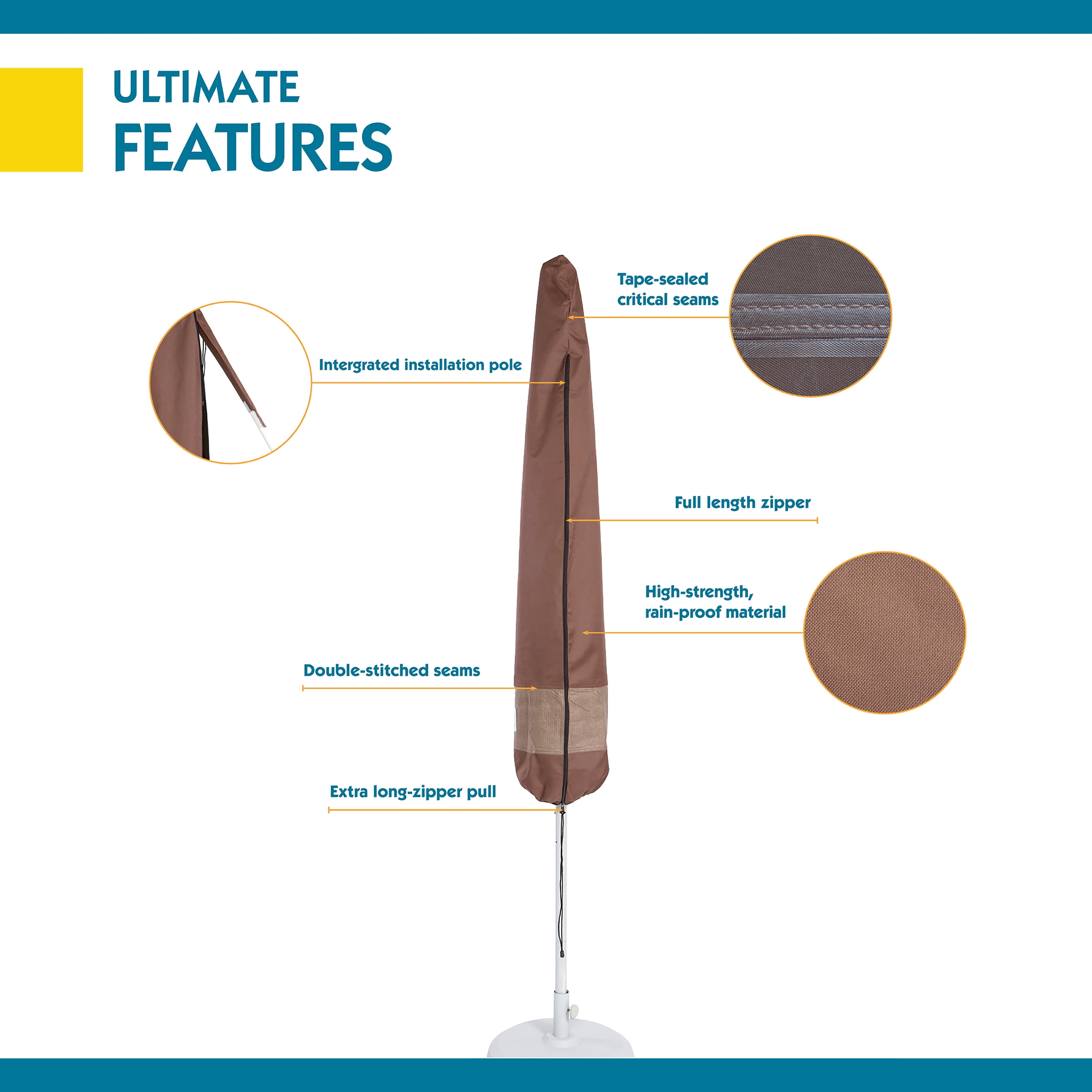Ideal for use in harsh weather and high wind conditions. Duck Covers Ultimate Umbrella Covers come with an installation wand that allows cover to be installed easily while the umbrella is in place. Zipper includes pull down rope for easy closure at height. Designed to protect patio umbrella from dust and moisture which can stain the material. Mocha Cappuccino color. Two-year limited warranty has you covered. Migrate to Duck Covers today!