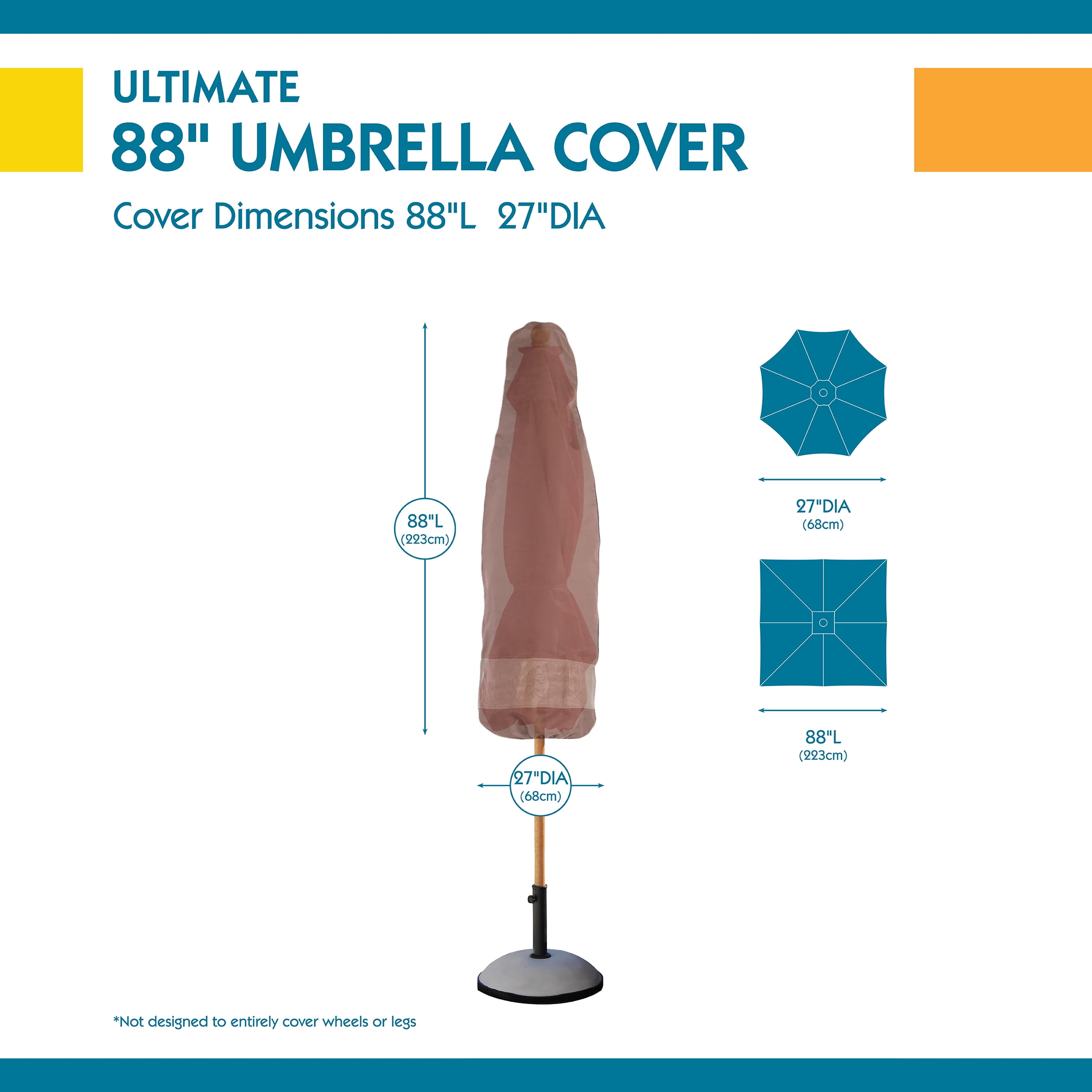 PATIO COVERS: Fits patio umbrellas 88″L x 27″DIA Two-year limited warranty Waterproof fabric is ideal for high moisture climates Seam sealer tape applied during manufacturing process prevents water penetrating the cover at the seams UV stability added during material production to reduce fading Full-length zipper with pull chord