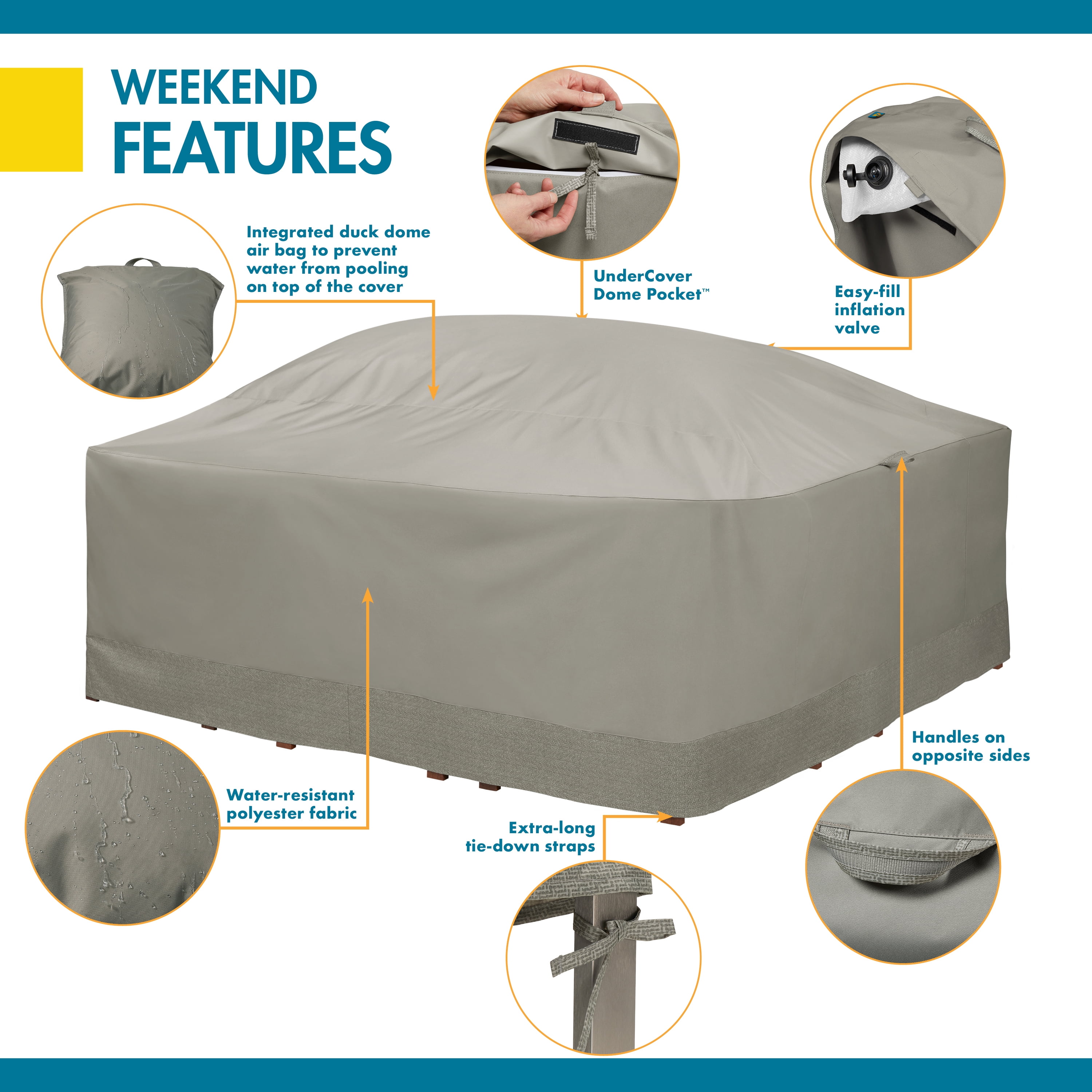 Water-resistant fabric and an integrated Duck Dome prevents puddling at low points Protect your outdoor furniture without having to compromise on style Extend your Weekend with the full collection including umbrellas, cushions, slipcovers, and more 1-year limited warranty gives you extra peace of mind Fits tables and chairs up to 90″W x 90″D x 32″H