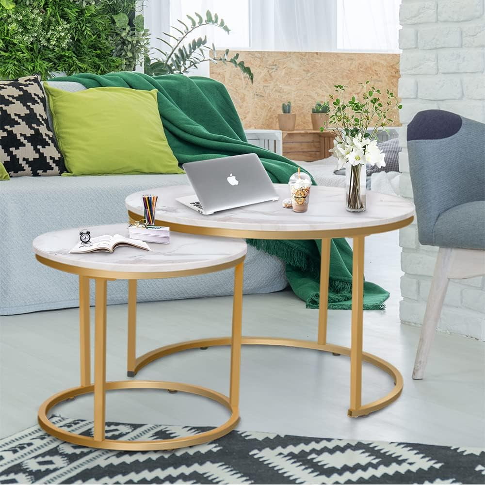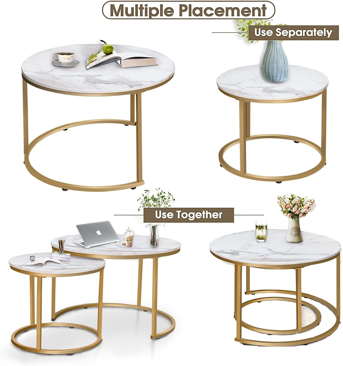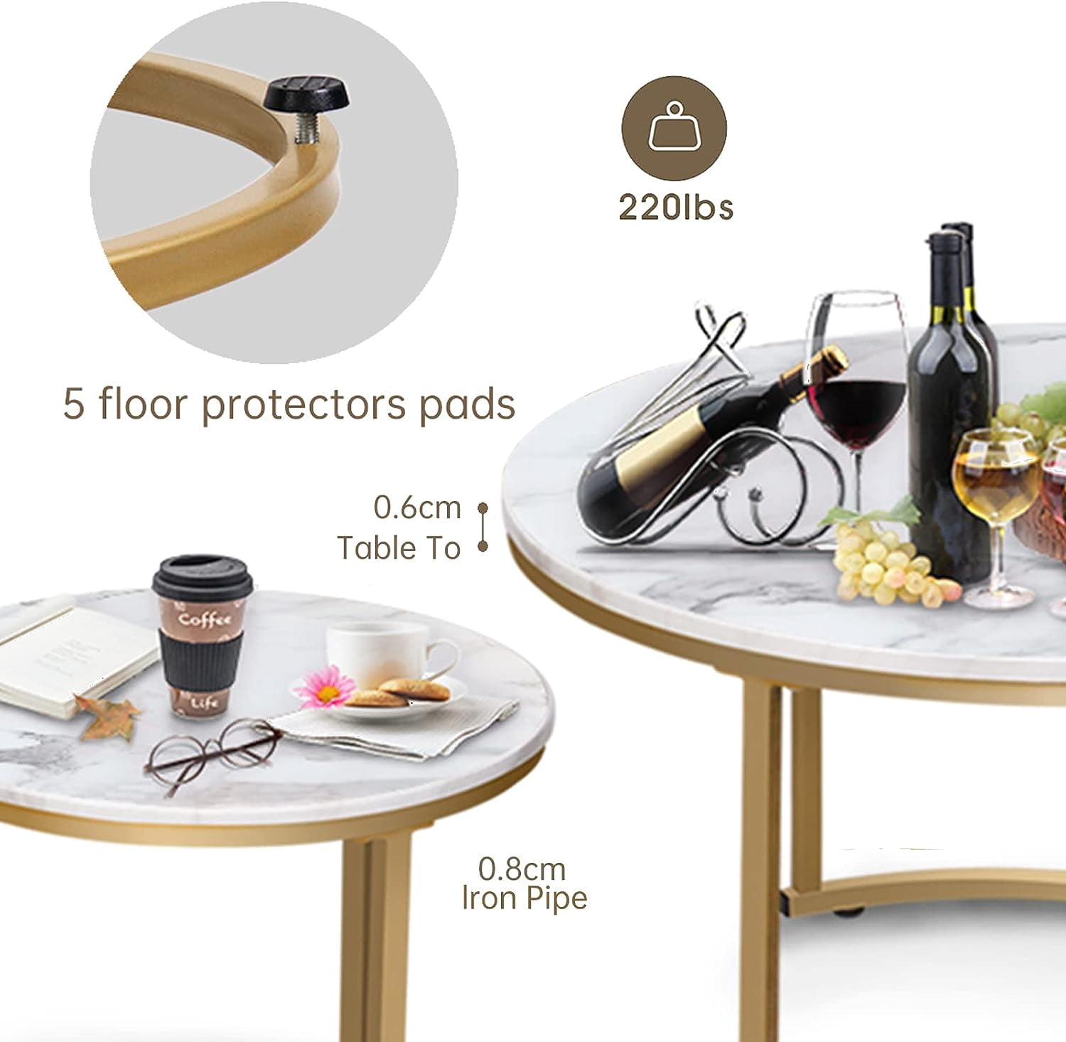 Dueatib Modern Space-Saving Round Steel Frame & MDF Board Coffee Table, White Marble for small spaces Unique nesting design with a large table Φ 23.6 × 17.7 inches and a small table Φ 15.7 × 15.7 inches that fits neatly underneath Elegance & retro style Vintage-inspired design adds charm and a minimalist touch to your living room Detail-oriented Non-slip feet with adjustable pads ensure stability on various floor types including wood tile and concrete Intimate design Ergonomically designed for comfort perfect for enjoying a leisurely afternoon with a cup of coffee Strong and durable Features a sturdy metal frame secured with double screws and a scratch-resistant MDF tabletop for long-lasting use