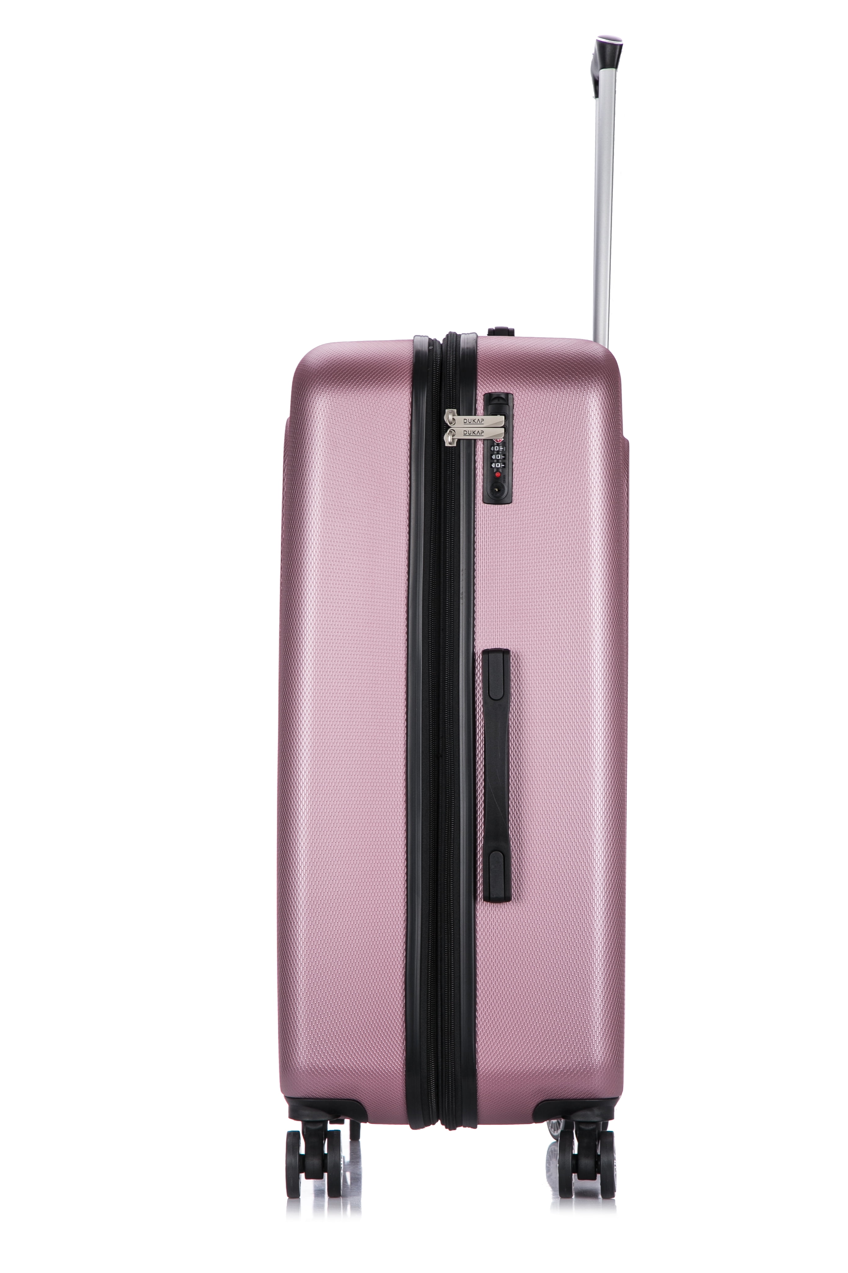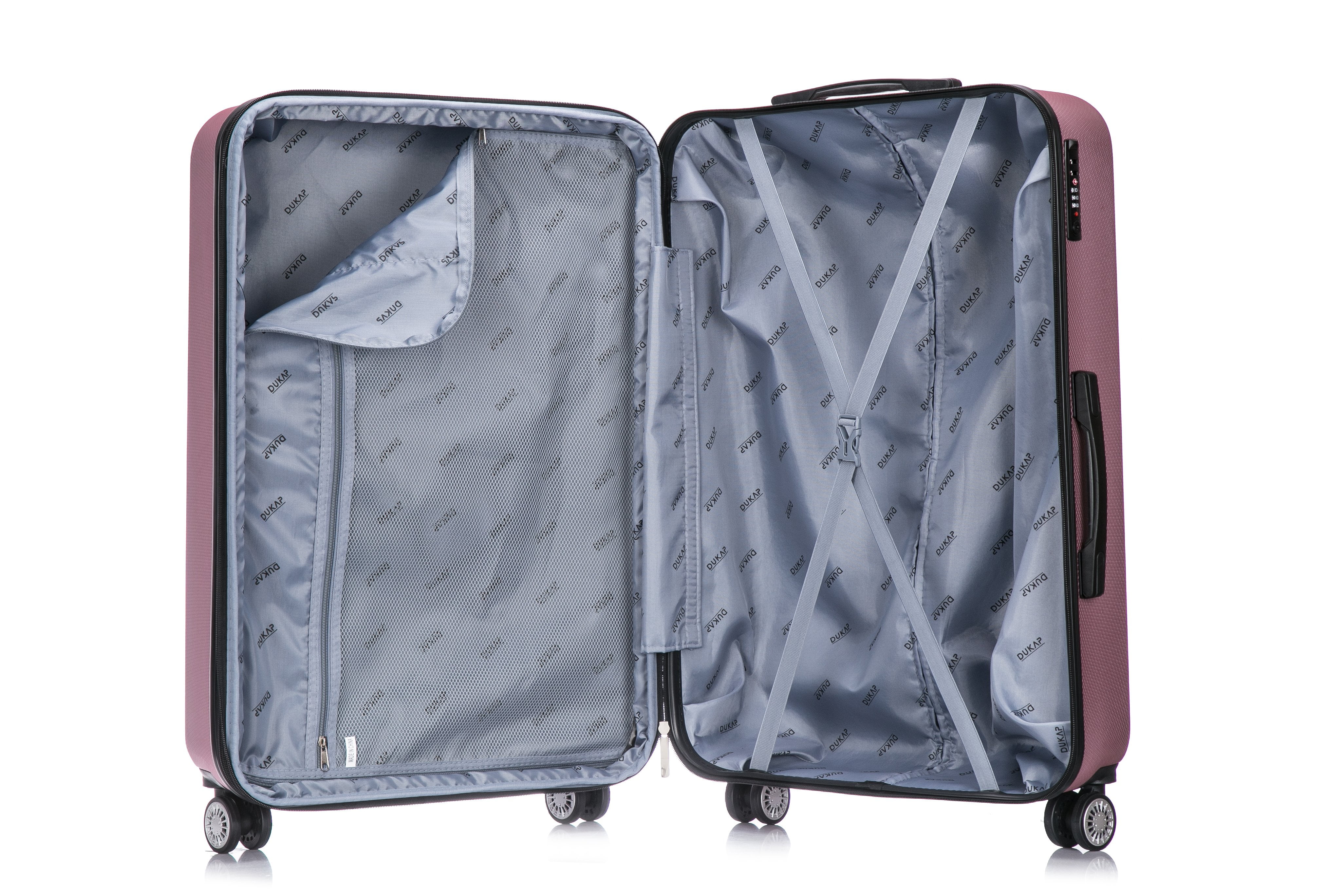 The DUKAP Crypto collection is made of lightweight PC/ABS engineered material with micro diamond finish. The hard-flex construction offers maximum strength, durability and a water/scratch resistant finish. Featuring an amazing style with 4 dual multi-directional 360° wheels for effortless mobility , Built-in 3 digit TSA approved combination lock, 2” expandable for additional extra space, full interior fabric lining with a zippered compartment on one side, snap-on straps on the opposite side for easy packing and one inside pocket for your convenience, push button locking internal retractable trolley system, Top and side ergonomic GEL handles and smooth gliding oversized zippers. This product can be purchased in different colors.