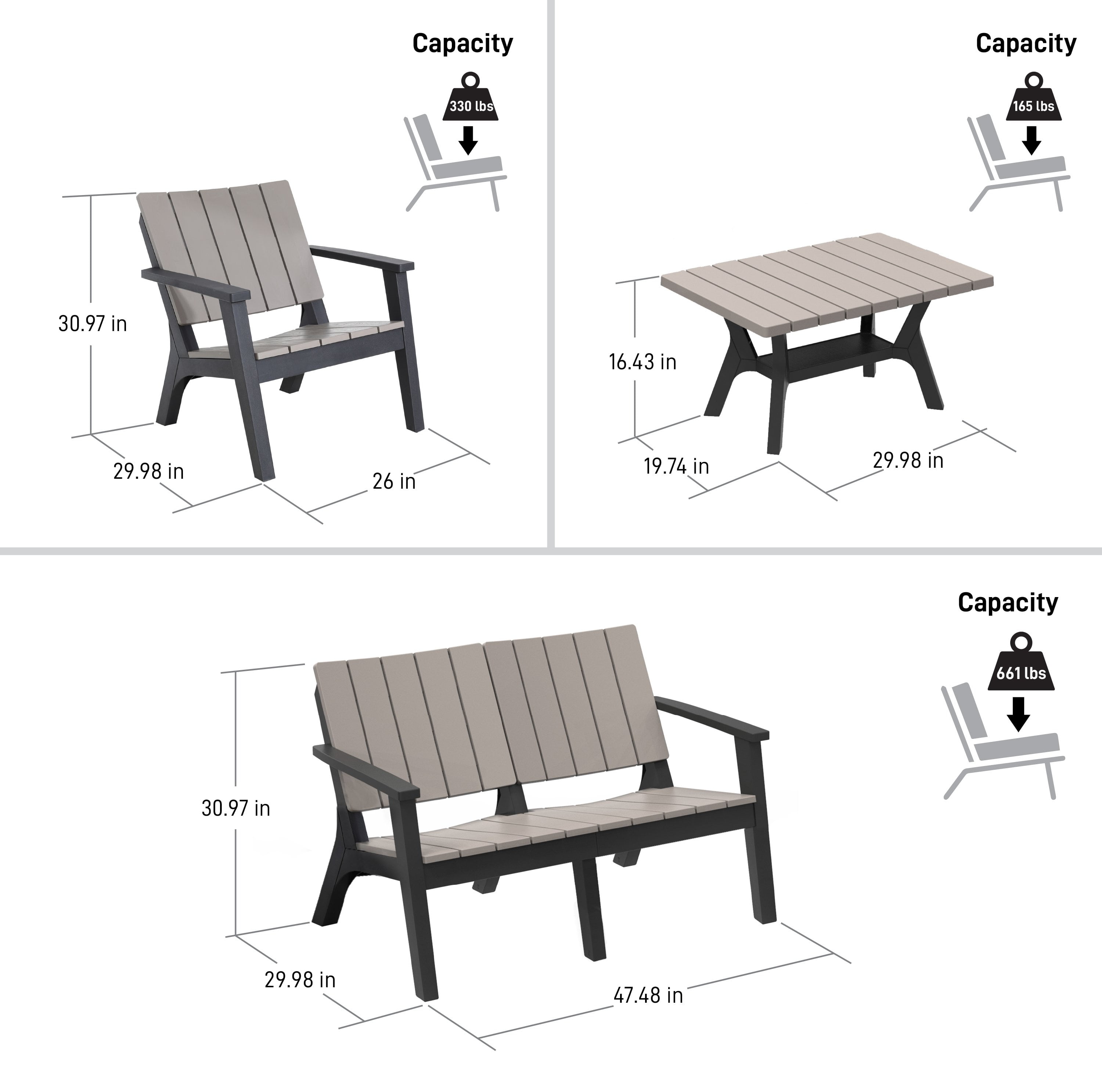 Durable Polypropylene, wooden-like brushed texture, looks like real wood Ships in 1 Box All weather and water resistant, UV protected, doesn’t rust or decay like regular outdoor furniture Includes two armchairs, one loveseat and a table Really easy to assemble, no special tools required Sturdy and stable structure Maintenance free, stress free Unique and innovative ergonomic design that offers superior comfort Seat Height: 15” inSeat Depth: 16.73” in – Loveseat capacity 661 lbs- Armchair capacity 330 lbs- Table capacity 165 lbs Effortless to move around or store away Product care: Hose off and wipe clean