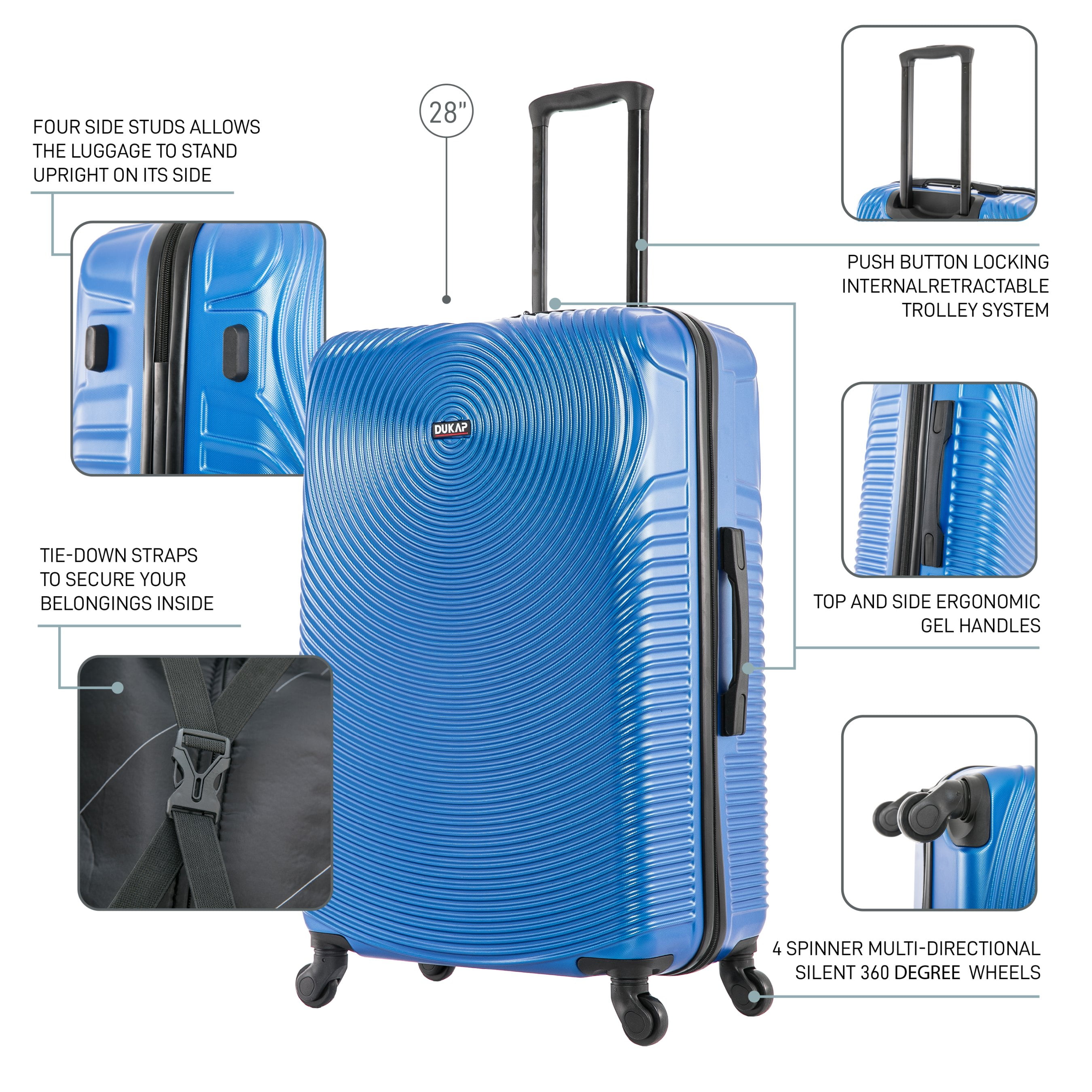 STURDY AND LIGHTWEIGHT: The lightweight shell of the travel suitcase makes this hard luggage easy to carry anywhere, It only weighs 10.59 pounds and is your perfect companion for any trip DURABLE AND TOUGH: The hard-flex body with the micro-diamond finish on the large checked hard suitcase makes it durable, strong, and stylish, with a scratch and water-resistant surface ORGANIZED AND SPACIOUS: The 28 inch hardside large checked suitcase luggage bag is perfect for long trips, The large checked luggage meets all the standards for most domestic and international flights across the world MANEUVERABLE AND CONTROLED: The trolley of the large checked suitcase has a push-button which makes the hardshell luggage easy to handle. The GEL handles provide a comfortable lifting HASSLE FREE TRIP: The 4 spinner luggage wheels from rolling luggage are silent with a 360° movement and max stability, DUKAP large suitcase will make you travel with comfort and style