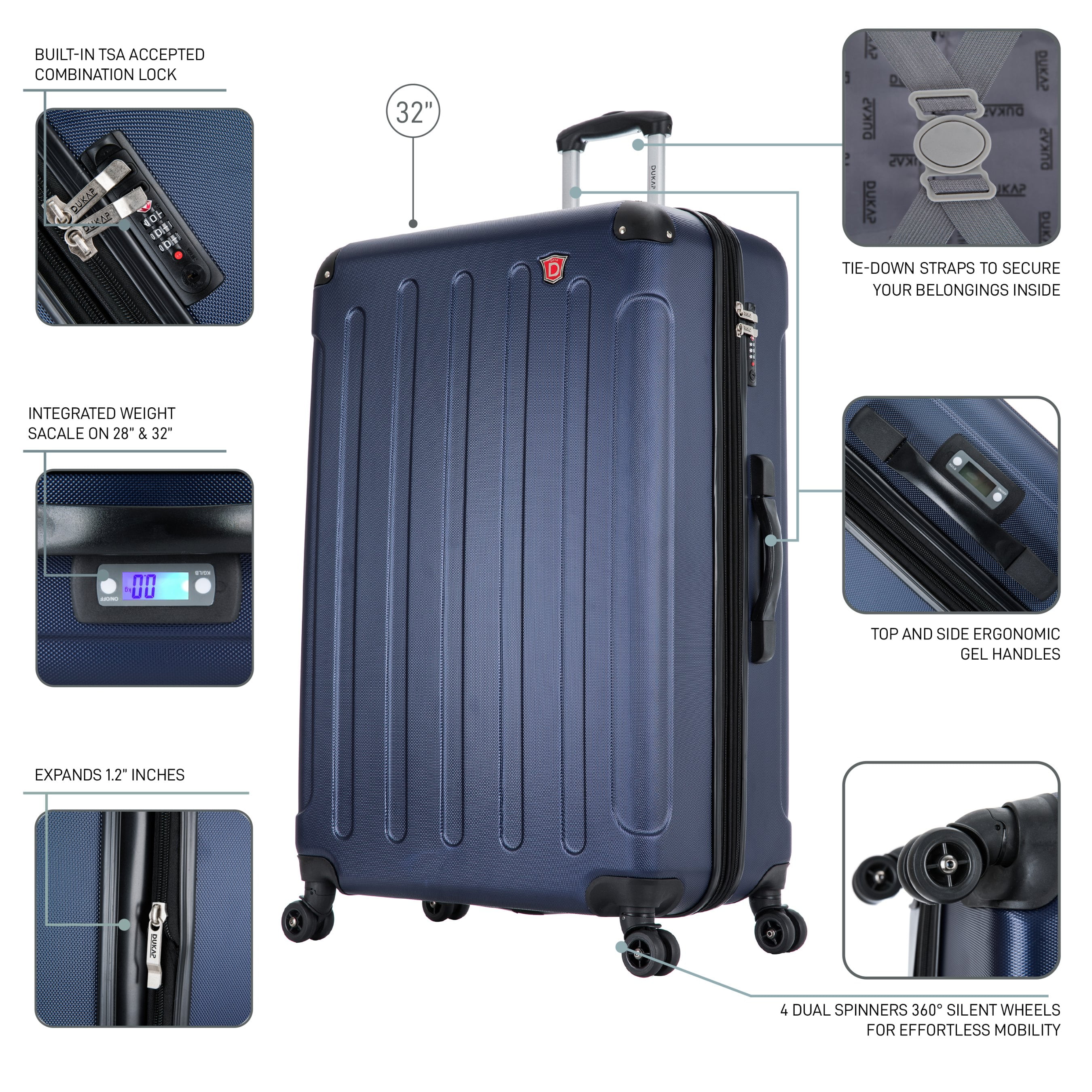 STURDY AND LIGHTWEIGHT: The lightweight shell of the travel suitcase makes this hard luggage easy to handle. They weigh 7.21, 10.7, and 13 pounds and they are perfect for storing all your things DURABLE AND TOUGH: The hard-flex body with the micro-diamond finish on the travel 3 pieces set bag hard suitcase makes it durable, strong, and stylish, with a scratch and water-resistant surface ORGANIZED AND SPACIOUS: The 20, 28, and 32 inch hardside set suitcase luggage bag is perfect for short and long trips, The suitcase set meets all the standards for most domestic and international flights across the world MANEUVERABLE AND CONTROLED: The trolley of the 3 pieces set suitcase has a push-button which makes the hardshell luggage easy to handle. The GEL handles provide a comfortable lifting HASSLE FREE TRIP: The 4 spinner luggage wheels from rolling luggage are silent with a 360° movement and max stability, DUKAP 3 piece set suitcase will make you travel with comfort and style