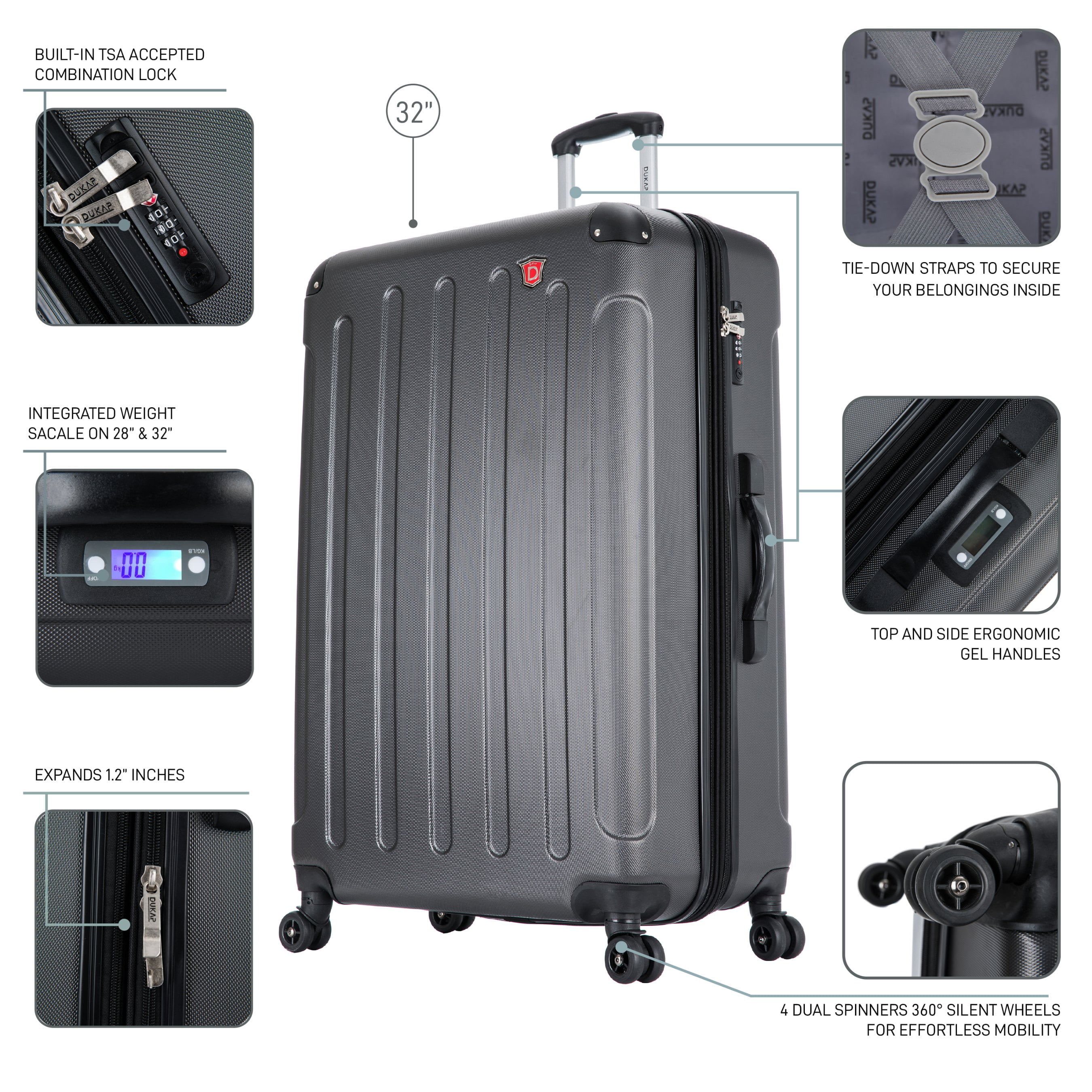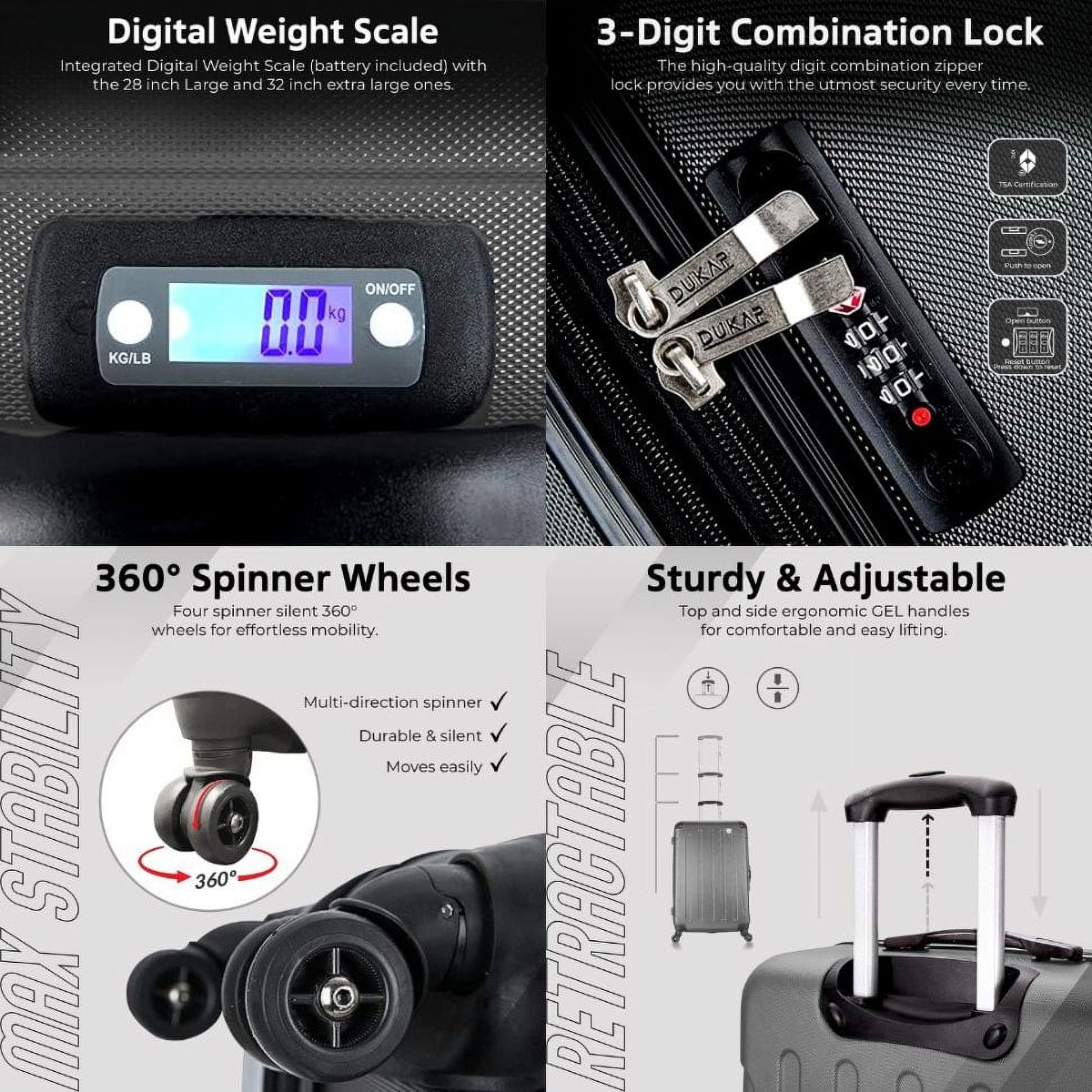 STURDY AND LIGHTWEIGHT: The lightweight shell of the travel suitcase makes this hard luggage easy to handle. It weighs 13 pounds and is perfect for storing all your things DURABLE AND TOUGH: The hard-flex body with the micro-diamond finish on the extra large checked bag hard suitcase makes it durable, strong, and stylish, with a scratch and water-resistant surface ORGANIZED AND SPACIOUS: The 32-inch hardside extra-large checked suitcase luggage bag is perfect for long trips, The extra-large luggage is designed to travel with a lot of your belongings while keeping everything organized MANEUVERABLE AND CONTROLED: The trolley of the extra large checked suitcase has a push-button which makes the hardshell luggage easy to handle. The GEL handles provide a comfortable lifting HASSLE FREE TRIP: The 4 spinner luggage wheels from rolling luggage are silent with a 360° movement and max stability, DUKAP extra large suitcase will make you travel with comfort and style