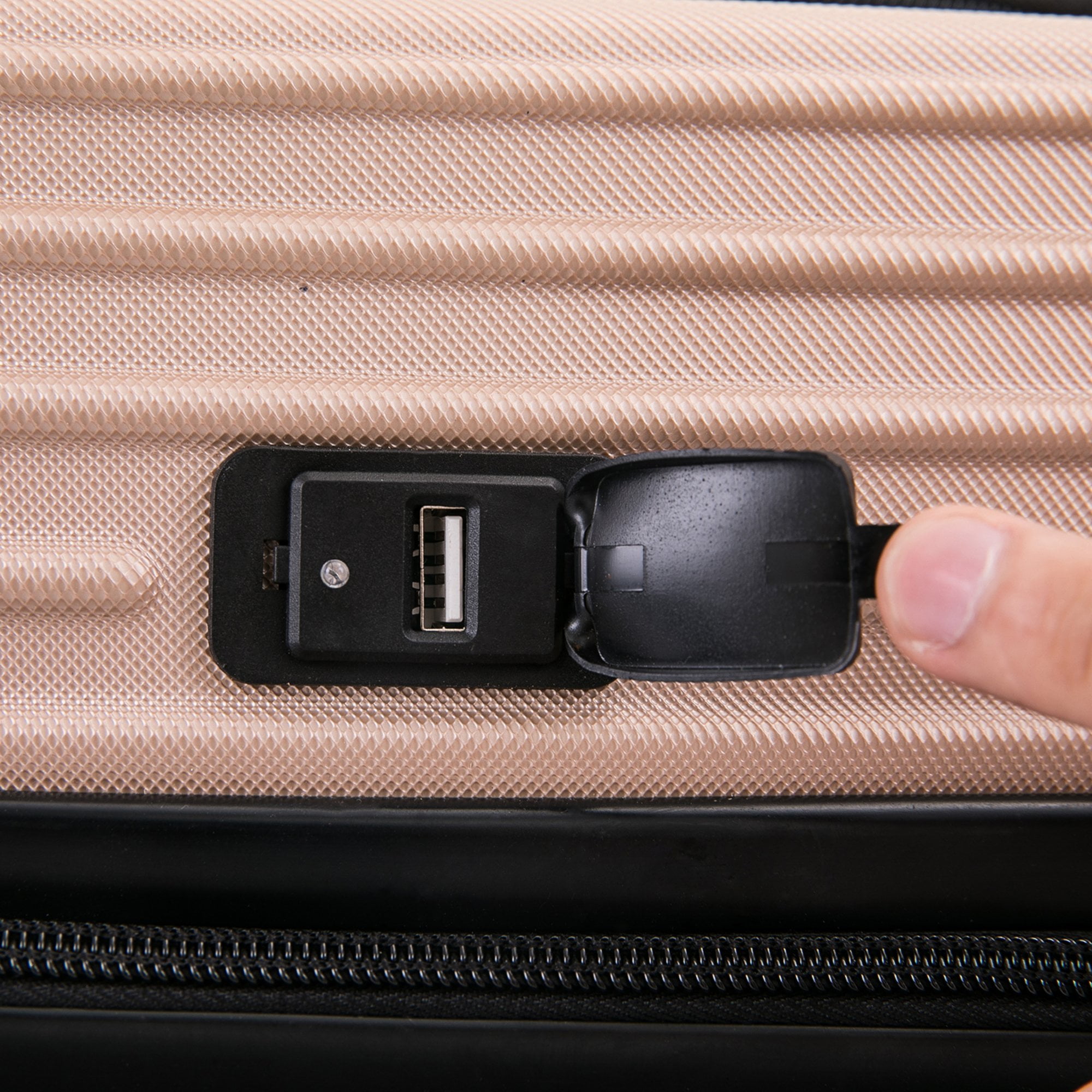 • Lightweight PC/ABS engineered material with a micro-diamond finish. The hard-flex construction offers maximum strength, durability and a water/scratch resistant finish. • 4 dual spinner 360° silent wheels for effortless mobility • Built-in 3-digit TSA approved combination lock. • Full interior fabric lining with zippered compartment on one side, Snap-on straps on the opposite side, one small internal pocket and one mesh zippered compartment for easy packing. • 20” inch carry-on features integrated USB Port provides access to power on the go (Power bank not included) (Complies with all Airline policies, TSA approved and safe to fly) • Protective corner bumpers to withstand higher impacts • Top and side ergonomic GEL handles for comfortable and easy lifting • 4 side studs that allow the luggage to stand upright. • Push Button Locking internal retractable trolley system • Smooth gliding zipper • 20” inch carry-on features a soft side pocket, able to store a 15.6” laptop or smaller Weight (pounds): 20” inch is 6.17 lbs. 24” inch is 7.05 lbs. 28” inch is 9.24 lbs. Interior Dimensions (WxDxH): 20” inch is 14.17 x 9.05 x 20.07 in 24” inch 16.54 x 11.02 x 24.01 in 28” inch is 19.24 x 12.20 x 27.95 in Exterior Dimensions (WxDxH): 20” inch is 15.35 x 9.84 x 23.22 in 24” inch 17.72 x 11.02 x 27.17 in 28” inch is 20.47 x 12.20 x 31.10 in Capacity: 20”: 42.1 L 24”: 71.7 L 28”: 107.7 L