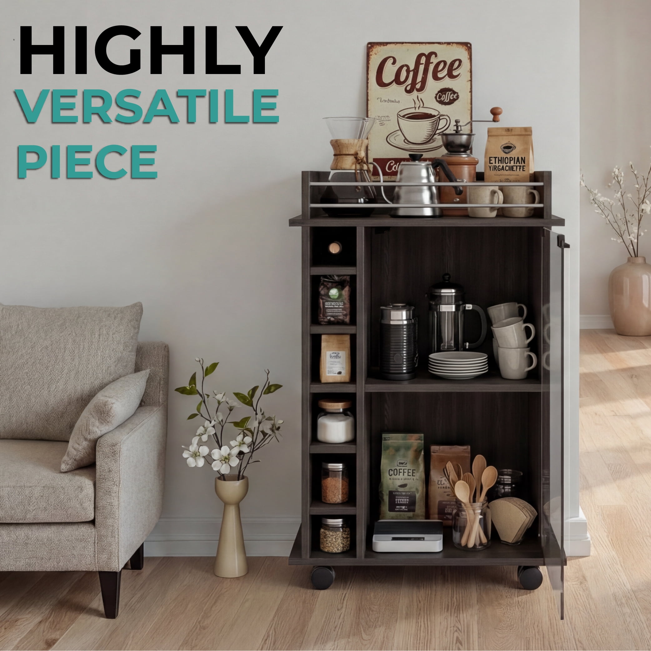 TUHOME Dukat Kitchen Bar Cart with Glass Door, Espresso