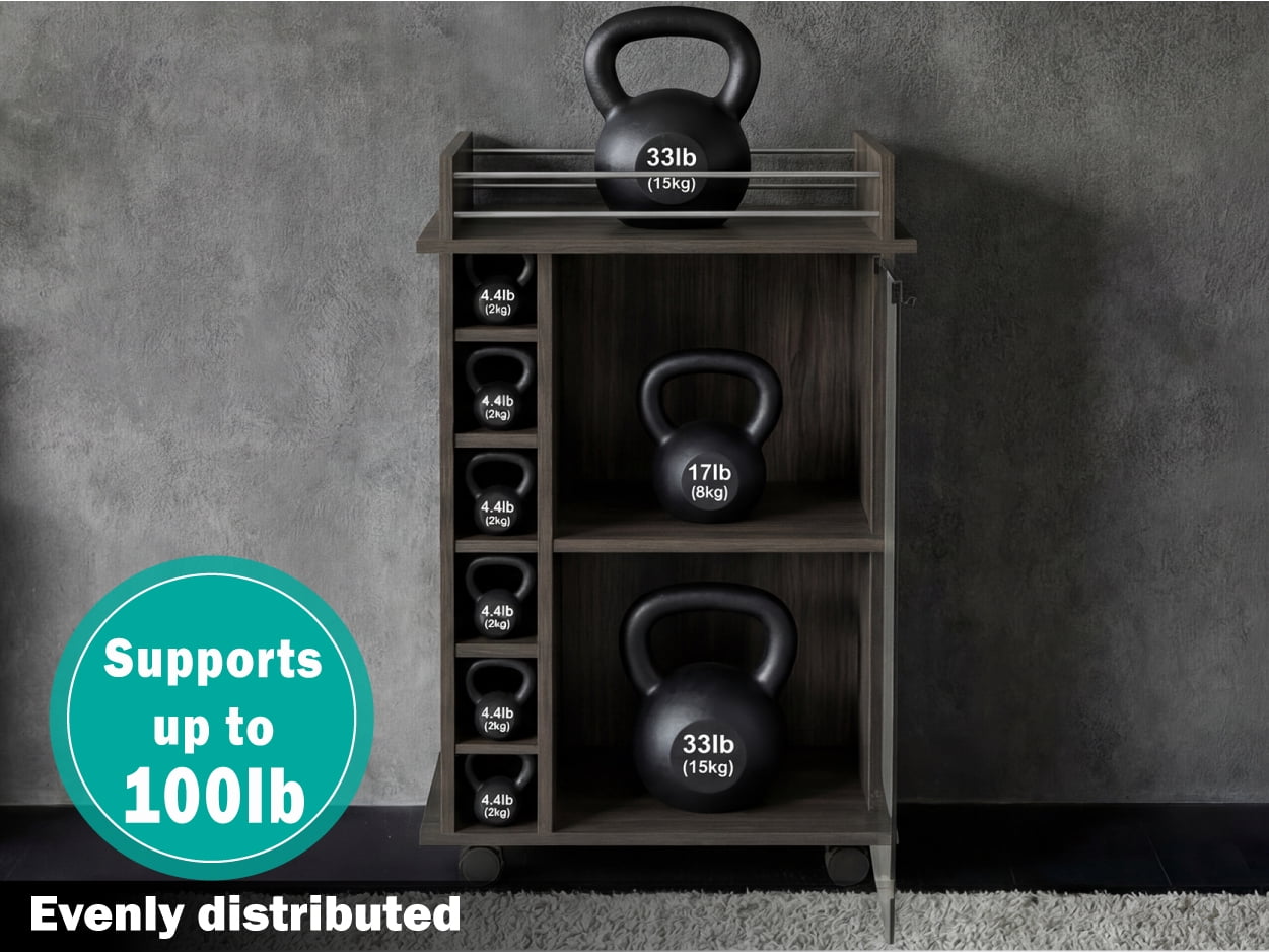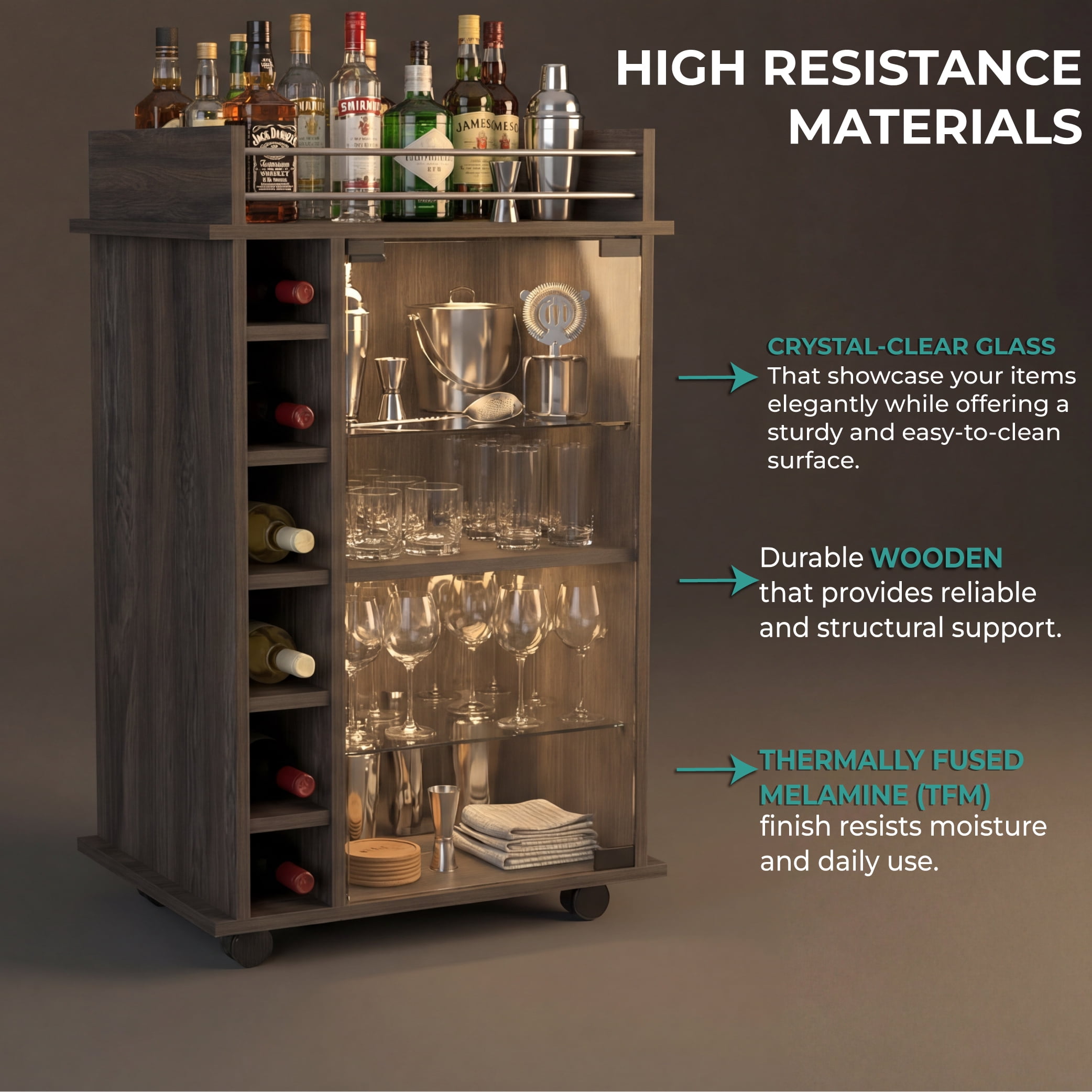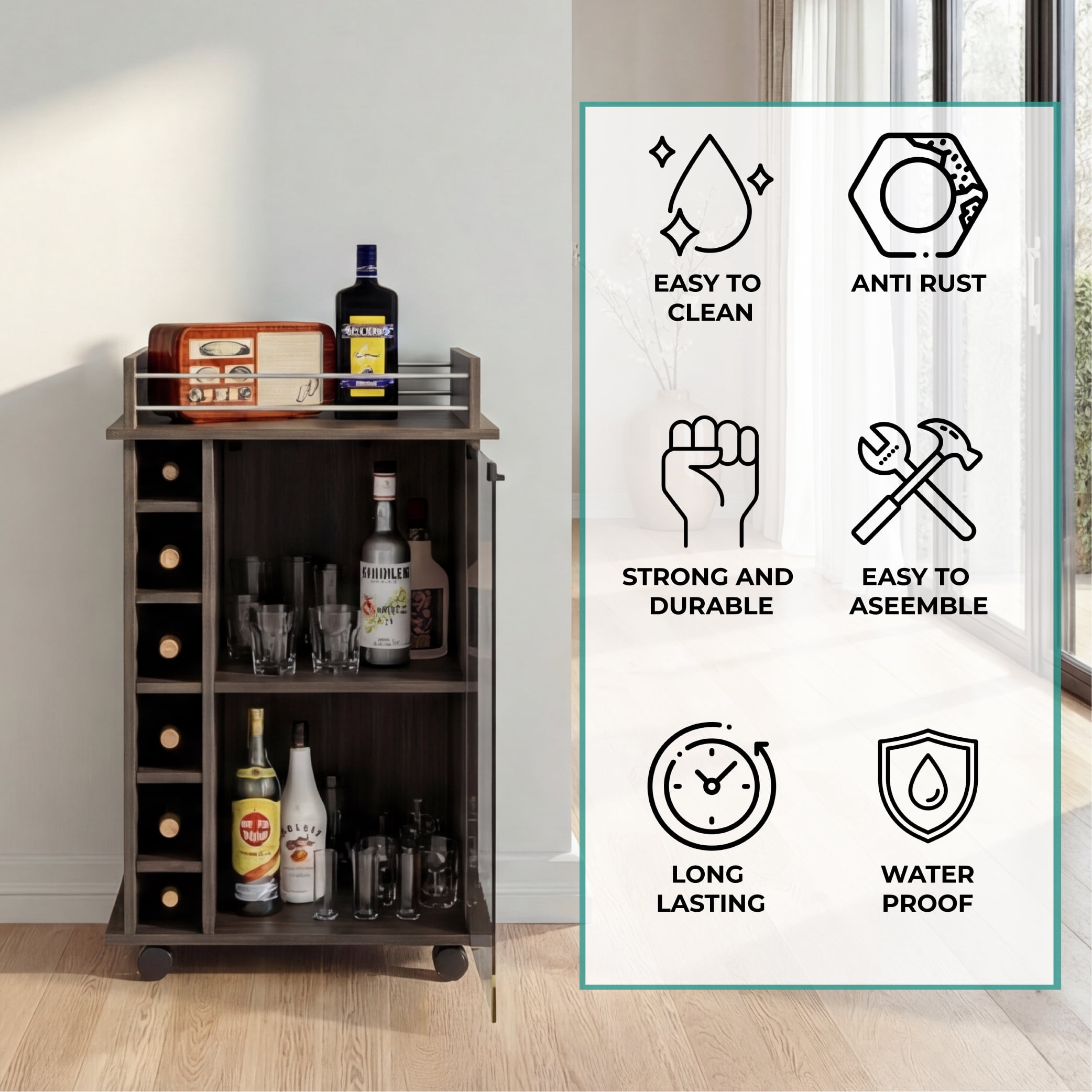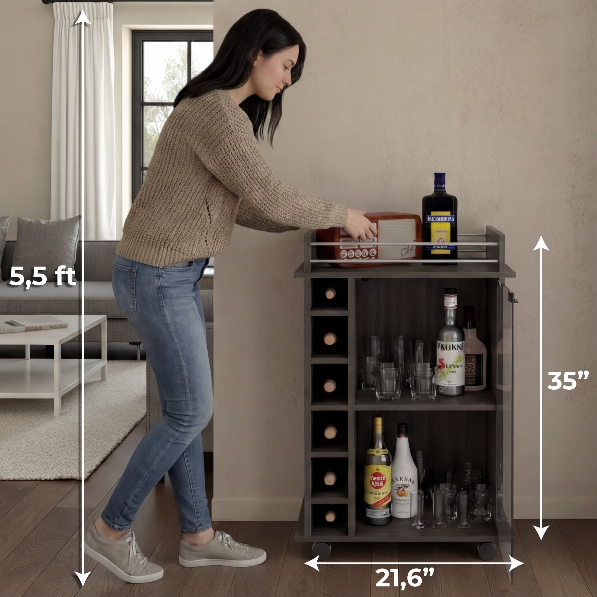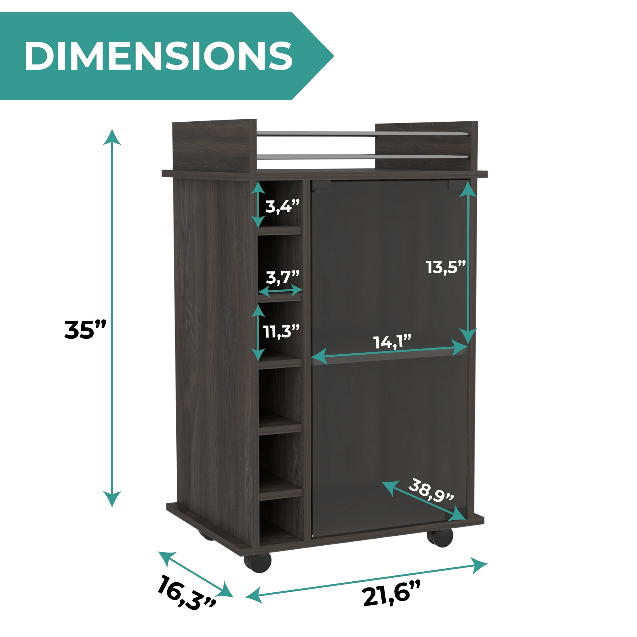 Dukat bar cart is perfect for preparing cocktails and displaying your favorite bottles of wine and liquor Provides plenty of room to prepare and serve drinks for your company 6 cubbies line the side of this bar cart to store bottles of wine or liquor Enclosed glass door with 2 shelves provide storage and display space Locking mechanism with 4 wheels lets you move this bar cart around the house Material: Particleboard Color: Brown Dimensions (L x W x D): 35 x 21.6 x 16.3 inches Weight: 49 pounds Manufacturer warranty: 2-year warranty