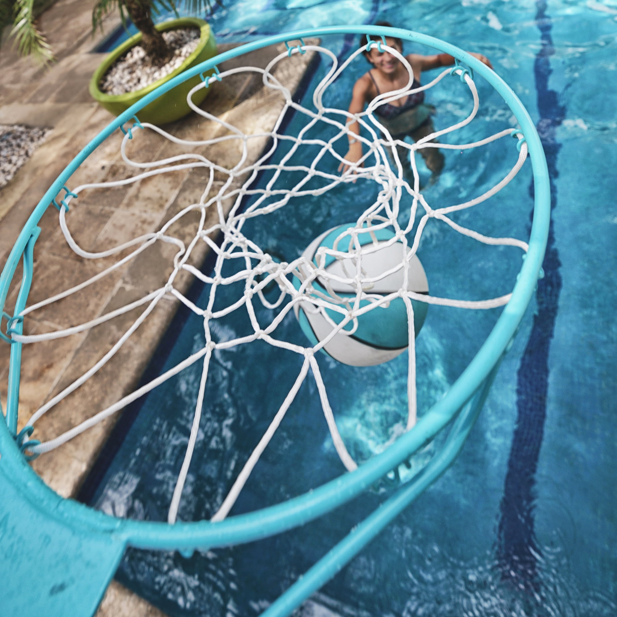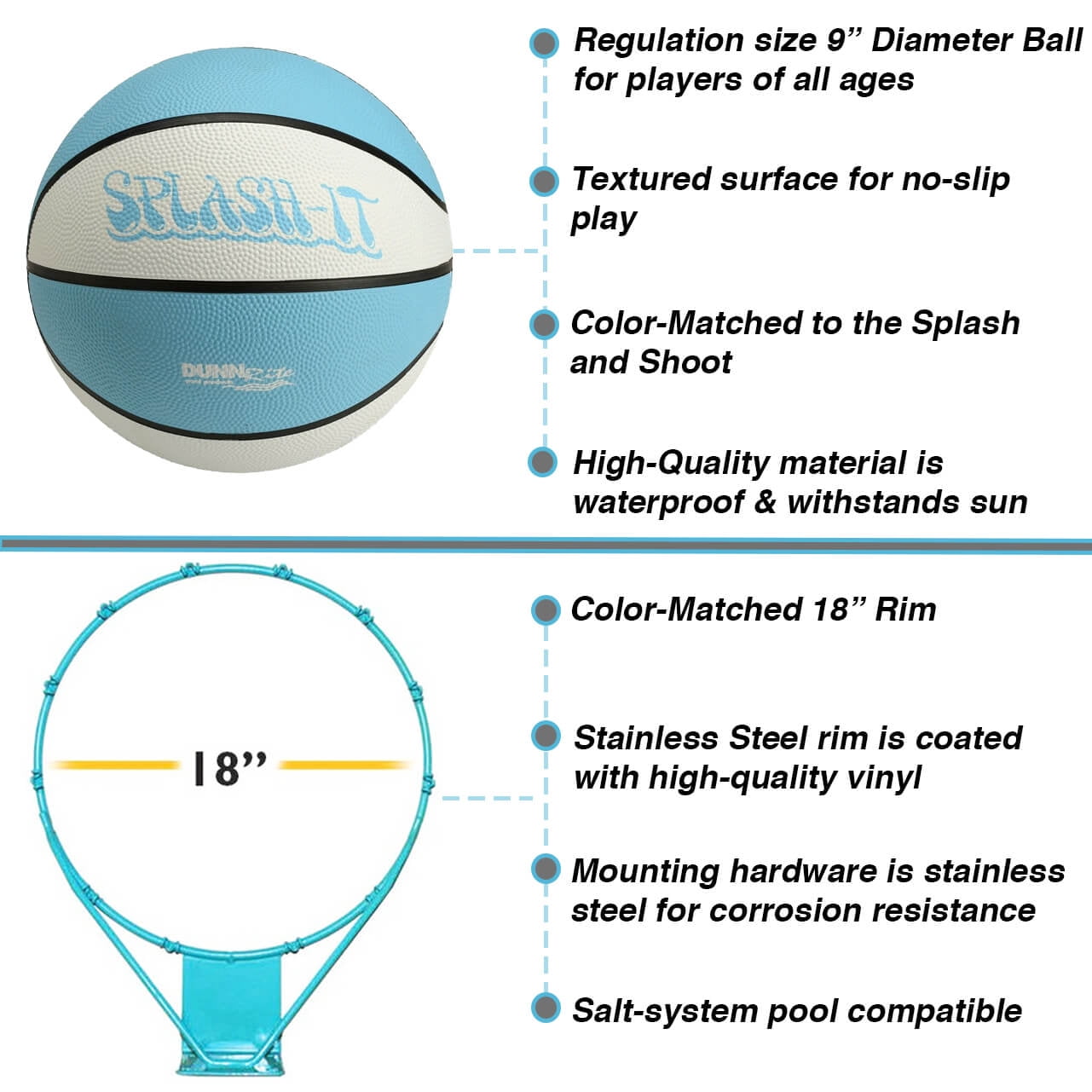 ADJUSTABLE RIM HEIGHT: From 23 in to 53 in above the ground, great for teens and adults. DURABLE WEATHER-RESISTANT BUILD: All components are made of anti-rust materials so the hoop can withstand various weather conditions. Salt-system compatible. 200 LB HEAVY-DUTY BASE: Rotational molded base holds up to 25 gallons of water, weighing 200 pounds when filled for sturdy play. PREMIUM POOL BASKETBALL HOOP: Pool basketball hoop offers endless fun; includes water-filled base, pole, rim, backboard, net, and 9-inch basketball. INDESTRUCTIBLE WHITE BACKBOARD: 29 x 43-inch weather resistant polycarbonate backboard frame withstands intense games while standing the test of time. WATERPROOF BASKETBALL INCLUDED: Includes color-matched waterproof full-size basketball. VINYL-COATED STAINLESS STEEL RIM: Vinyl-protected rim withstands water, chemicals and salt. DUNN-RITE PRODUCTS MADE IN THE USA: Made in Indiana, USA using high-quality components and craftsmanship since 1983. Buy with confidence!