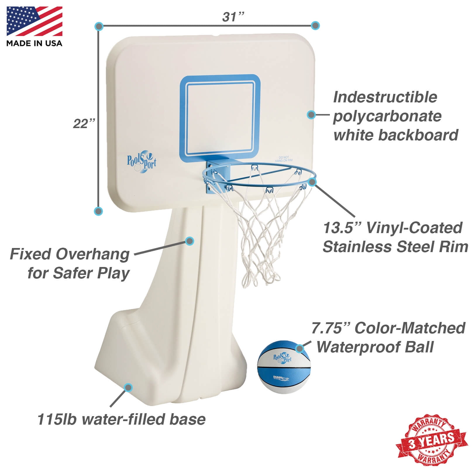 Bring endless aquatic fun to your backyard with the Dunn-Rite Pool Sport Water-Filled Pool Basketball Hoop. Featuring a sturdy 115-pound water-filled base, a 13.5-inch stainless steel rim, and a 22 x 31-inch polypropylene backboard, this pool basketball set is built to withstand intense games. The hoop stands at a convenient 36-inch height, making it accessible for players of all ages. Includes a color-matched basketball for immediate play. Easy to assemble around saltwater and freshwater pools, this durable and weatherproof basketball hoop will add excitement to your pool activities.