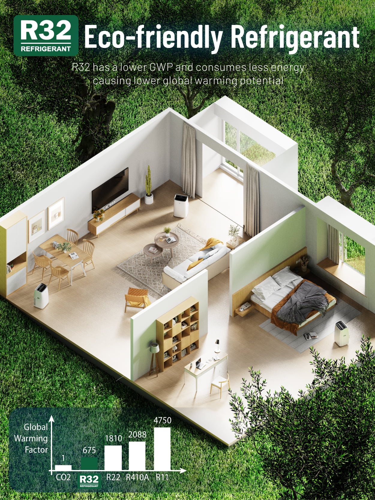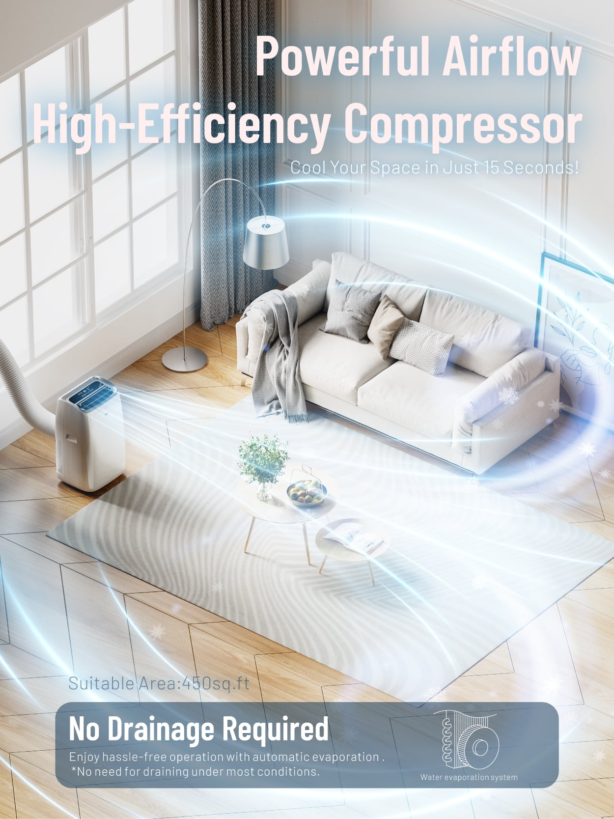 Our DuraComfort 14,000BTU(ASHRAE) /10,200BTU(SACC) portable air conditioner is your best friend during the summer months, supplying cool, free-flowing, and comfortable air 24/7 for rooms up to 450 sq ft. Our portable cooler (14.06″ x 16.5″ x 27.09″) has 3 functionalities all in one: fan, dehumidifier, and cool. Our portable air conditioner comes with a power cord and plug storage for optimal convenience and uses R32 refrigerant for no Ozone depletion. Truly, one of the best room air conditioners!