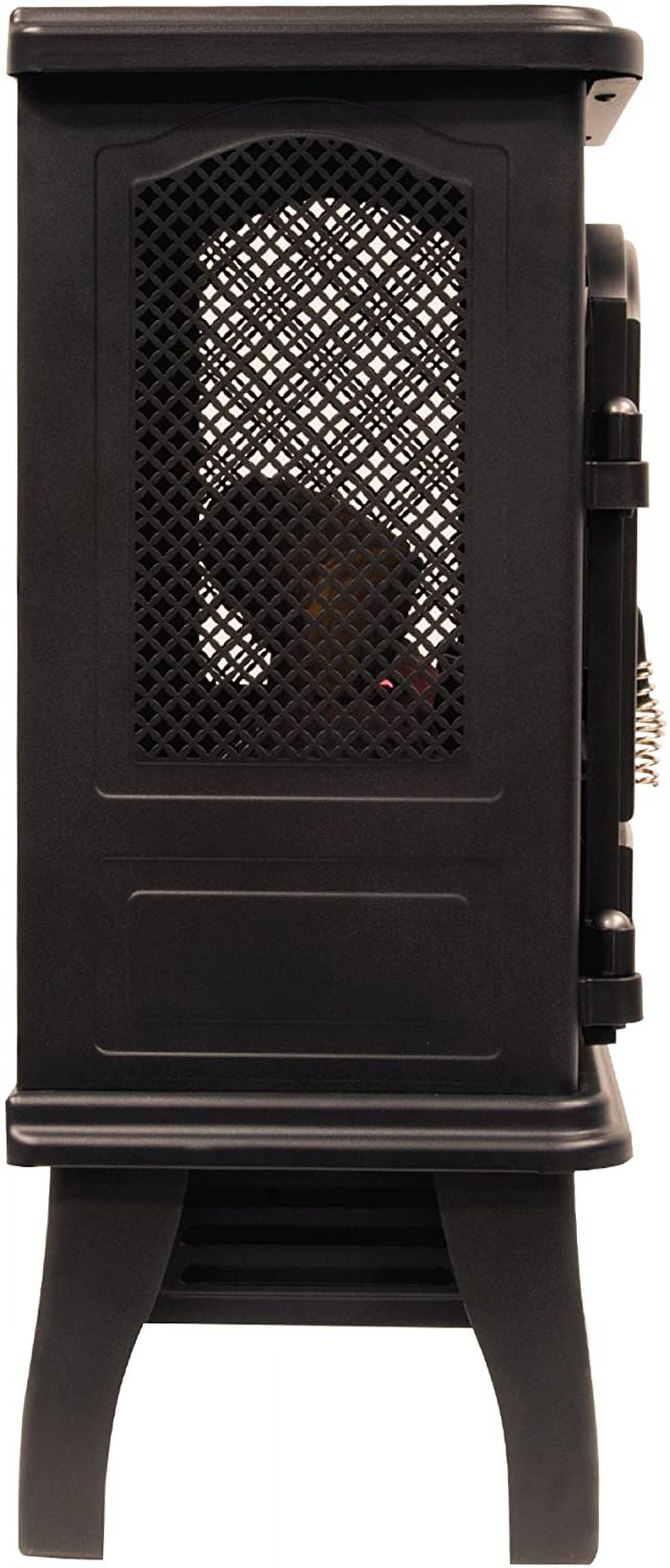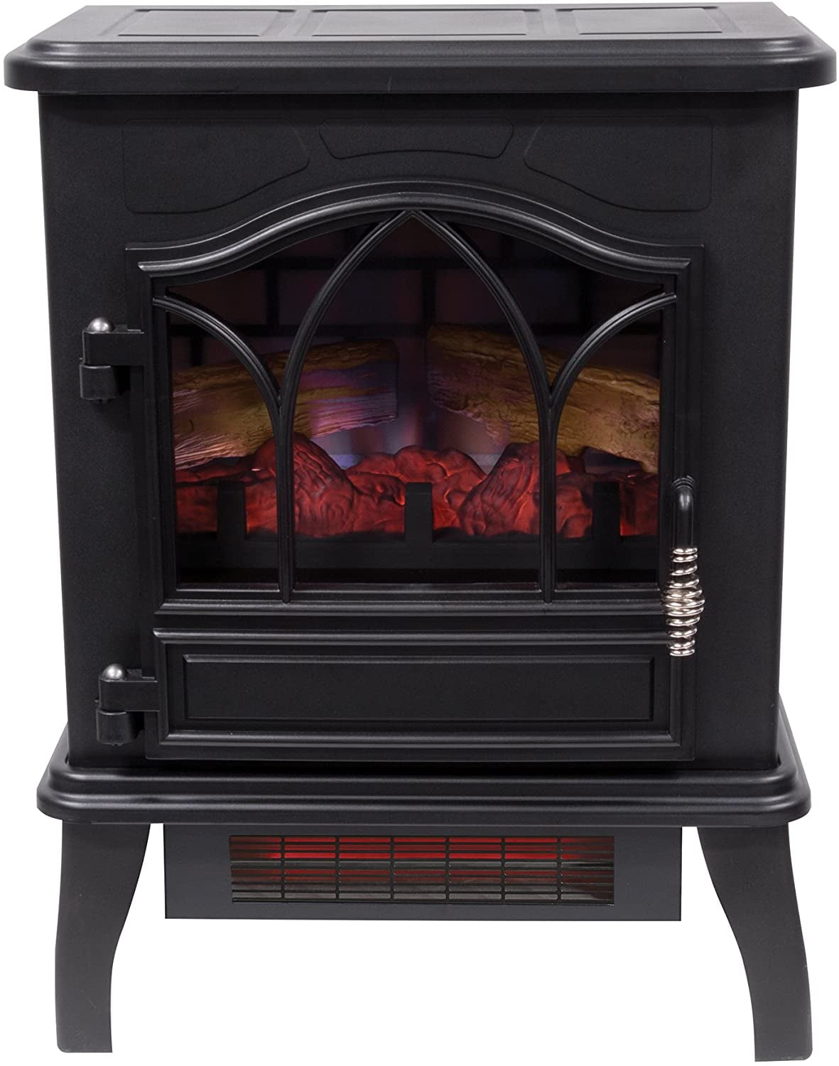 Quality metal construction Beautiful & realistic 3D flame effect Compact & charming “old world” design 3D Infrared Quartz Electric Fireplace Stove Heater, Black 5,200 BTU heater provides supplemental zone heating for up to 1,000 square feet Patent pending 3D flame effect technology features realistic flames that dance on and behind the logs, with adjustable brightness The infrared quartz heat helps to maintain the natural humidity in the air, resulting in comfortable heat without drying out the room’s air An adjustable thermostat allows you to regulate the temperature of the room Safe for use around children and pets Realistic flame effect with glowing log and ember bed can be operated with or without heat, providing the ambiance of a gentle rolling fire all year long Black metal body, operable door with mullions, and arched frame detailing The portable unit is easy-to-assemble, simply attach the legs, plug it in and it is ready to heat Requires no venting or gas lines, includes an owner’s manual 1 year limited CSA safety certified