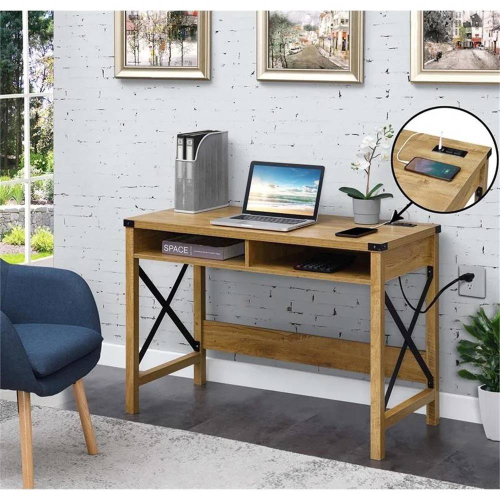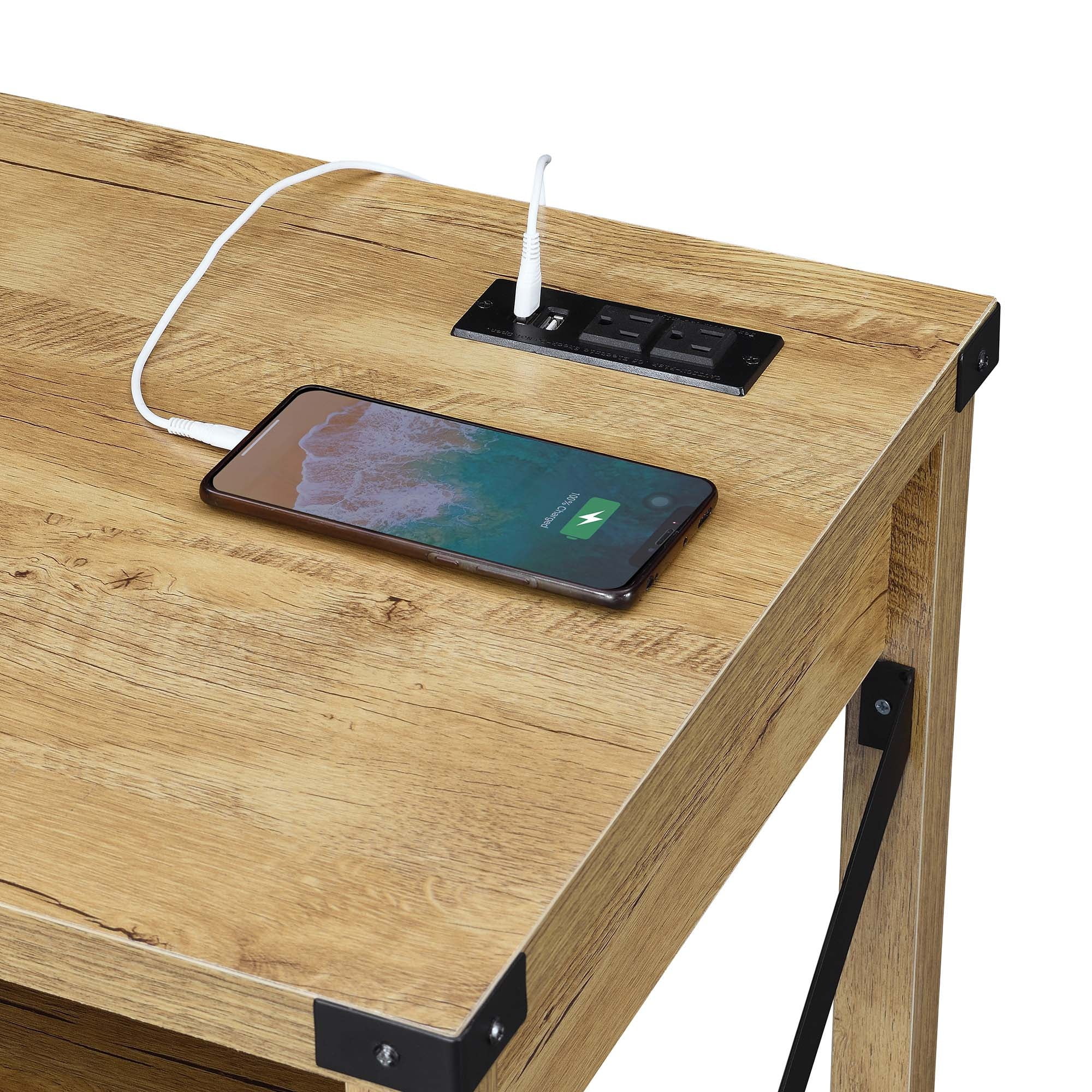 Add functionality to your industrial-styled home with the Durango 42-Inch Desk with Charging Station by Convenience Concepts. Featuring a built-in charging station on the tabletop surface for convenience and easy accessibility. The charging station includes two USB ports and two standard outlet plugs which can easily charge your phone, tablet, or laptop. The versatility of the exposed built-in station allows for multiple devices to sit on the tabletop without the damaging or twisting of cords. The power supply cord is six feet in length, giving you the room you need to display your desk where you choose. Engineered from particle board and powder-coated metal, this piece is built for long-term durability. Pair with more beautiful items from the Durango Collection by Convenience Concepts; each sold separately. Features: Part of the Durango Collection Two Standard Plug Outlets & Two USB Ports Six-foot Long Power Supply Cord Crafted from Particleboard and Powder-Coated Metal (L) 42 in. x (W) 19.75 in. x (H) 30 in. Beautiful light English oak wood finish with black metal frame and hardware Specifications: Product Dimensions: (L) 42 in. x (W) 19.75 in. x (H) 30 in. Product Weight: 47
