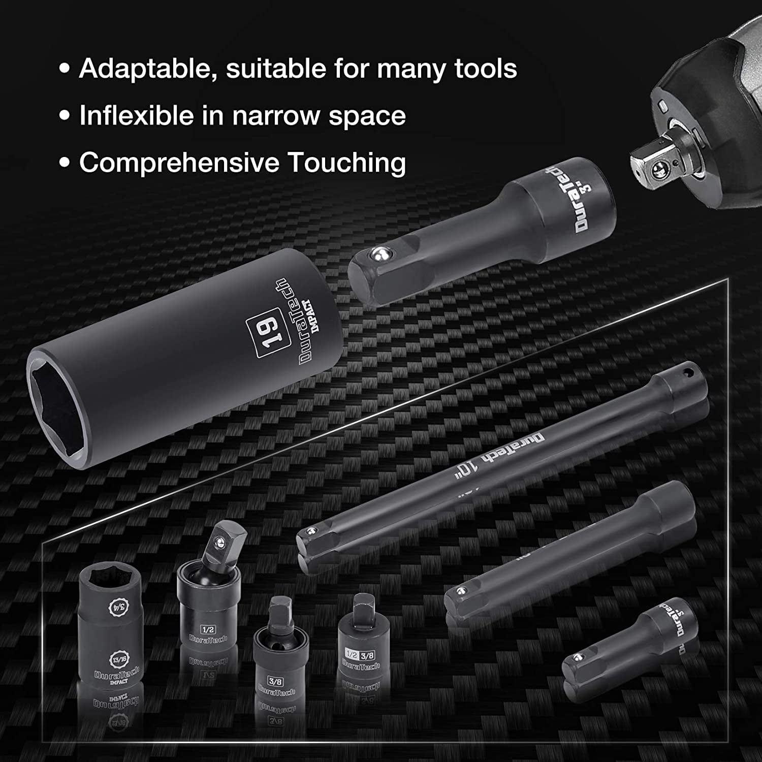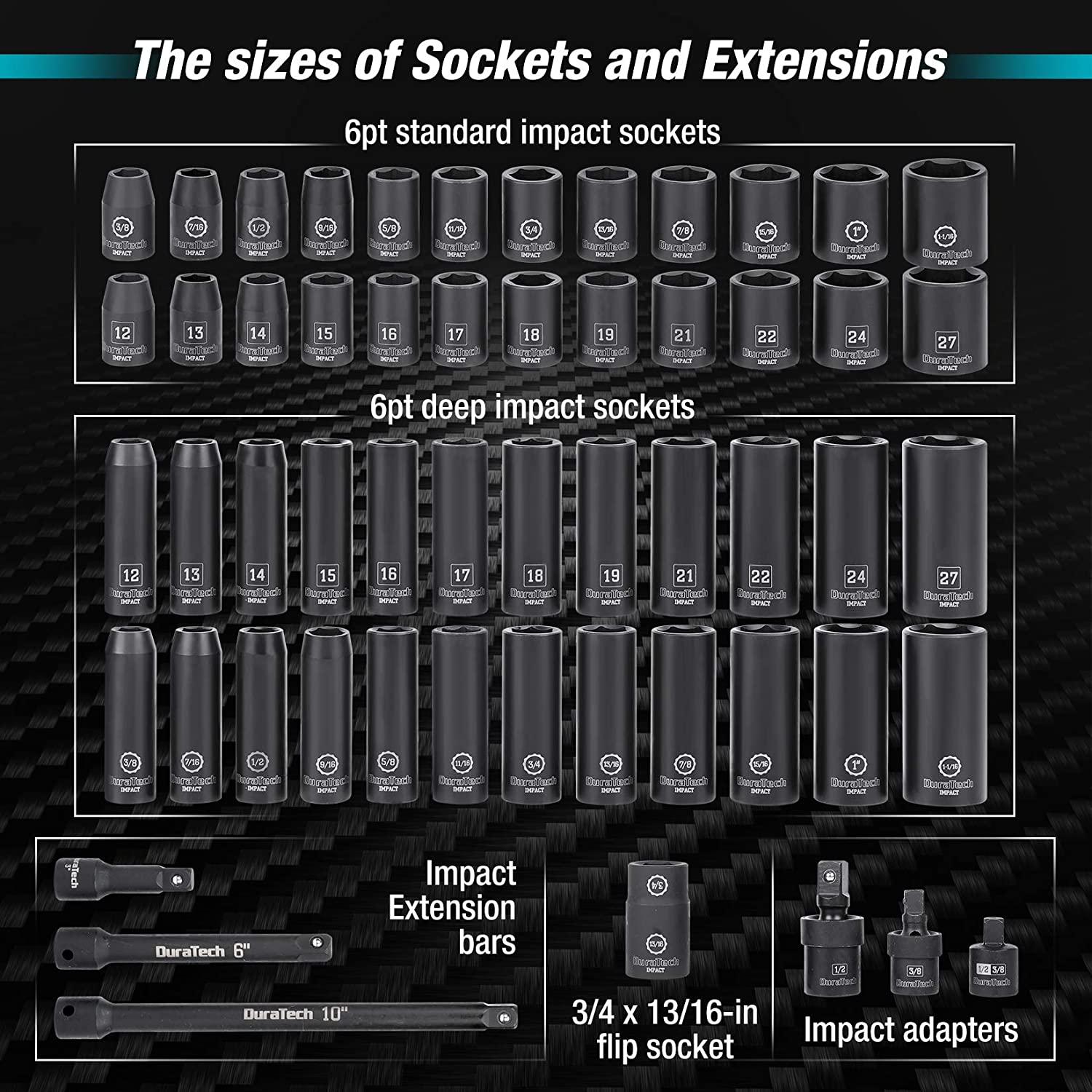 DURATECH 55-Piece Socket Set, 1/2’’ & 6 Point Impact Socket Set, 7 Accessories Included, 24 Both Standard Impact Sockets and Deep Impact Sockets in SAE (3/8’’ to 1-1/16’’) & Metric (12 to 27mm)