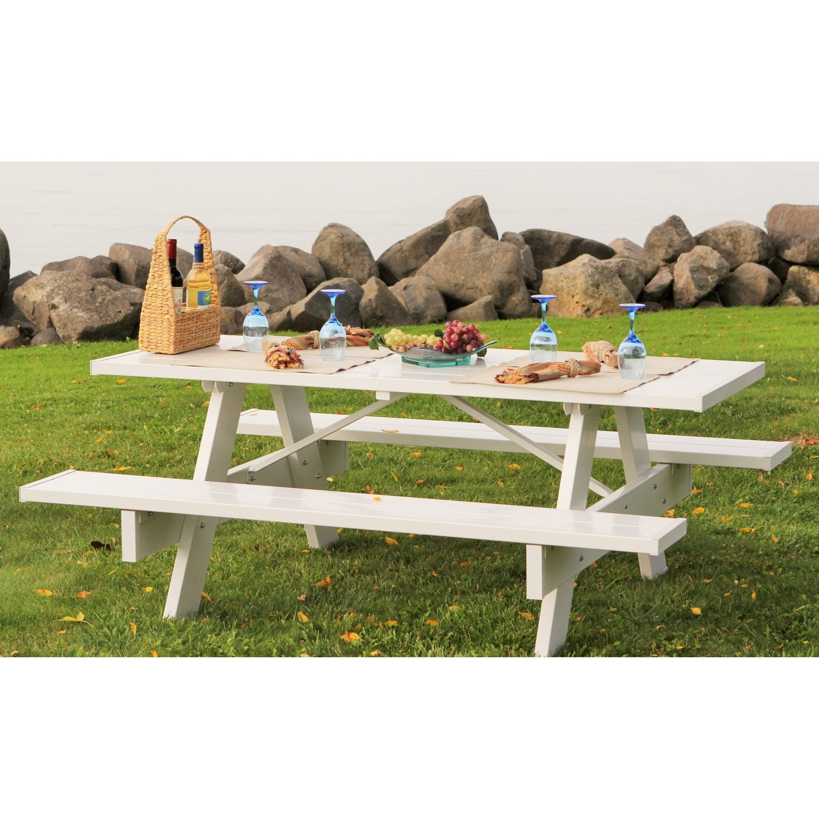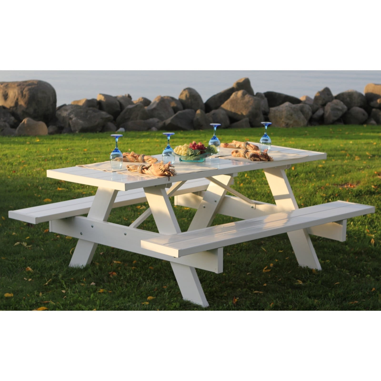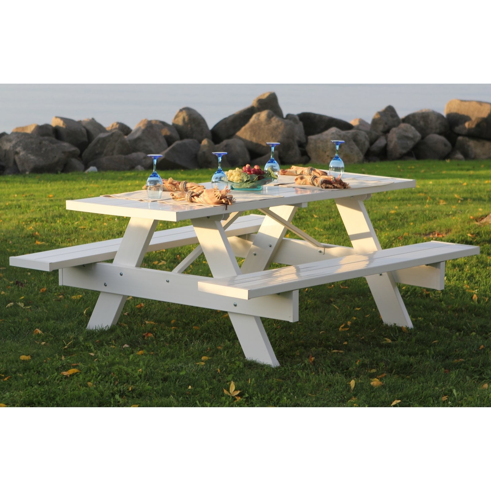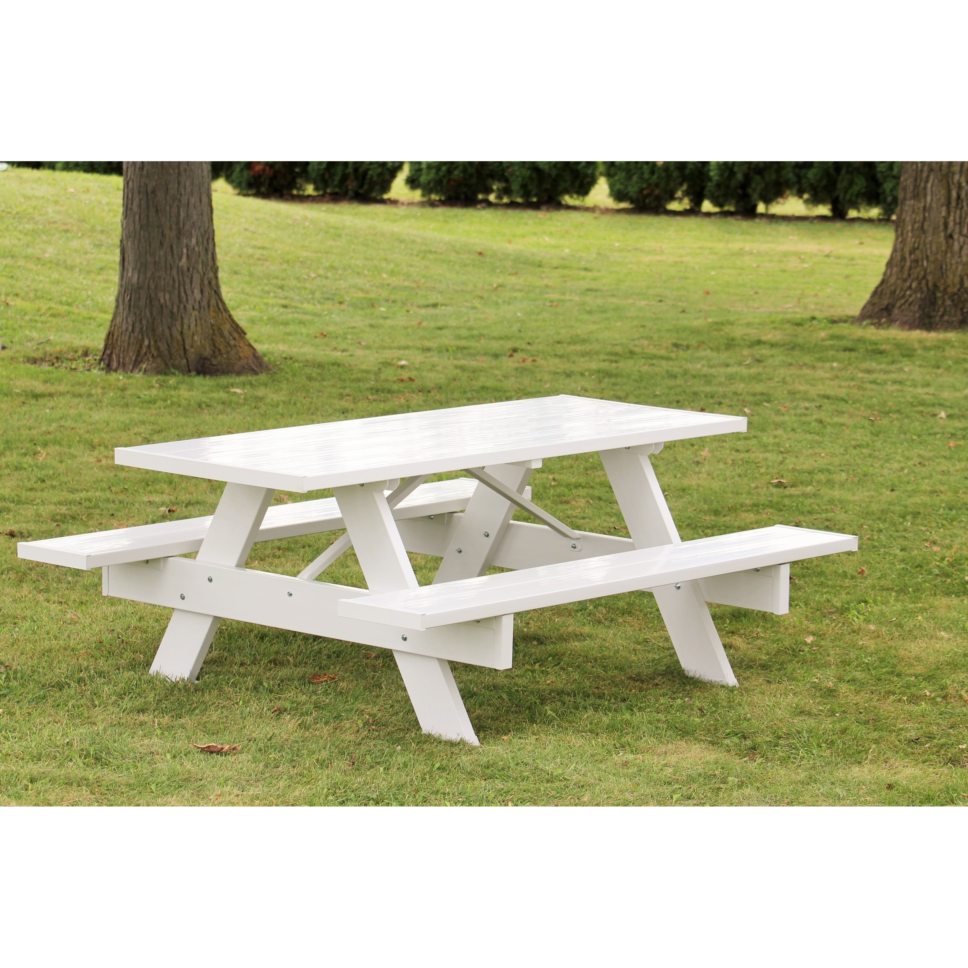 The DuraTrel Traditional 6′ White VinylPicnic Table is ideal for creating an idyllic setting without the hassle of constant maintenance. This picnic table features a classic slatted design and attached benches, which makes it easy to move around the yard for mowing and rearranging. Constructed of UV-protected PVC vinyl that resists fading, cracking, chipping, and peeling, this eliminates the need for sanding, staining or painting. For added stability and strength, the benches are reinforced with wood inserts.
