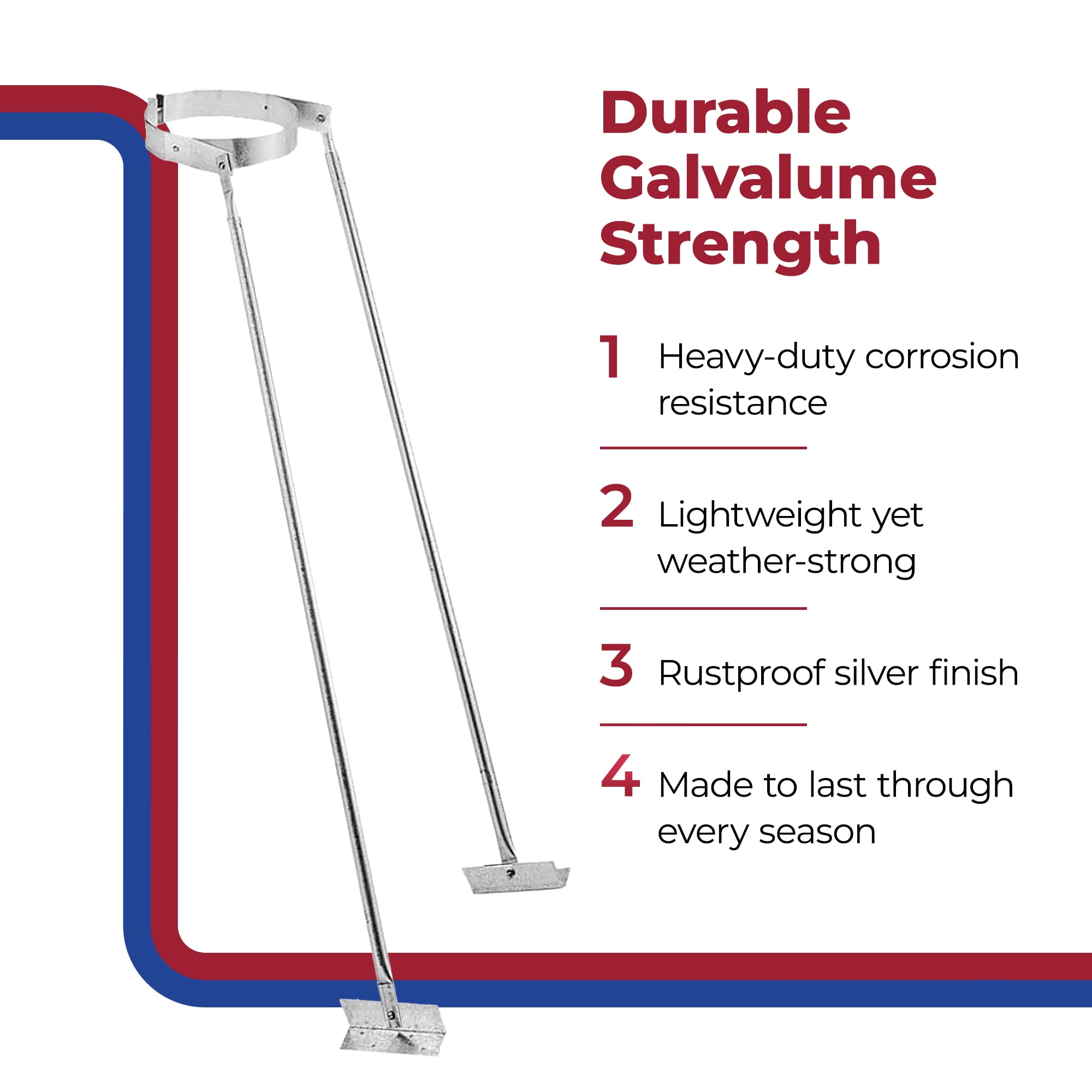 Extended roof bracket protects your chimney pipe from wind, snow, and other outdoor elements all winter long DuraPlus line features triple-wall ceramic layered pipes and fire-safe supports that keep your chimney and home safe Secures a DuraPlus pipe to your roof when extended more than 4 feet above the roofline Galvalume construction is lightweight, durable, resistant to corrosion, and energy-efficient for maximum longevity Support legs adjust from 67 inches up to 114 inches for optimal stability in tough weather conditions Includes 6-inch diameter ring and mounting brackets for quick and easy installation Material: Galvalume Color: Silver Diameter: 6 inches Height: 67 to 114 inches Weight: 10.4 pounds Manufacturer warranty: Limited-lifetime warranty