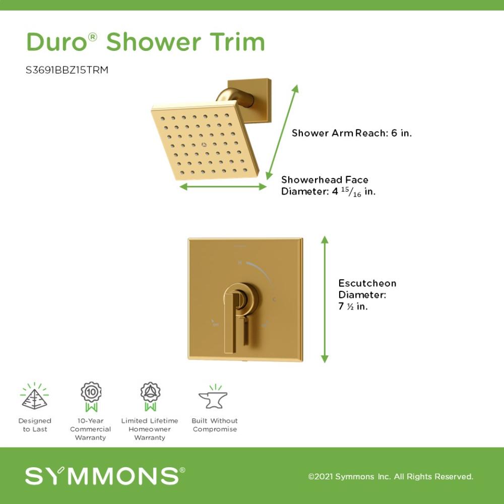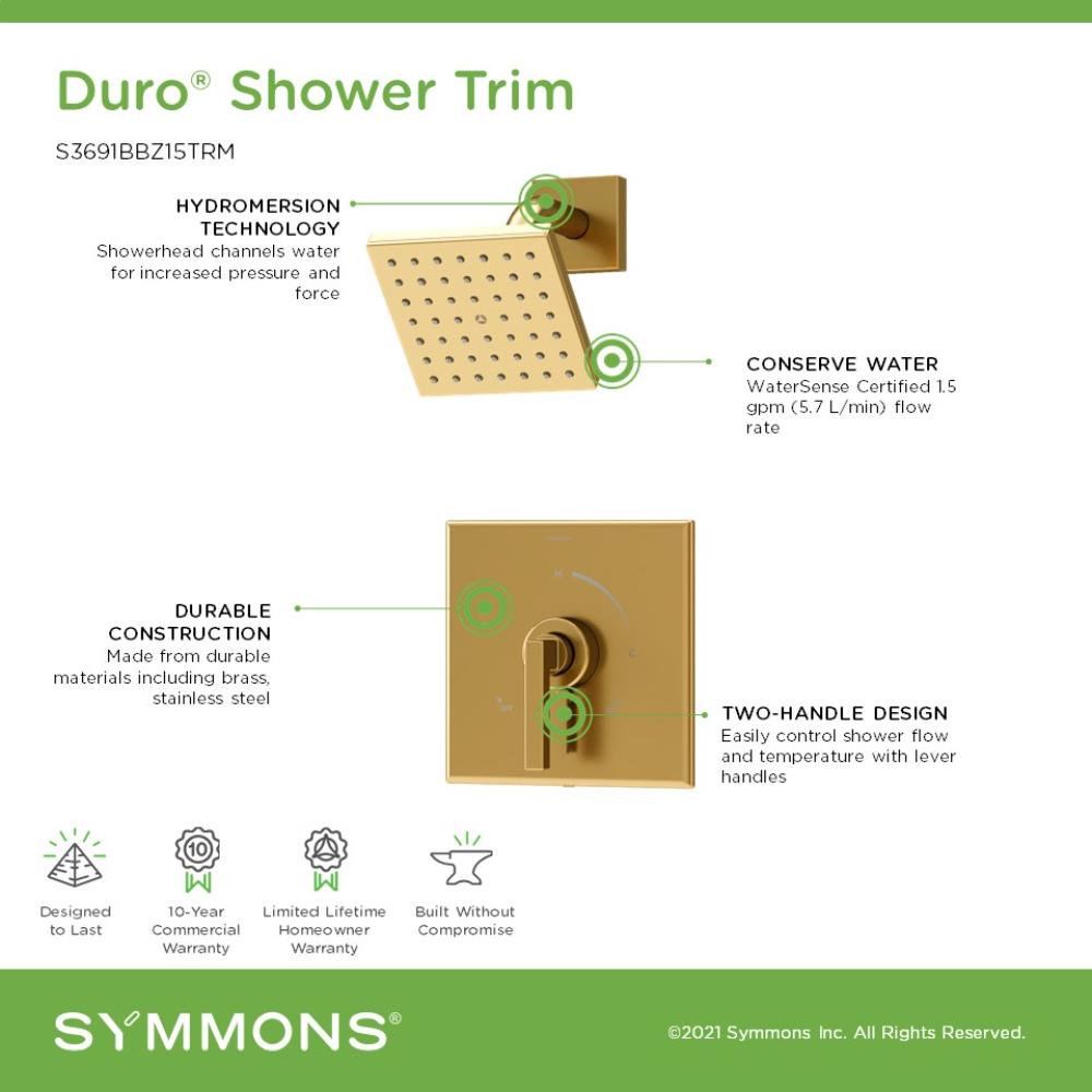 Crafted with precision, this Duro Single Handle Wall Mounted Shower Trim Kit with Volume Control boasts a scratch resistant finish over solid metal, ensuring enduring beauty in your bathroom. This comprehensive kit includes all you need for a luxurious shower experience: a showerhead, shower arm, escutcheon, shower lever handle, and integral volume control handle to adjust the shower water volume. Enjoy effortless customization of water temperature with the ADA compliant lever handle, featuring hot and cold indicators on the solid brass valve cover plate. Plus, the WaterSense certified single mode showerhead conserves water at an eco friendly low flow rate of 1.5 gallons per minute. The showerhead is powered by HydroMersion technology, channeling water for increased pressure and force, resulting in a spray pattern with 49 individual nozzles for complete coverage. Elevate your bathroom with the Symmons Duro Collection and enjoy the perfect fusion of style and functionality, backed by our limited lifetime consumer warranty.