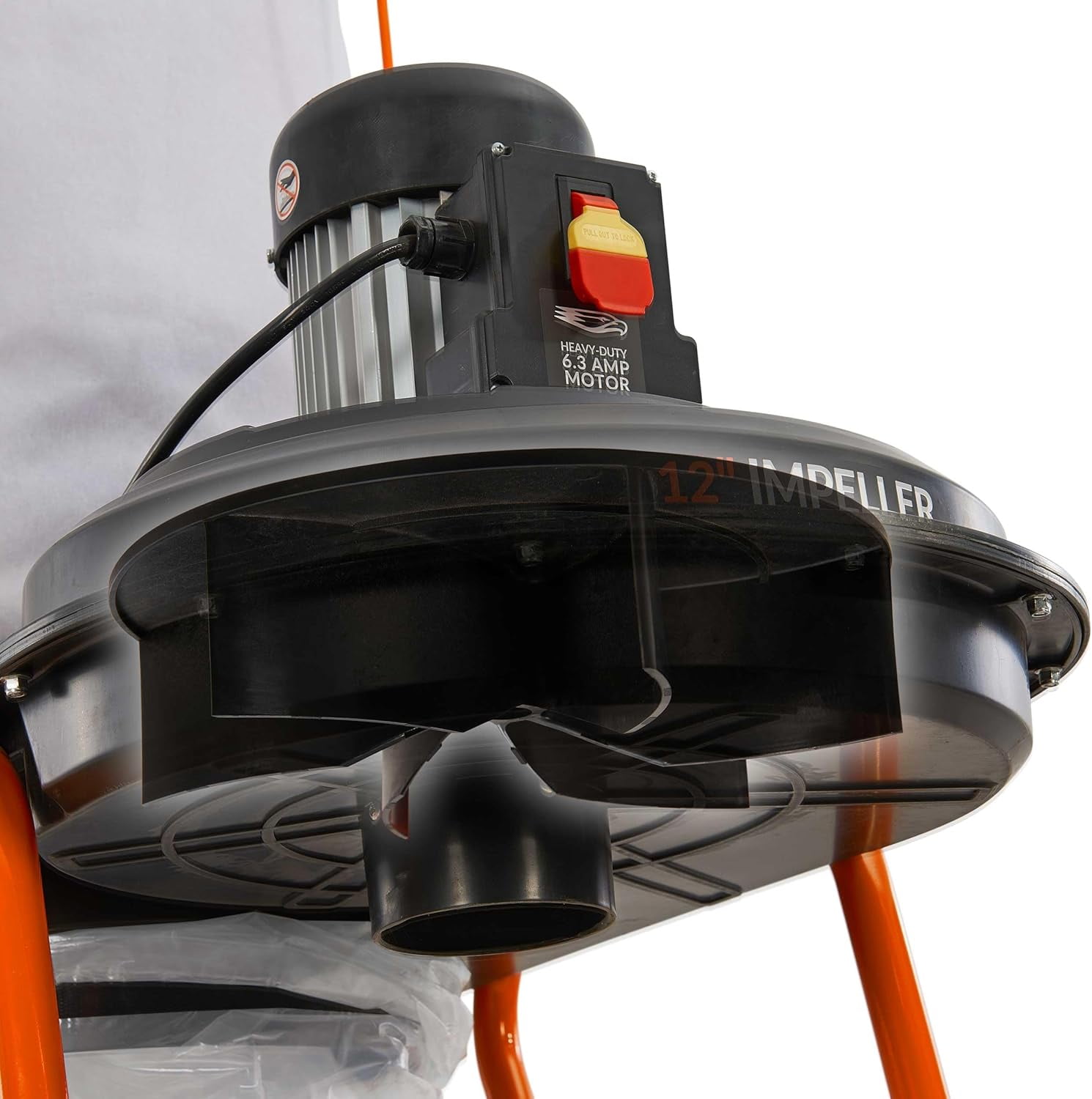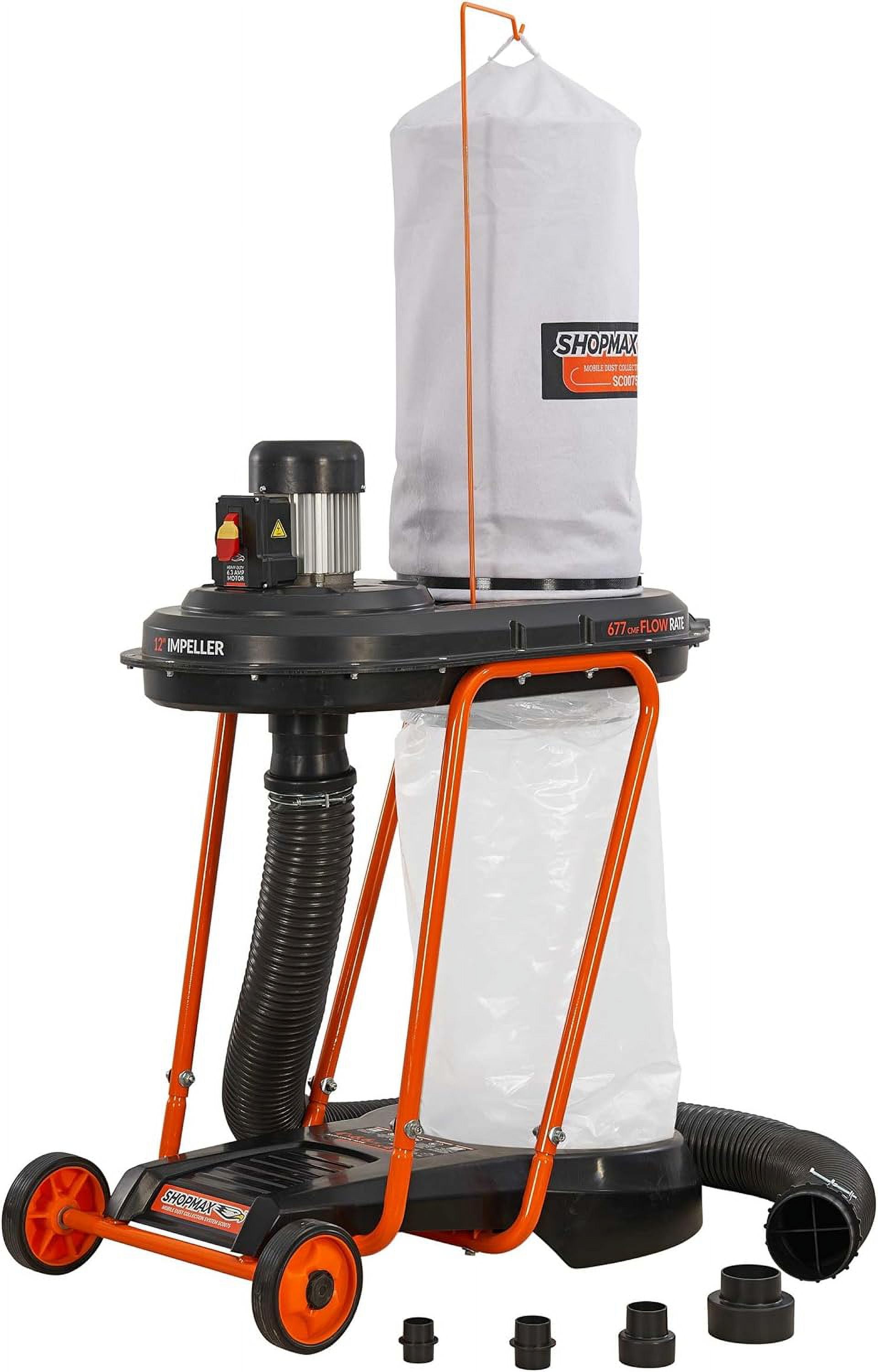 Powerful 6.3-amp motor delivers a maximum airflow capacity of 677 CFM for a greater suction capability. 12 impeller offers a high air flow capability which contributes to an increased efficiency and overall dust collection performance. Holds up to 20 Gal. of dust to help keep your space clean and organized. 4 hose adapters allow for the connection to a range of woodworking machines tools and facilitate efficient dust collection at the source. Sturdy construction ensures durability. Easy operation with a convenient on/off switch. 2 wheels and an onboard carrying handle for an easy transportation.