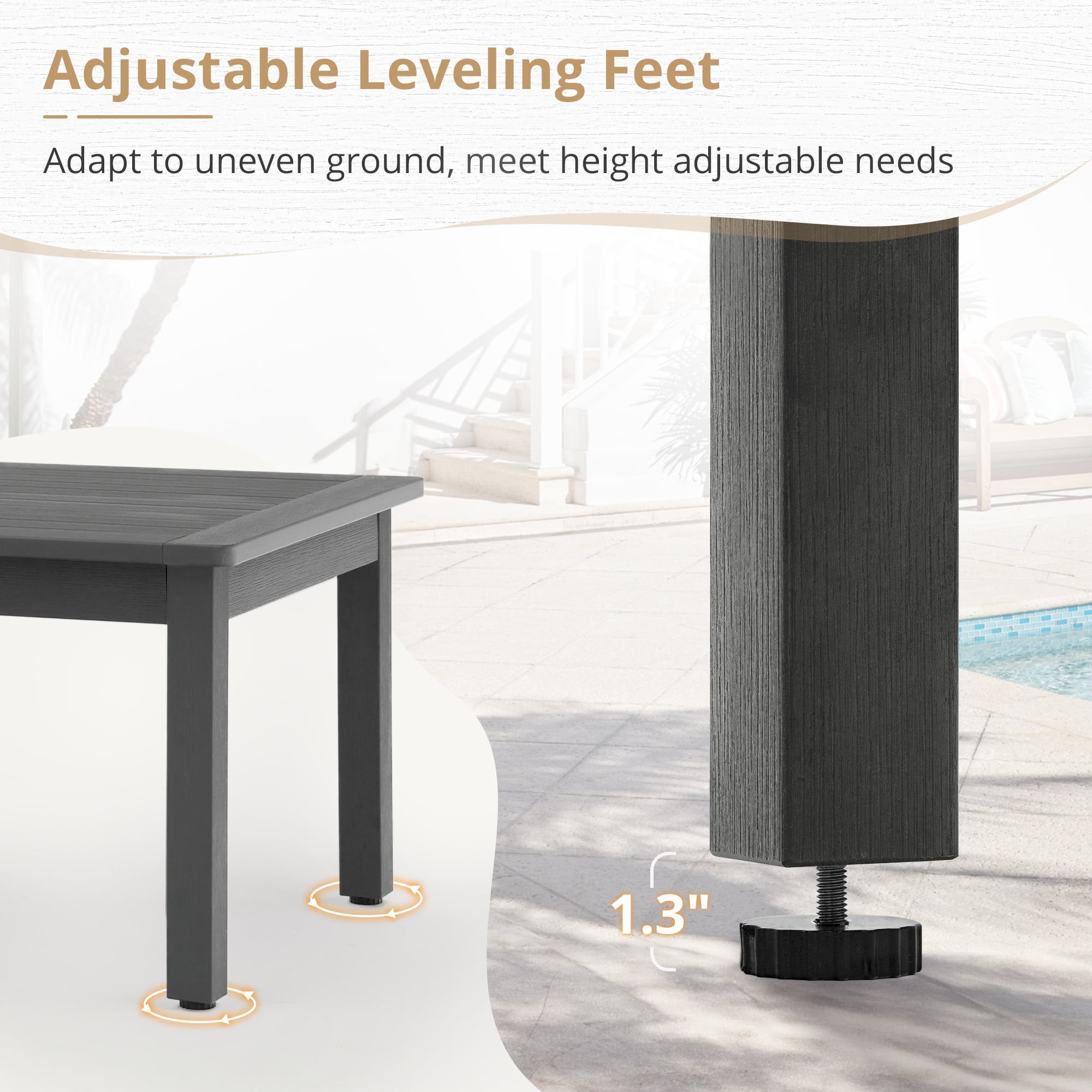 【HDPS Material】: The patio table is crafted from Polystyrene, giving it a natural wood-like appearance with a grainy feel. This plastic material outperforms wood in water resistance, weather resistance, scratch resistance, stain resistance, and durability. 【Durability and Stability】: This outdoor coffee table boasts four rubber 8cm adjustable leveling feet, providing floor protection and suitability for uneven surfaces, while also offering a weight capacity of up to 200 lbs and a stable 90°right angle splicing frame for enhanced stability and safety. 【90% Pre-Assembled】: Our table comes 90% pre-assembled, allowing you to set it up quickly and easily. With only one pre-assembled part and four legs, along with clear written assembly instructions and an accessories bag, the assembly process is simple and accurate. 【Low Maintenance】: The coffee table requires minimal maintenance as it doesn’t need painting, staining, waterproofing, or similar treatments. Cleaning is also easy and can be done with soap, water, a soft-bristle brush, or a sanding sponge. 【Responsive Customer Service】: Dycanpo provides 24/7 customer service to address any questions or concerns promptly.If you receive a package with damaged or missing parts or any other problems, please contact us.