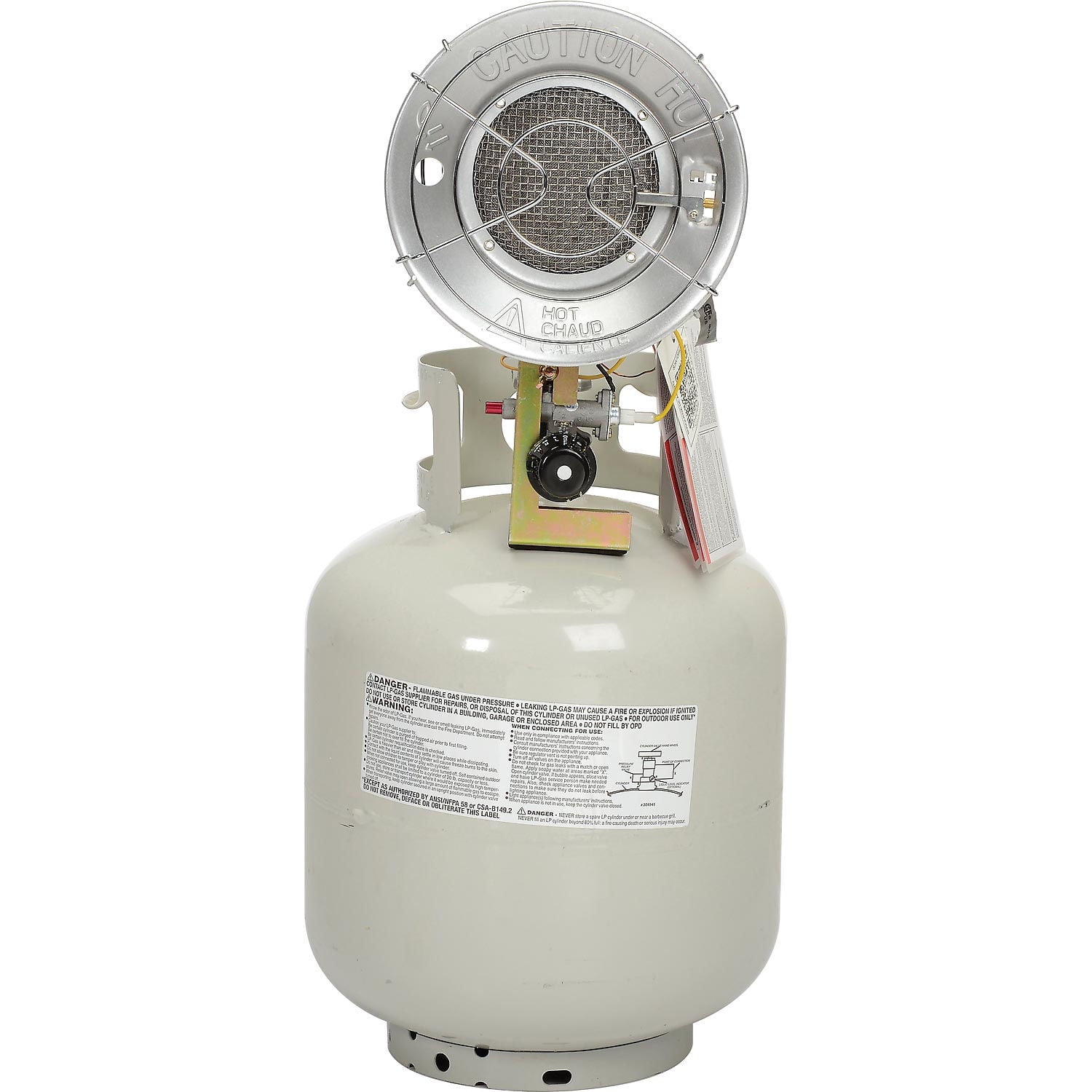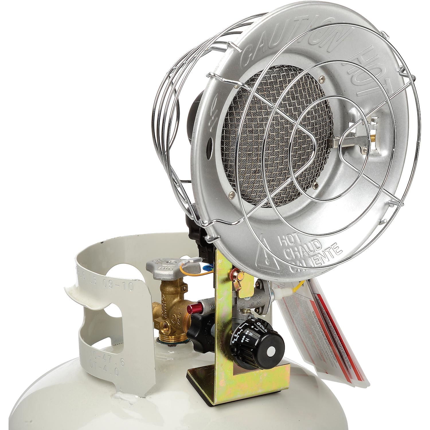 Dyna-Glo TT15CDGP 15,000 BTU Propane (LP) Tank Top Portable Heater – CSA – Tank Not Included: 9,000-15,000 BTUs Heats up to 15′ radius Variable BTUs High-efficiency steel heat reflector Rustproof chrome emitter guard Adjustable heat knob is located in a front central location Dyna-Glo tank top heater offers 3 different heat outputs: low, medium, high Porcelain-coated back with rear safety grill Tip-over safety switch Match light ignition Safety shut-off valve Quick connect P.O.L. tank connection Heater attaches to the valve located at the top of the propane fuel tank Propane tank is not included