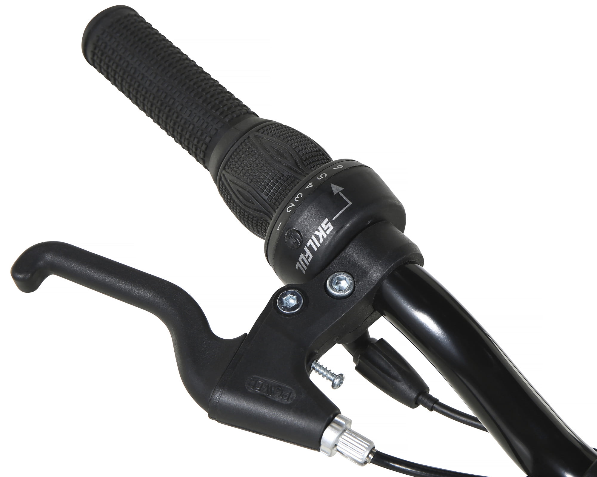 Sturdy Dual Suspension Steel Frame by Dynacraft Deluxe Matte Black Paint Finish with Pink Accents Six-Speed Shimano Rear Derailleur with Grip Shifters Front and Rear Linear Pull Braking System Quick-Adjusting Seat Post to Suit Child’s Growing Needs