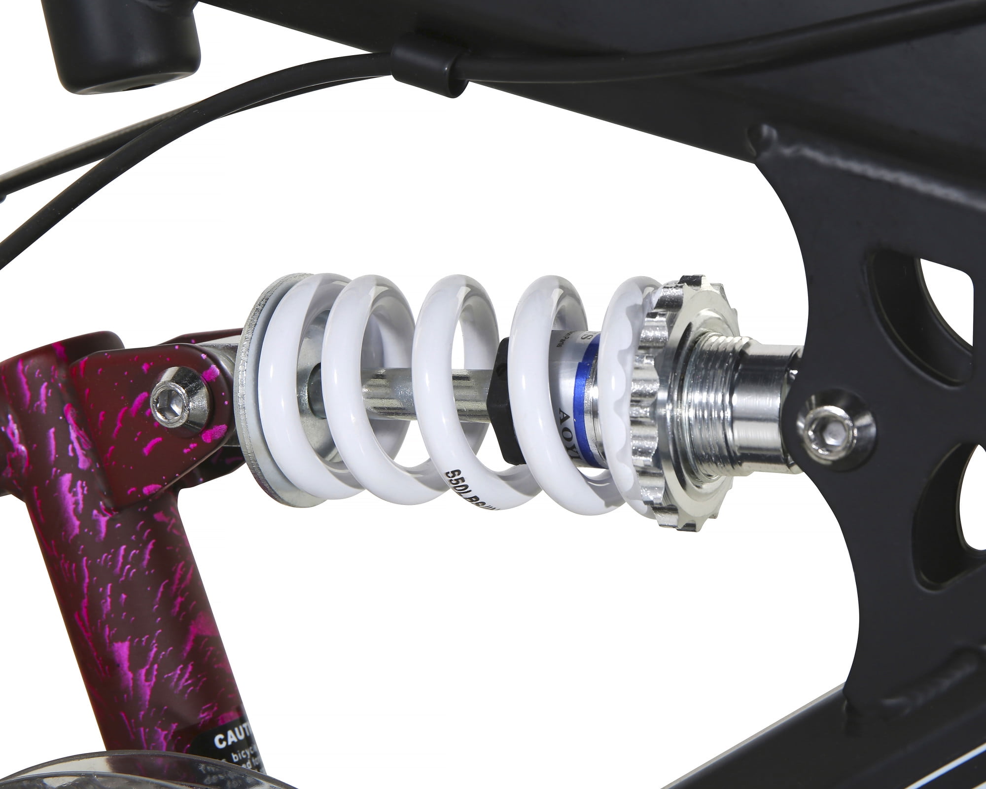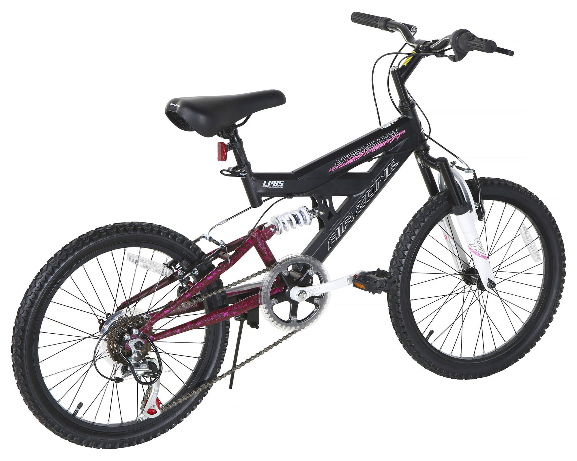 Designed with adventurous young riders in mind, the 20-inch Air Zone Aftershock Dual-Suspension Youth Mountain Bike by Dynacraft features both front and rear suspension, making it perfect for tackling rough terrain. The six-speed grip shift lets riders easily switch gears, while the linear-pull brakes and front cog guard provide peace of mind and excellent control. Plus, with a quick-release seat post and solid steel kickstand, setup is a breeze. The black and pink paint finish adds a stylish touch to this already impressive bike. Get ready for some serious off-road fun with the Air Zone Aftershock!